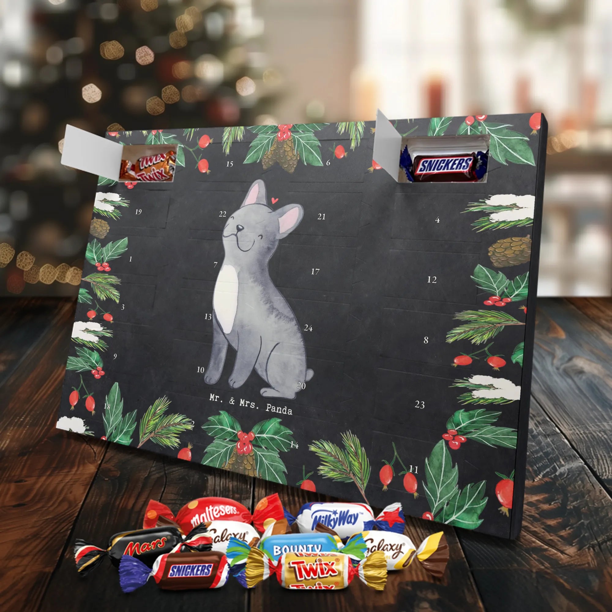 Unser Schoko Adventskalender von Mr. & Mrs. Panda bringt dir und deinen Lieben jede Menge Vorfreude und zauberhafte Momente in die Adventszeit. Der Kalender ist liebevoll bedruckt mit wunderschönen Motiven und frechen Sprüchen im typischen Mr. & Mrs. Panda Stil – ein echter Blickfang auf dem Tisch oder an der Wand. Die brillante Druckqualität kombiniert mit einer seidenmatten Oberflächenveredelung sorgt für edle Farben und ein angenehmes Gefühl beim Anfassen. Auch die Seitenflächen sind bedruckt, sodass der Kalender von allen Seiten hübsch aussieht. Er ist nicht personalisierbar, dafür aber in seiner Gestaltung rundum stimmig. Gefüllt ist der Adventskalender mit 24 hochwertigen Celebrations-Füllungen in acht verschiedenen Sorten: Maltesers, Mars, Snickers, Twix, Milky Way, Bounty, Galaxy und Galaxy Caramel — so ist für jede Naschkatze etwas dabei. Die Besonderheit: Du kannst den Kalender entweder aufstellen oder dank rückseitiger Aufhängung an die Wand hängen. Maße: 325 mm x 225 mm x 27 mm. Ein liebevolles Geschenk für Familie, Freunde oder einfach für dich selbst, das kleine tägliche Glücksmomente schenkt und die Adventszeit versüßt.