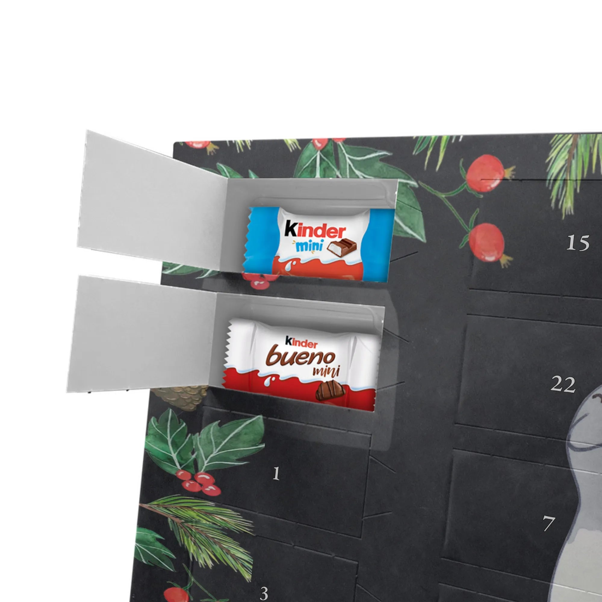 Entdecke unseren liebevoll gestalteten Schoko-Adventskalender von Mr. & Mrs. Panda – eine zauberhafte Idee, um die Tage bis Weihnachten zu versüßen. Der Kalender ist bedruckt mit wunderschönen Motiven & Sprüchen von Mr. & Mrs. Panda und ist nicht personalisierbar. Wir setzen auf brillante Druckqualität mit seidenmatter Oberflächenveredelung und bedruckte Seitenflächen für ein rundum schönes Erscheinungsbild. Maße: 355 mm x 245 mm x 11 mm. Die clevere Bauweise erlaubt es, den Kalender entweder aufzuhängen oder freistehend aufzustellen – so bist du flexibel bei der Dekoration. Gefüllt mit Markenname Schokolade: Adventskalender gefüllt mit kinder® Schokolade. Inhalt: kinder® Schoko-Bons, kinder® Bueno mini und kinder® Schokolade mini. Jeder Tag bringt eine kleine Freude und eignet sich perfekt als Geschenk oder als dekoratives Highlight in deinem Zuhause. Die stabile Verarbeitung sorgt dafür, dass der Kalender die ganze Adventszeit über Freude bereitet. Hol dir diesen Schoko-Adventskalender und lade die Vorweihnachtszeit mit süßen Überraschungen auf!