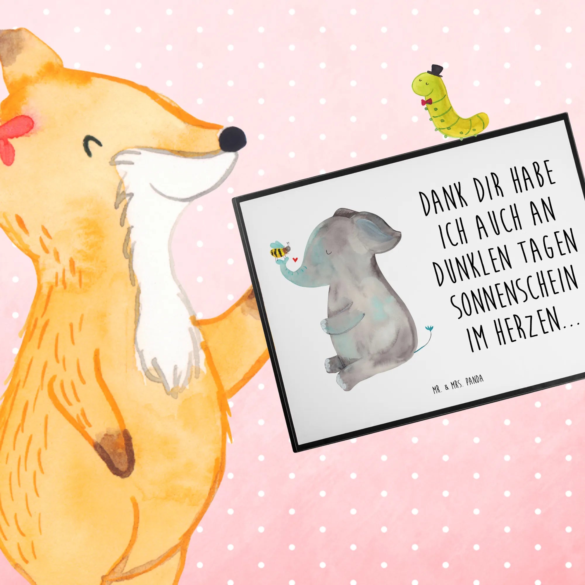 In diesem entzückenden Bild hält ein Elefant achtsam eine Biene auf seinem Rüssel, eine bezaubernde Darstellung der Schönheit in der Liebe zu den kleinsten Kreaturen. Diese Illustration von Mr. & Mrs. Panda ist ein zauberhaftes Liebesgeschenk, das zum Nachdenken anregt und Herzen wärmt. Der Spruch 'Dank dir habe ich auch an dunklen Tagen Sonnenschein im Herzen...' ist eine Liebeserklärung, die sowohl Einzigartigkeit ausstrahlt als auch die universelle Wahrheit vermittelt, dass Liebe die Dunkelheit vertreiben kann. Ideal als Liebesbeweis, Jahrestagsgeschenk oder einfach, um jeden Tag eine Dosis Liebe zu verteilen.