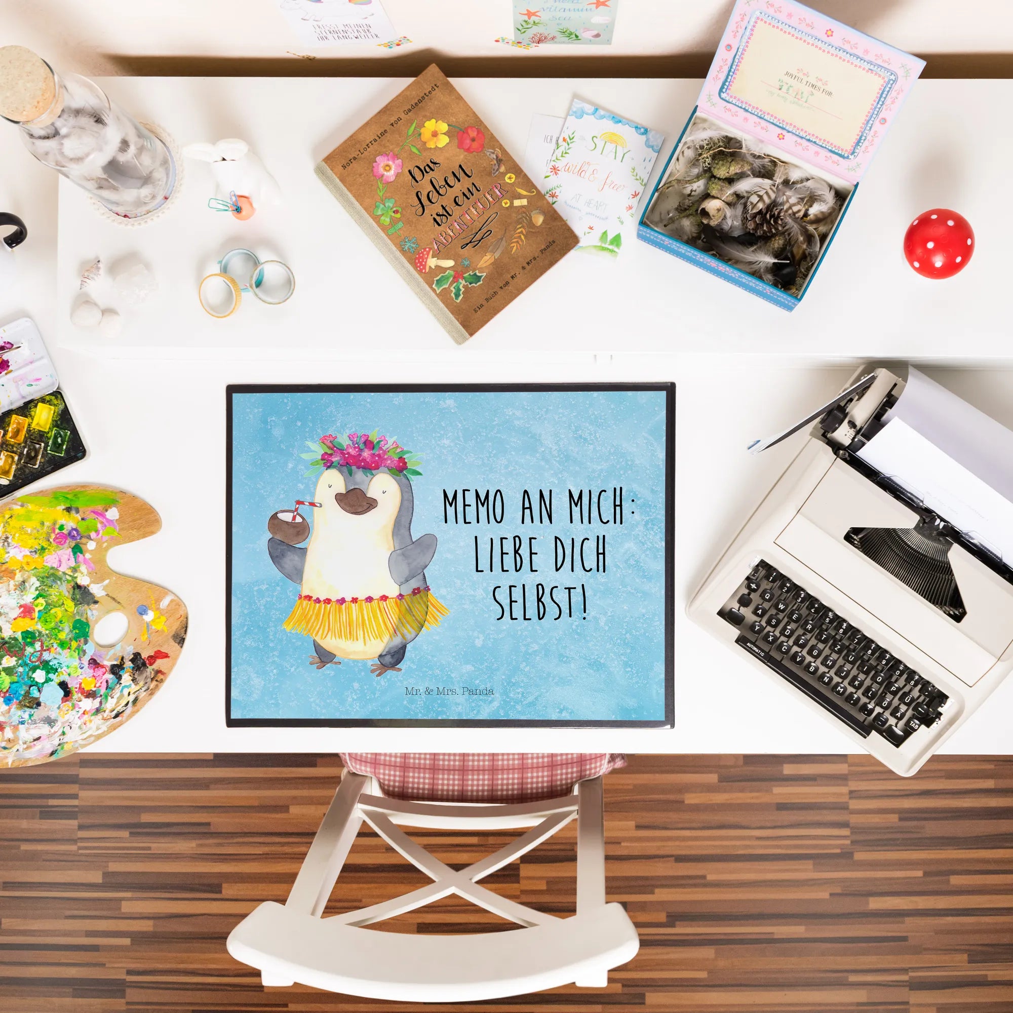 Egal, ob zur eigenen Freude oder als liebevolles Geschenk für Freunde und Familie – mit der Schreibtischunterlage Pinguin Kokosnuss schenkst du Freude und einen Hauch von Urlaub, ganz nach dem Motto: "Memo an mich: Liebe dich selbst!"