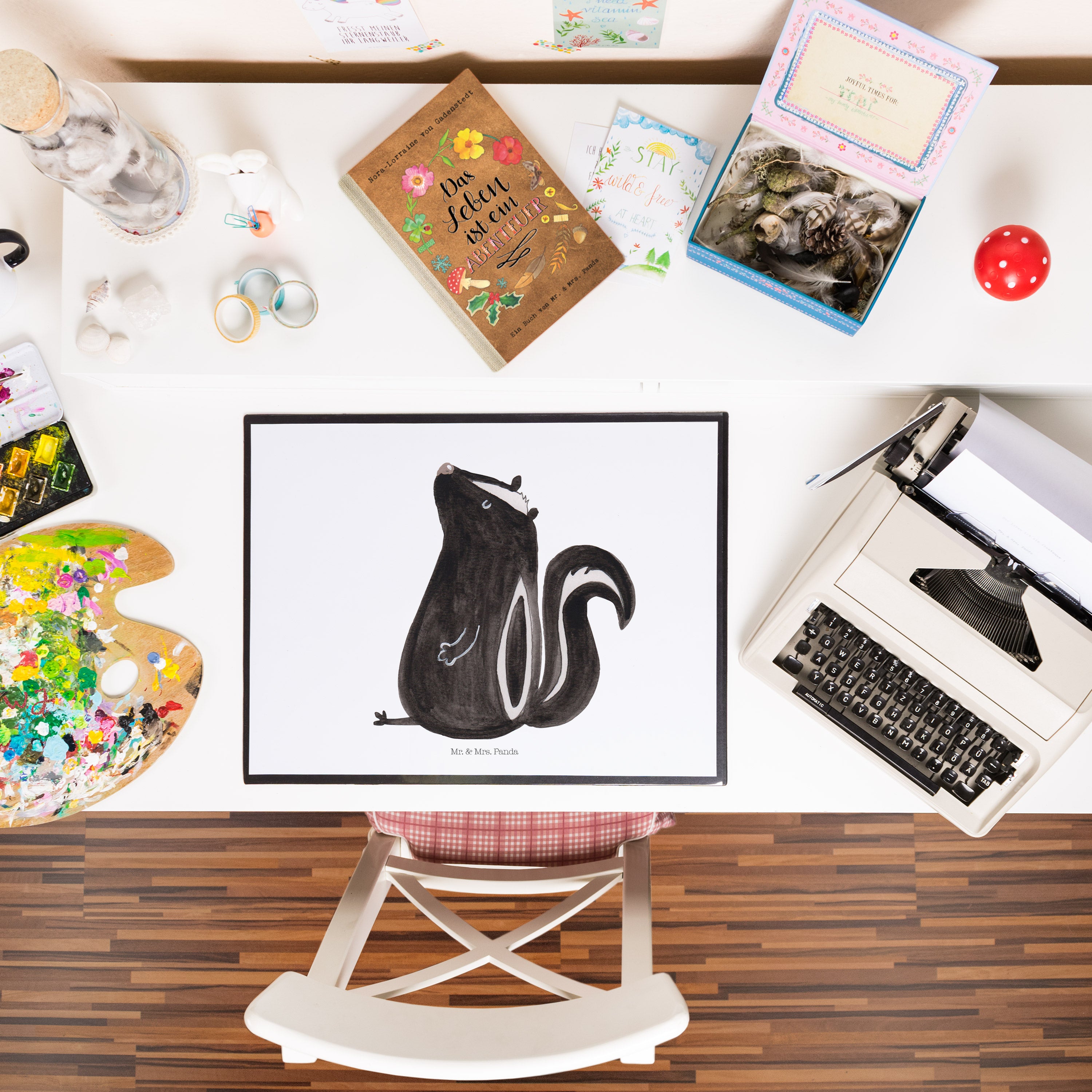 Erlebe mit der Stinktier-Kollektion von Mr. & Mrs. Panda ein Stück lebendige Erinnerung. Jedes Design, liebevoll handgezeichnet von Mrs. Panda, erzählt eine Geschichte von Herrn Blume – dem treuen Stinktier, das nicht nur durch seine Persönlichkeit, sondern auch durch seine besonderen Momente mit Mrs. Panda in Erinnerung bleibt. Diese Kollektion ist eine Hommage an die Zeiten des Lachens, der Ruhe und des einfachen Beisammenseins. Ob als Dekoration für dein Zuhause oder als Geschenk für einen lieben Menschen, jedes Stück bringt Wärme und Freude in den Alltag. Lass dich von dieser Kollektion inspirieren, den Charme und die Leichtigkeit in deinem Leben zu umarmen – dank der zauberhaften Motive und Sprüche, die auf vielfältige Produkte gedruckt werden.