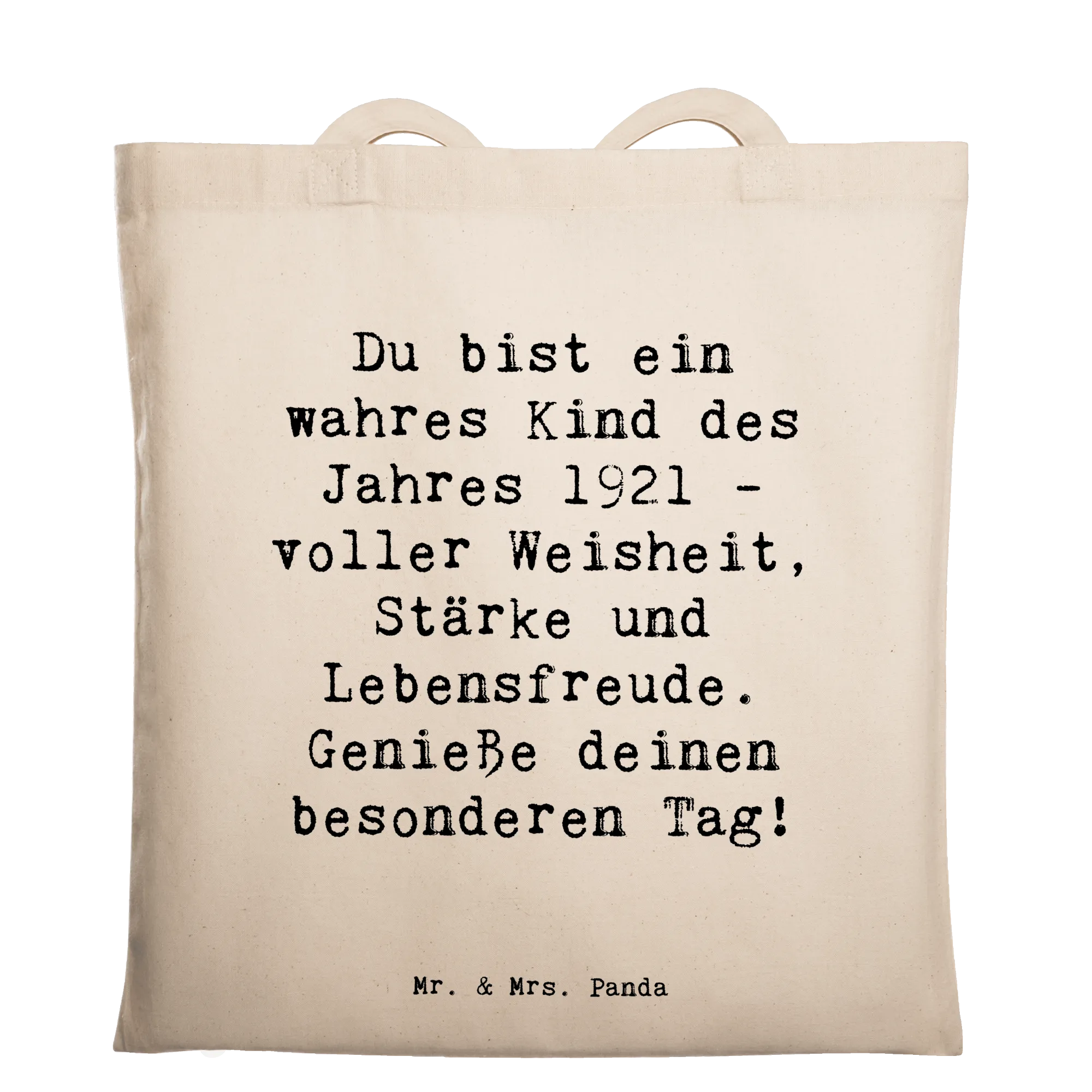 Suchst Du ein liebevolles und praktisches Geschenk? Unsere Tragetasche „1921 Geburtstag" aus der Geburtstags Geburtsjahr-Kollektion von Mr. & Mrs. Panda ist genau das: eine stilvolle, alltagstaugliche Tasche mit Herz. Der warme Spruch „Du bist ein wahres Kind des Jahres 1921 - voller Weisheit, Stärke und Lebensfreude. Genieße deinen besonderen Tag!" macht sie zu einer besonderen Aufmerksamkeit für Geburtstagsfeiern oder runde Jubiläen.