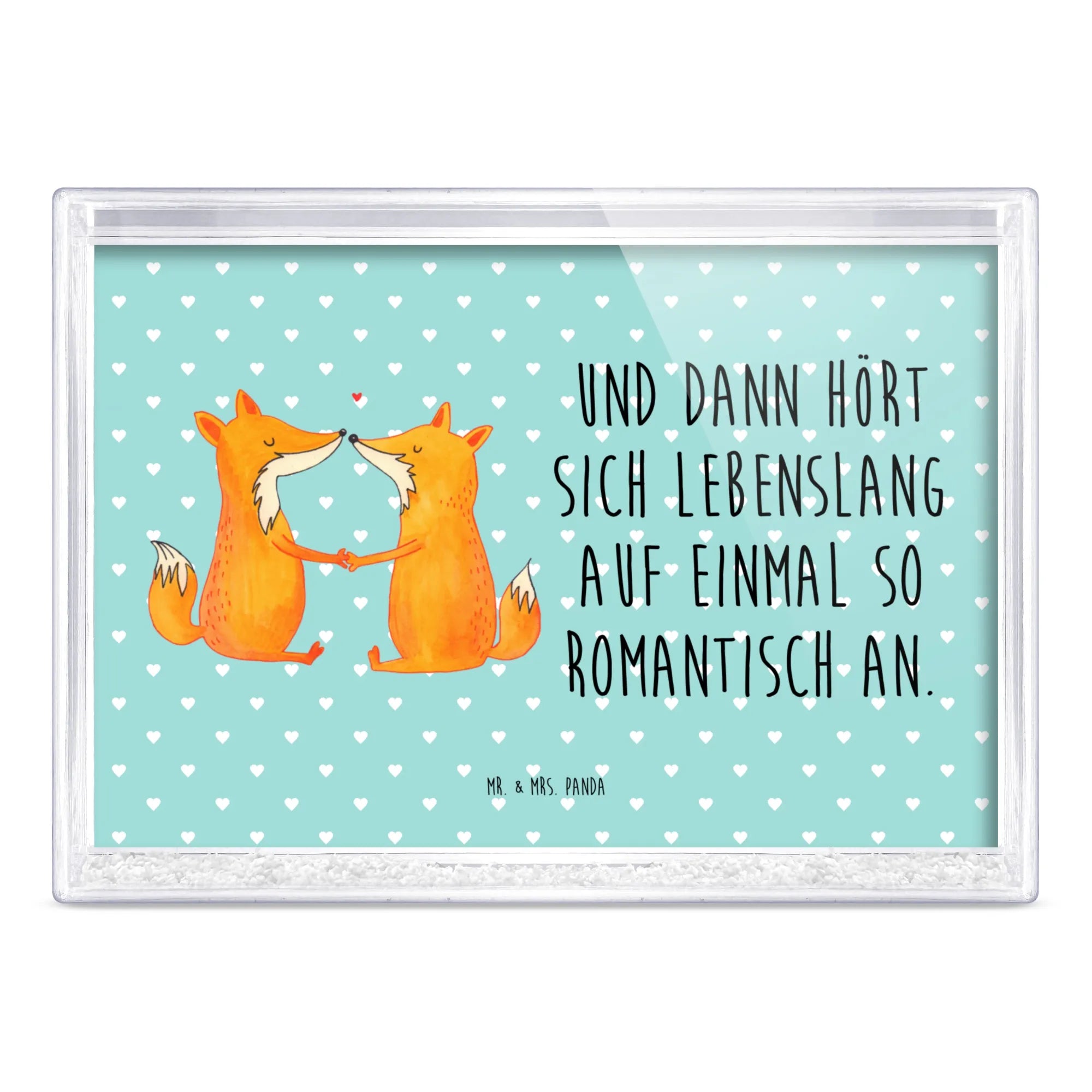 Ein liebevolles Motiv für Verliebte: Zwei Füchse sitzen einander gegenüber, halten Händchen und strahlen pure Zweisamkeit aus. Es ist ein Bild für Paare, die gern ihre Verbundenheit zeigen, ohne große Worte. Dieses Motiv fängt den Moment ein, in dem zwei Herzen sich finden und einfach nur beisammen sein wollen. Ideal für Dekorationen bei gemeinsamen Abenden, als Geschenk zum Jahrestag oder einfach als kleine Erinnerung an das gemeinsame Glück. Die Illustrationssprache ist weich und herzlich – so wie eine Umarmung in Zeichnungform. Mr. & Mrs. Panda haben bei diesem Motiv darauf geachtet, liebevolle Details einzubauen, die daran erinnern, wie schön es ist, jemanden an der Seite zu haben. Es eignet sich wunderbar als Präsent für ein Liebespaar oder als Überraschung für Verlobte, die ihre Vorfreude auf das gemeinsame Leben feiern möchten. Ein kleiner, täglicher Glücksbringer, der Wärme und Nähe in jedes Zuhause bringt und daran erinnert, wie wertvoll die gemeinsamen Augenblicke sind.