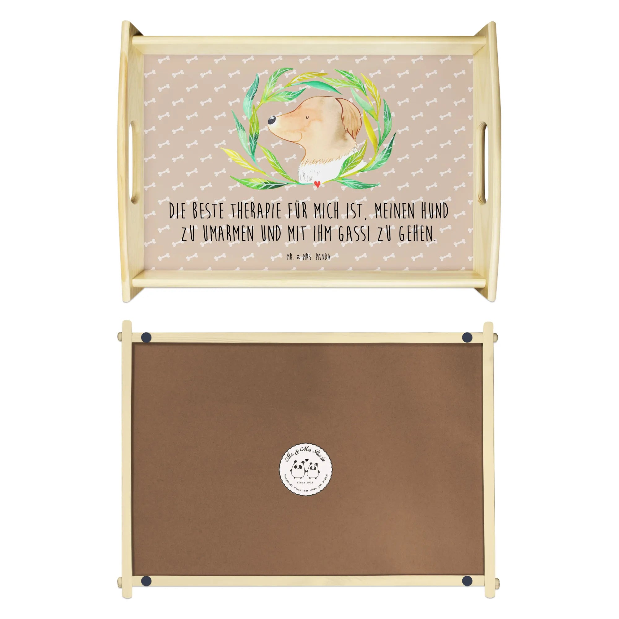 Das einzigartige Serviertablett von Mr. & Mrs. Panda wird dein Frühstücksbuffet zum Erlebnis machen! Mit seinen großzügigen Maßen von 480 mm x 480 mm x 65 mm und einem Gewicht von 925 g ist es die perfekte Kombination aus Funktionalität und Stil. Aus hochwertigem, lasiertem Echtholz gefertigt, verzückt das Tablett mit einem strahlenden Druck, der für gute Laune sorgt. Ob im Bett oder auf dem Sofa, die seitlichen Griffmulden garantieren ein angenehmes Handling. Die spezielle Anti-Rutsch Beschichtung sorgt dafür, dass alles sicher an seinem Platz bleibt. Dank der kratzfesten Oberfläche ist das Tablett sehr pflegeleicht – einfach mit einem feuchten Tuch und etwas Spülmittel abwischen. Bitte nicht einweichen! Denke daran, dass die Anfertigung wegen der hohen Qualität etwas Zeit in Anspruch nimmt.