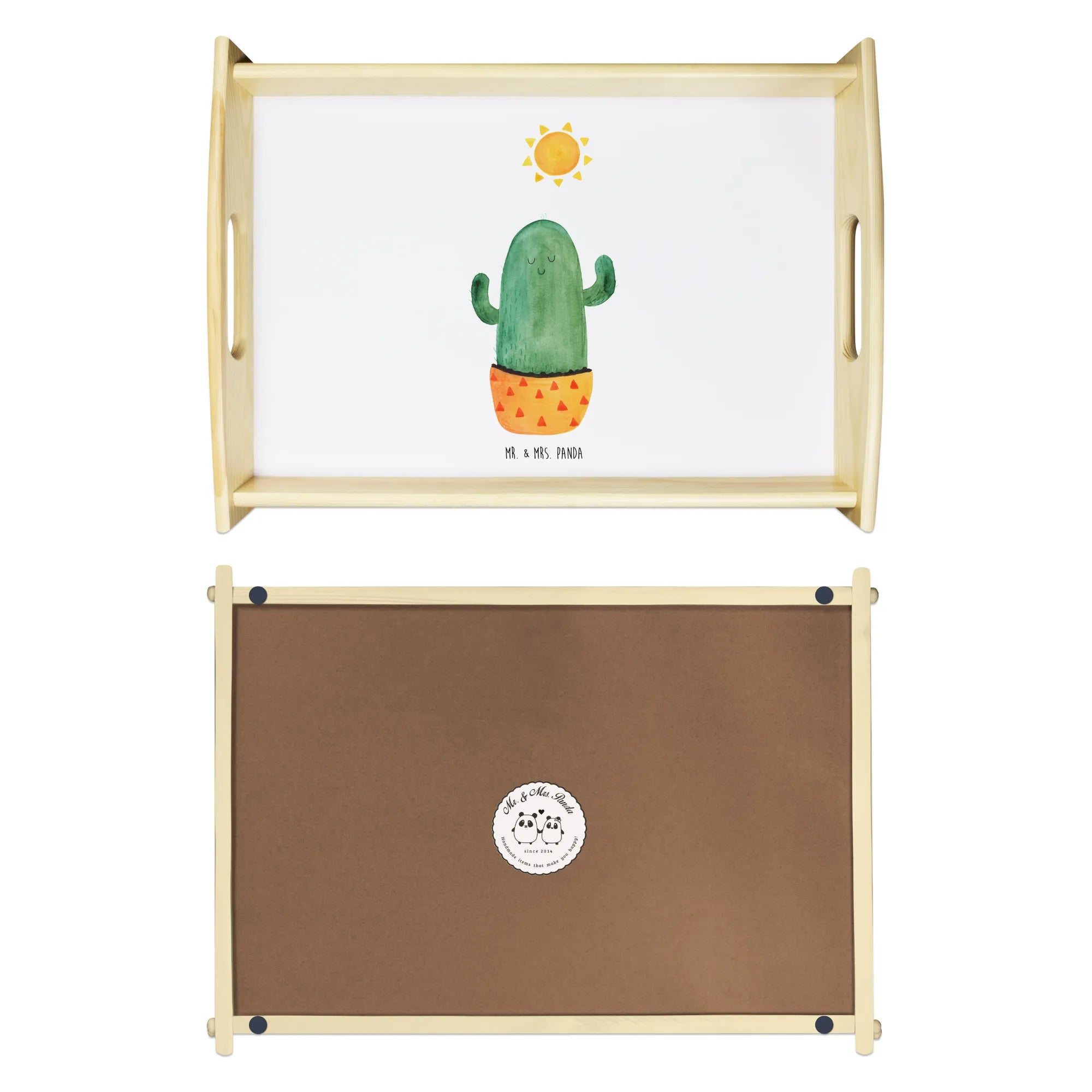 Verwöhne Deine Liebsten mit unserem bezaubernden Serviertablett von Mr. & Mrs. Panda! Mit den Maßen von 480 mm x 480 mm x 65 mm und einem gewicht von 925 g ist es nicht nur hübsch, sondern auch praktisch. Aus lasiertem Echtholz gefertigt, begeistert es mit einem lebendigen Druck, der gute Stimmung verbreitet. Egal ob beim Frühstück im Bett oder beim gemütlichen Abendessen auf dem Sofa – die seitlichen Griffmulden ermöglichen ein einfaches Tragen. Die Anti-Rutsch Pads auf der Unterseite sorgen dafür, dass alles sicher an seinem Platz bleibt. Dank der kratzfesten Oberfläche bleibt dein Tablett nach jeder Benutzung in bestem Zustand – einfach mit einem feuchten Tuch und Spülmittel abwischen, aber nicht einweichen! Beachte bitte die längere Anfertigungszeit aufgrund der besonderen Verarbeitung.