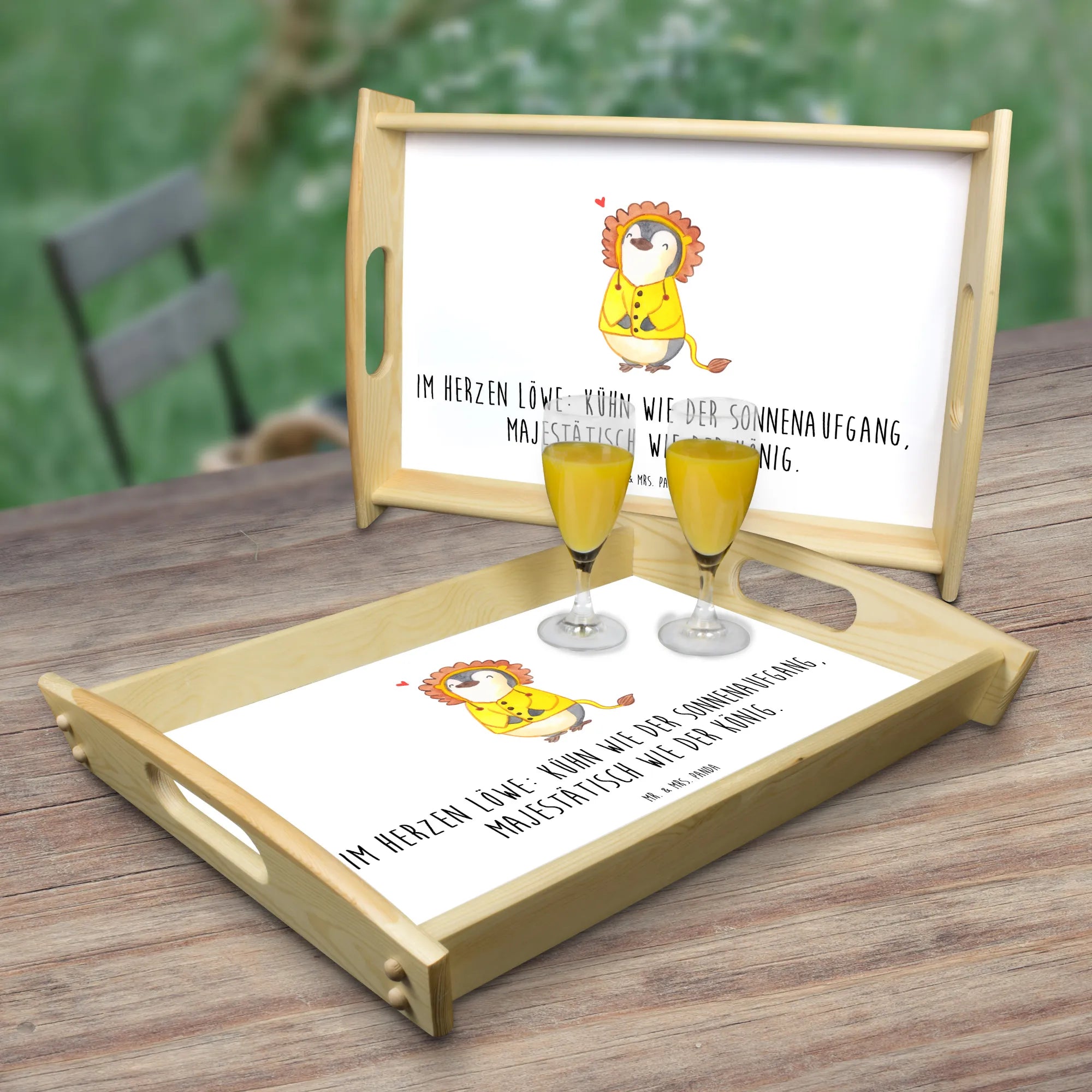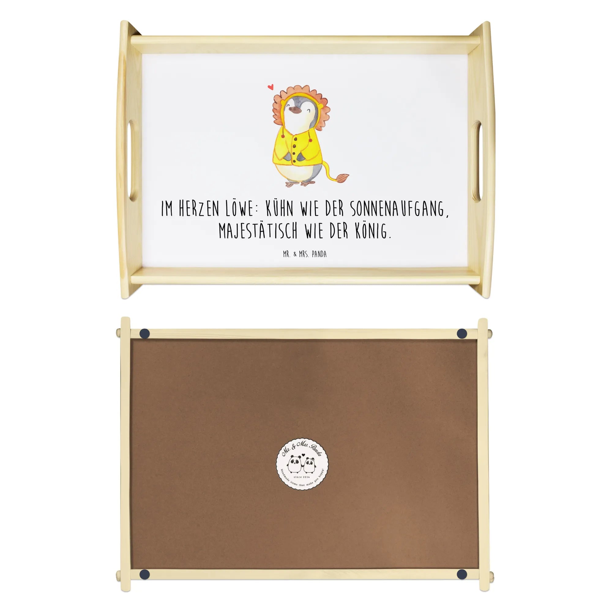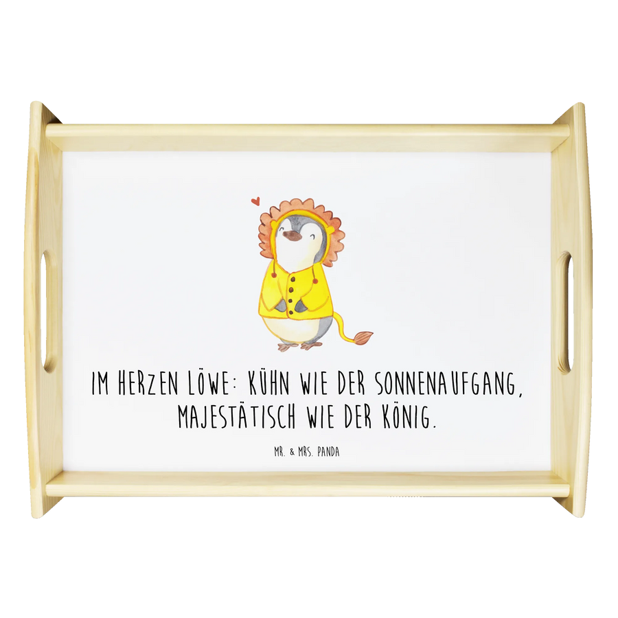 Verwöhne Deine Liebsten mit unserem bezaubernden Serviertablett von Mr. & Mrs. Panda! Mit den Maßen von 480 mm x 480 mm x 65 mm und einem gewicht von 925 g ist es nicht nur hübsch, sondern auch praktisch. Aus lasiertem Echtholz gefertigt, begeistert es mit einem lebendigen Druck, der gute Stimmung verbreitet. Egal ob beim Frühstück im Bett oder beim gemütlichen Abendessen auf dem Sofa – die seitlichen Griffmulden ermöglichen ein einfaches Tragen. Die Anti-Rutsch Pads auf der Unterseite sorgen dafür, dass alles sicher an seinem Platz bleibt. Dank der kratzfesten Oberfläche bleibt dein Tablett nach jeder Benutzung in bestem Zustand – einfach mit einem feuchten Tuch und Spülmittel abwischen, aber nicht einweichen! Beachte bitte die längere Anfertigungszeit aufgrund der besonderen Verarbeitung.