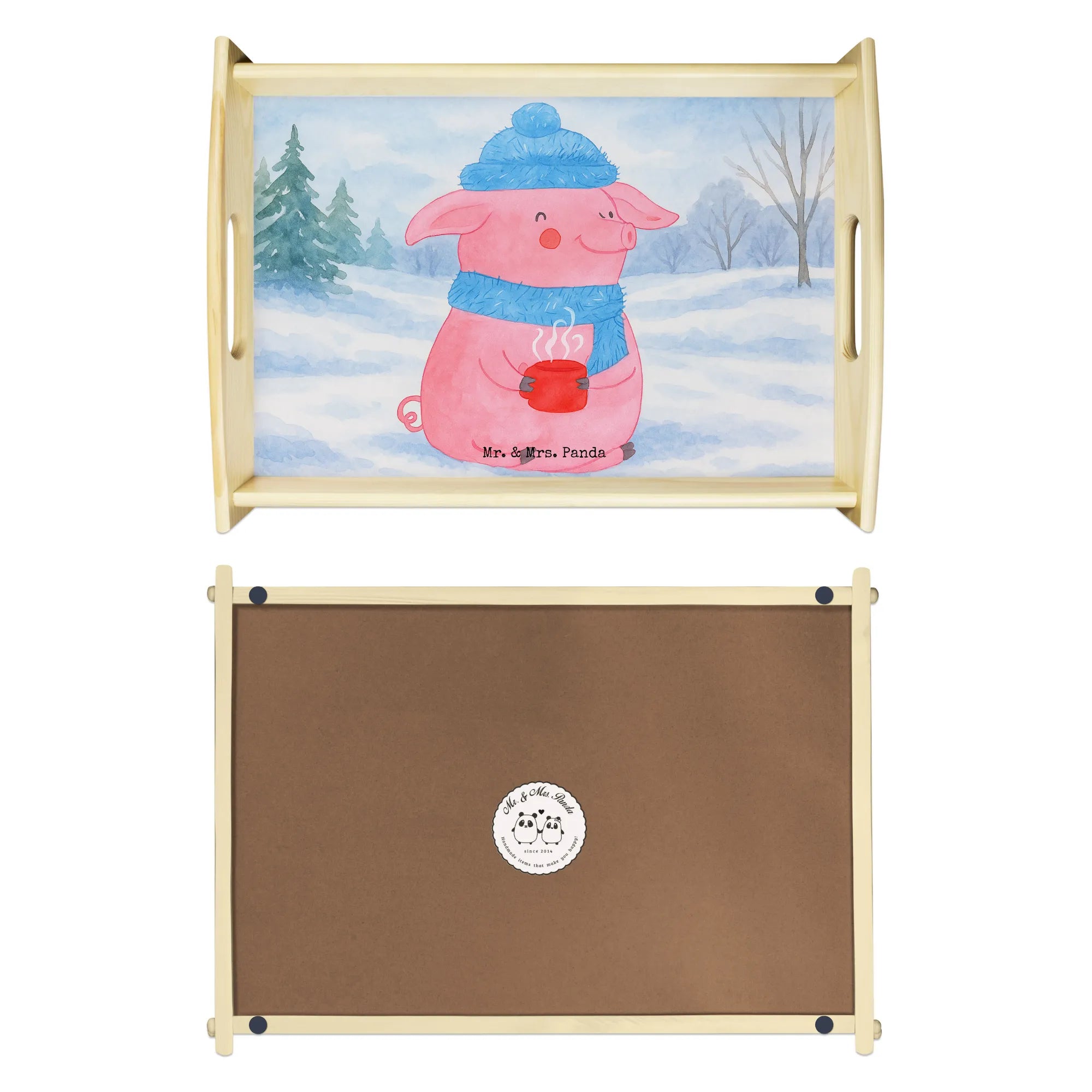 Das einzigartige Serviertablett von Mr. & Mrs. Panda wird dein Frühstücksbuffet zum Erlebnis machen! Mit seinen großzügigen Maßen von 480 mm x 480 mm x 65 mm und einem Gewicht von 925 g ist es die perfekte Kombination aus Funktionalität und Stil. Aus hochwertigem, lasiertem Echtholz gefertigt, verzückt das Tablett mit einem strahlenden Druck, der für gute Laune sorgt. Ob im Bett oder auf dem Sofa, die seitlichen Griffmulden garantieren ein angenehmes Handling. Die spezielle Anti-Rutsch Beschichtung sorgt dafür, dass alles sicher an seinem Platz bleibt. Dank der kratzfesten Oberfläche ist das Tablett sehr pflegeleicht – einfach mit einem feuchten Tuch und etwas Spülmittel abwischen. Bitte nicht einweichen! Denke daran, dass die Anfertigung wegen der hohen Qualität etwas Zeit in Anspruch nimmt.