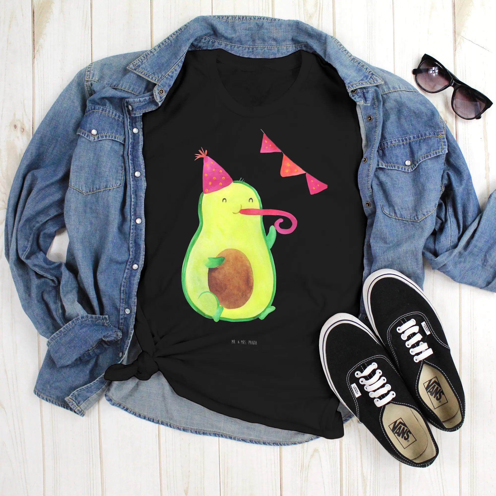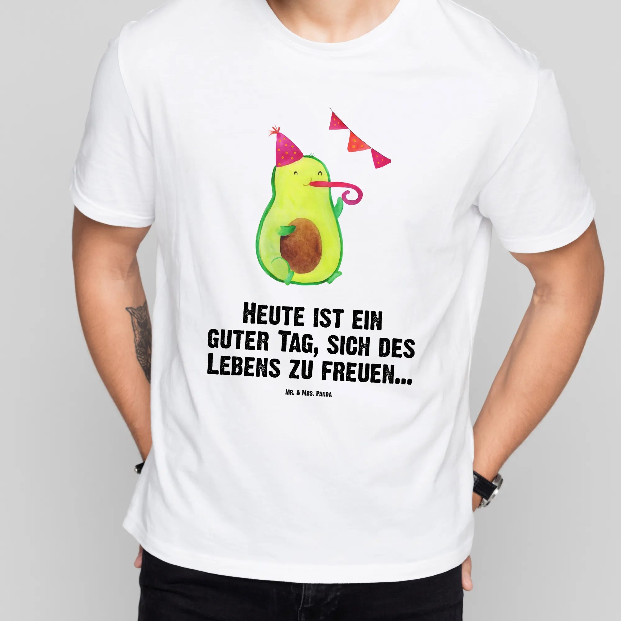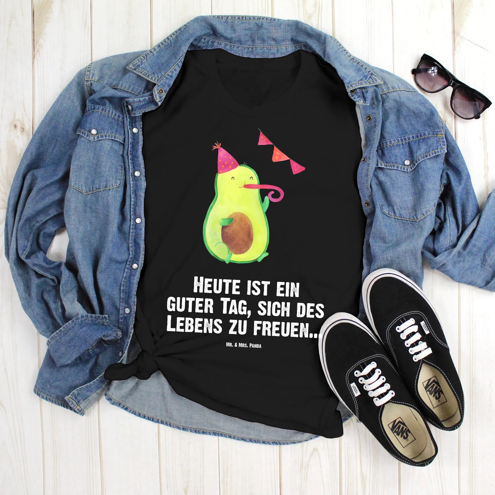 Hey Du! Suchst Du ein Geschenk mit Herz, Humor und guter Laune? Unser Größe L T-Shirt „Avocado Party" aus der Avocado Kollektion von Mr. & Mrs. Panda ist genau das Richtige. Die niedliche, handgezeichnete Avocado trägt einen Partyhut, pustet in eine Partypfeife und begleitet den fröhlichen Spruch „Heute ist ein guter Tag, sich des Lebens zu freuen...“ – ein echter Stimmungsmacher.