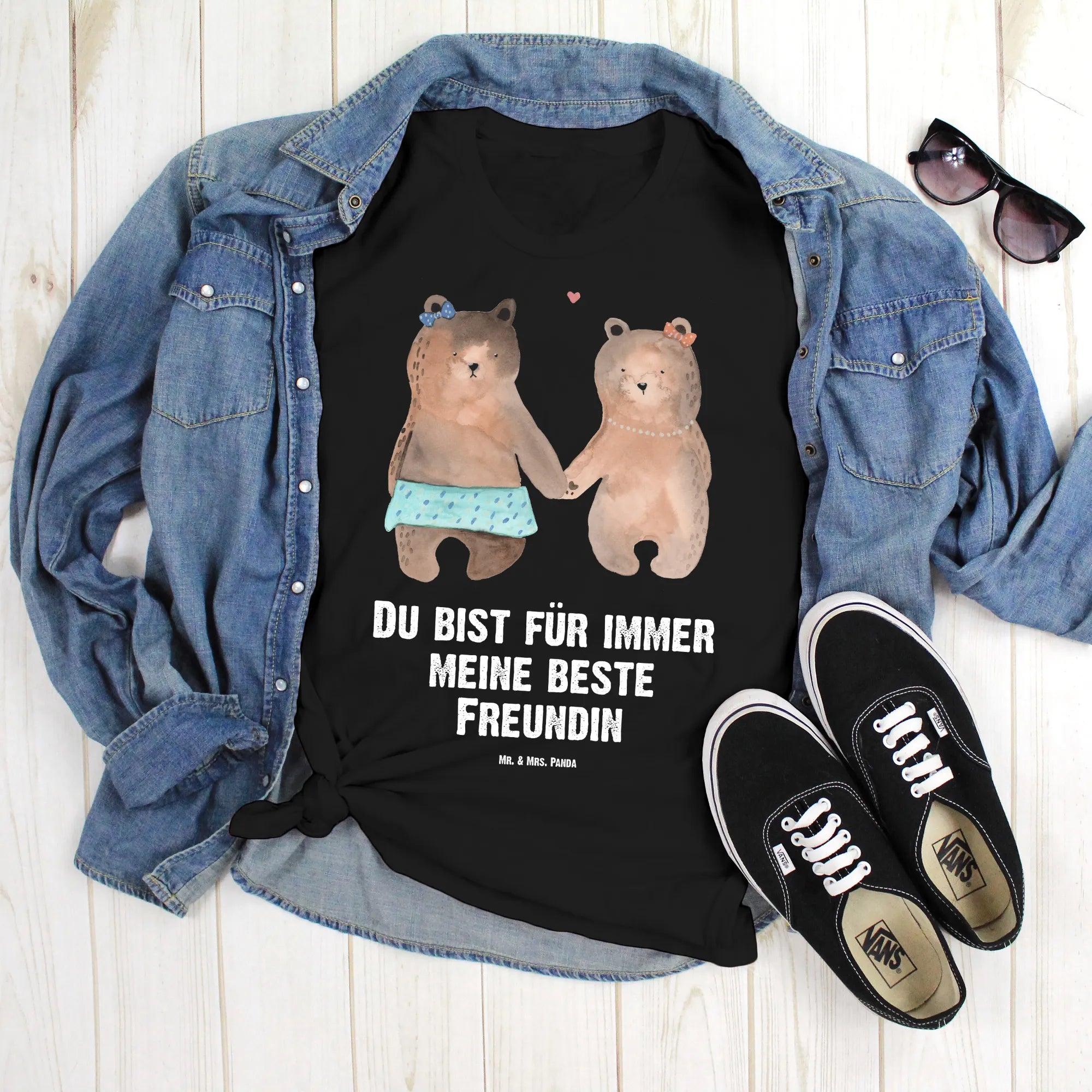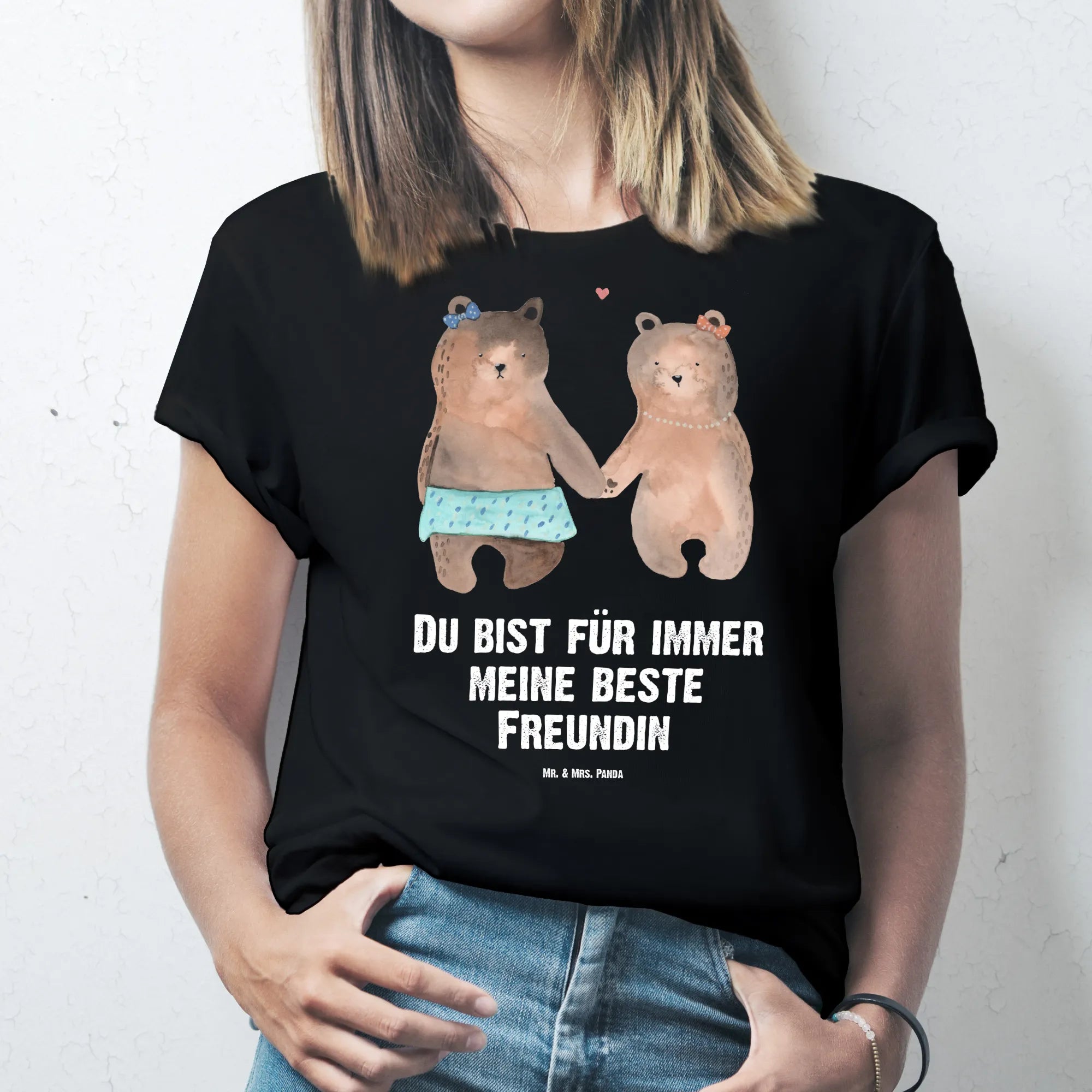 Unser Größe L T-Shirt mit dem zauberhaften Motiv „Bär Freundin“ aus der Bär-Kollektion von Mr. & Mrs. Panda ist ein liebevoller Ausdruck von Freundschaft. Auf dem schwarzen Shirt halten sich zwei süße Bärenmädchen an den Händen – ergänzt durch den herzlichen Spruch „Du bist für immer meine beste Freundin“. Ein echter Hingucker für Geburtstag, Jubiläum, Party oder Junggesellenabschied.