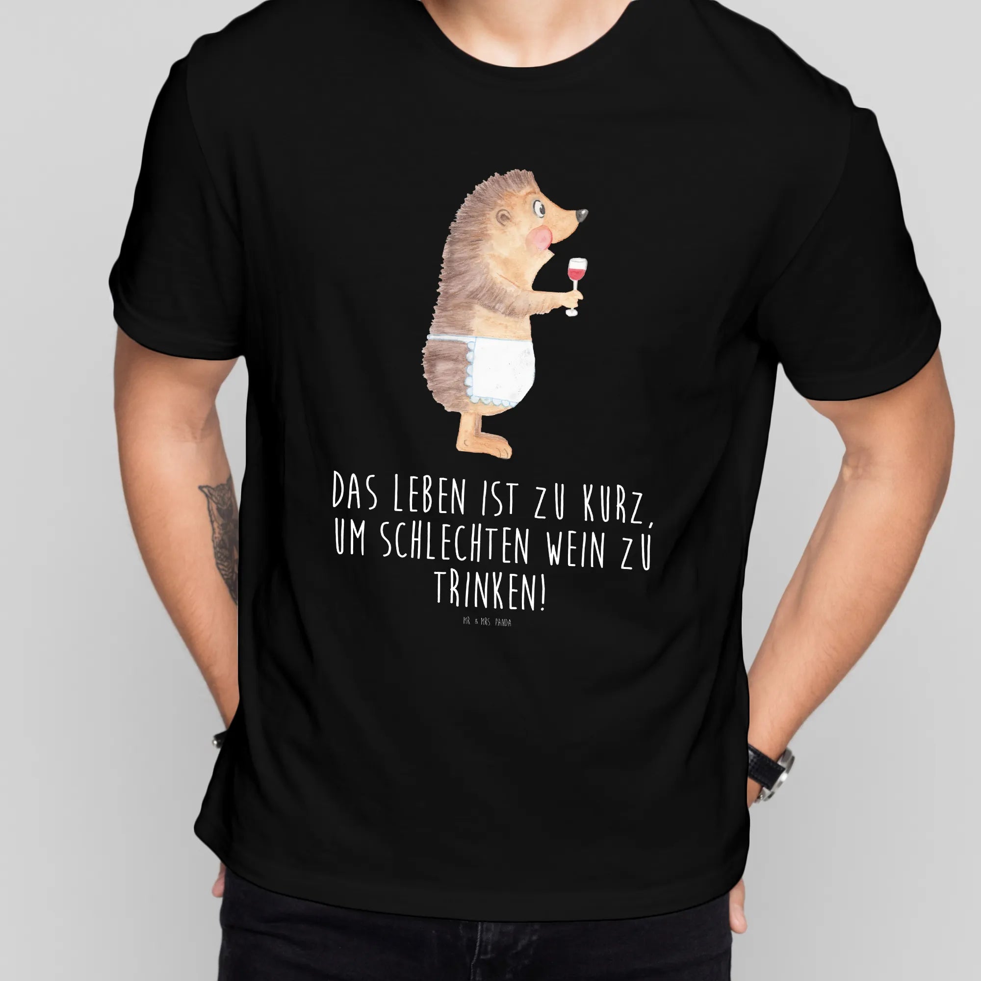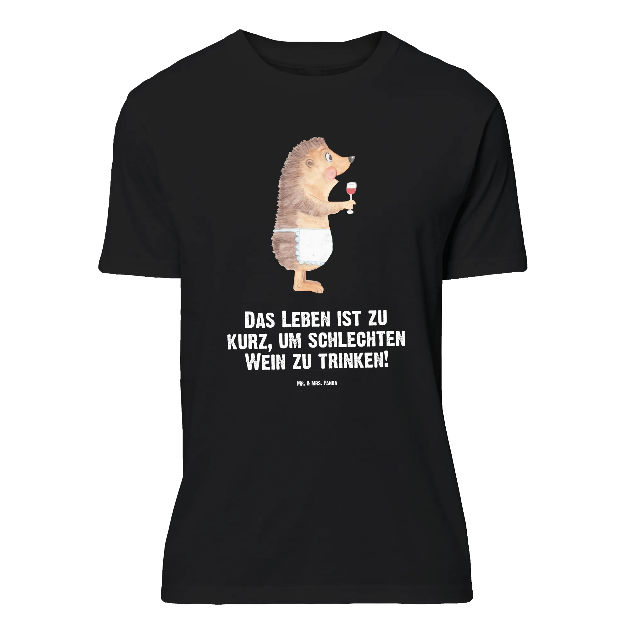 Dieses schwarze T-Shirt aus der Small World Kollektion von Mr. & Mrs. Panda zeigt einen herzallerliebsten Igel, der genüsslich aus einem Rotweinglas schlürft. Der freche Spruch „Das Leben ist zu kurz, um schlechten Wein zu trinken!” rundet das Motiv perfekt ab und macht das Shirt zum ultimativen Geschenk für Weinliebhaber und Freunde humorvoller Tiermotive.