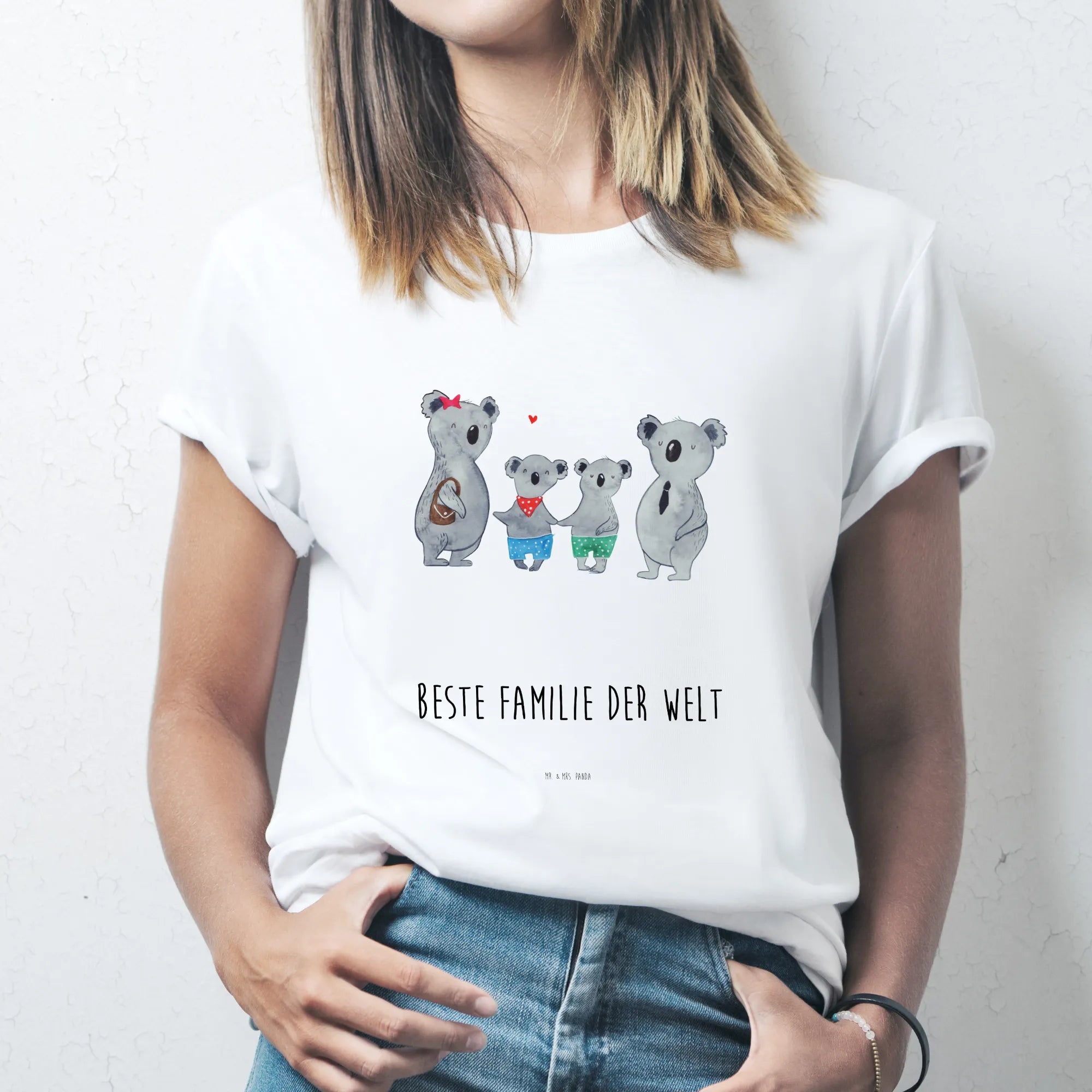 Du suchst ein liebevolles Geschenk für die Familie? Unser weißes T-Shirt Größe L mit dem Motiv „Koala Familie zwei“ aus der Familien-Kollektion ist eine herzerwärmende Wahl. Die vier Koalas — Mama mit rotem Stern, Papa im Anzug und zwei Kinder mit bunten Shorts — strahlen Wärme, Zusammenhalt und Fröhlichkeit aus.