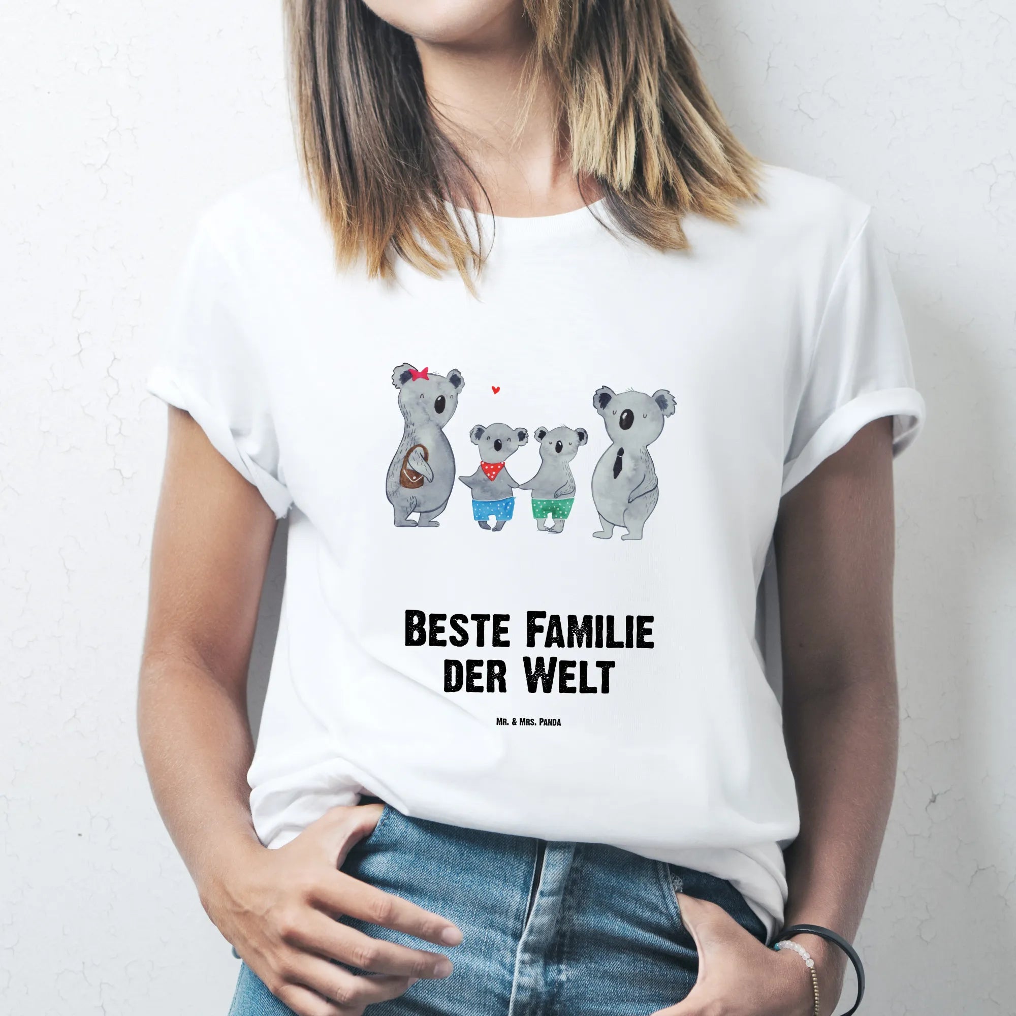 Auf dem Motiv siehst du eine liebevoll gezeichnete Koalafamilie: Mama mit rotem Sternchen, Papa im Anzug und zwei fröhliche Kinderkoalas. Der fröhliche Spruch „Beste Familie der Welt“ macht das Motiv perfekt für alle, die Familienzeit und Zusammenhalt lieben. 🐨💖