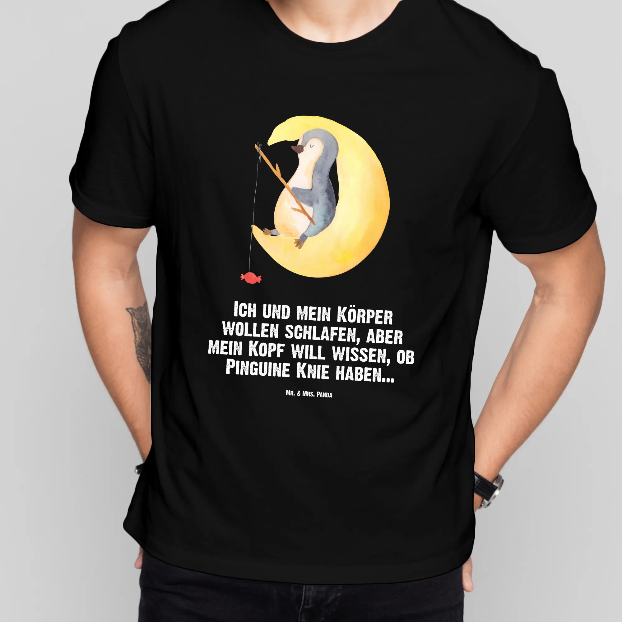 Suchst du ein T-Shirt, das bequem ist und gleichzeitig Herz und Humor trifft? Unser Größe M T-Shirt mit dem süßen Pinguin auf der Mondsichel ist ein echter Hingucker. Das handgezeichnete Motiv zeigt einen gemütlichen Pinguin, der mit einer Angel nach Sternen fischt – an der Angel hängt ein Bonbon. Der lustige Spruch „Ich und mein Körper wollen schlafen, aber mein Kopf will wissen, ob Pinguine Knie haben...“ macht das Shirt zum perfekten Begleiter für Nachtschwärmer und Grübler.