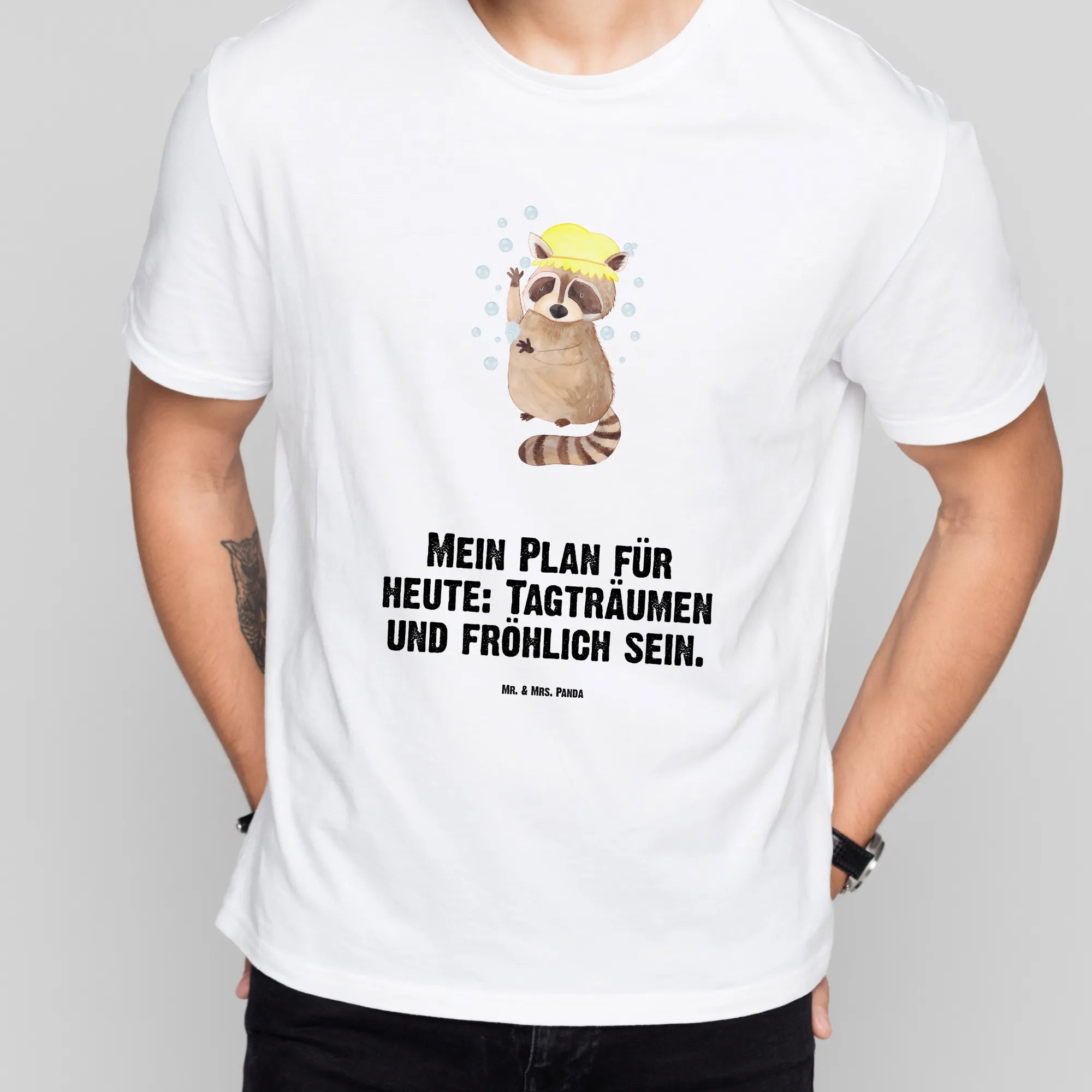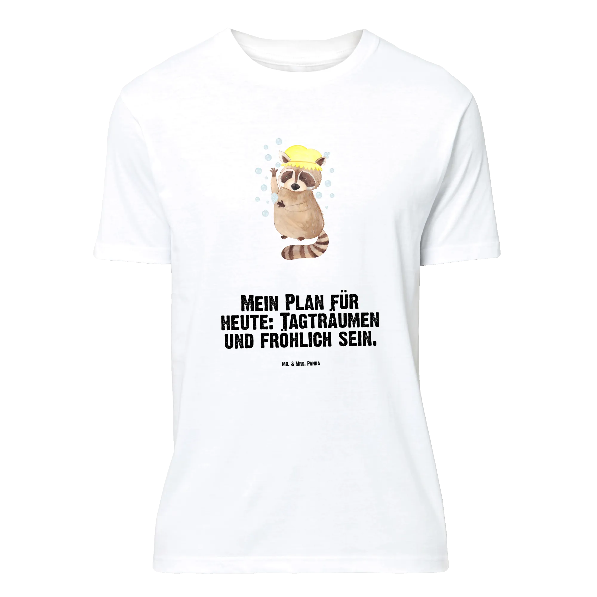 Der freche Waschbär steht vergnügt unter der Dusche, Seifenblasen tanzen um ihn herum und der Spruch „Mein Plan für heute: Tagträumen und fröhlich sein.“ macht das Motiv zur perfekten Gute-Laune-Botschaft. Dieses T-Shirt eignet sich wunderbar als Geschenk für Geburtstag, Jubiläum oder als witziges Mitbringsel beim Junggesellenabschied.