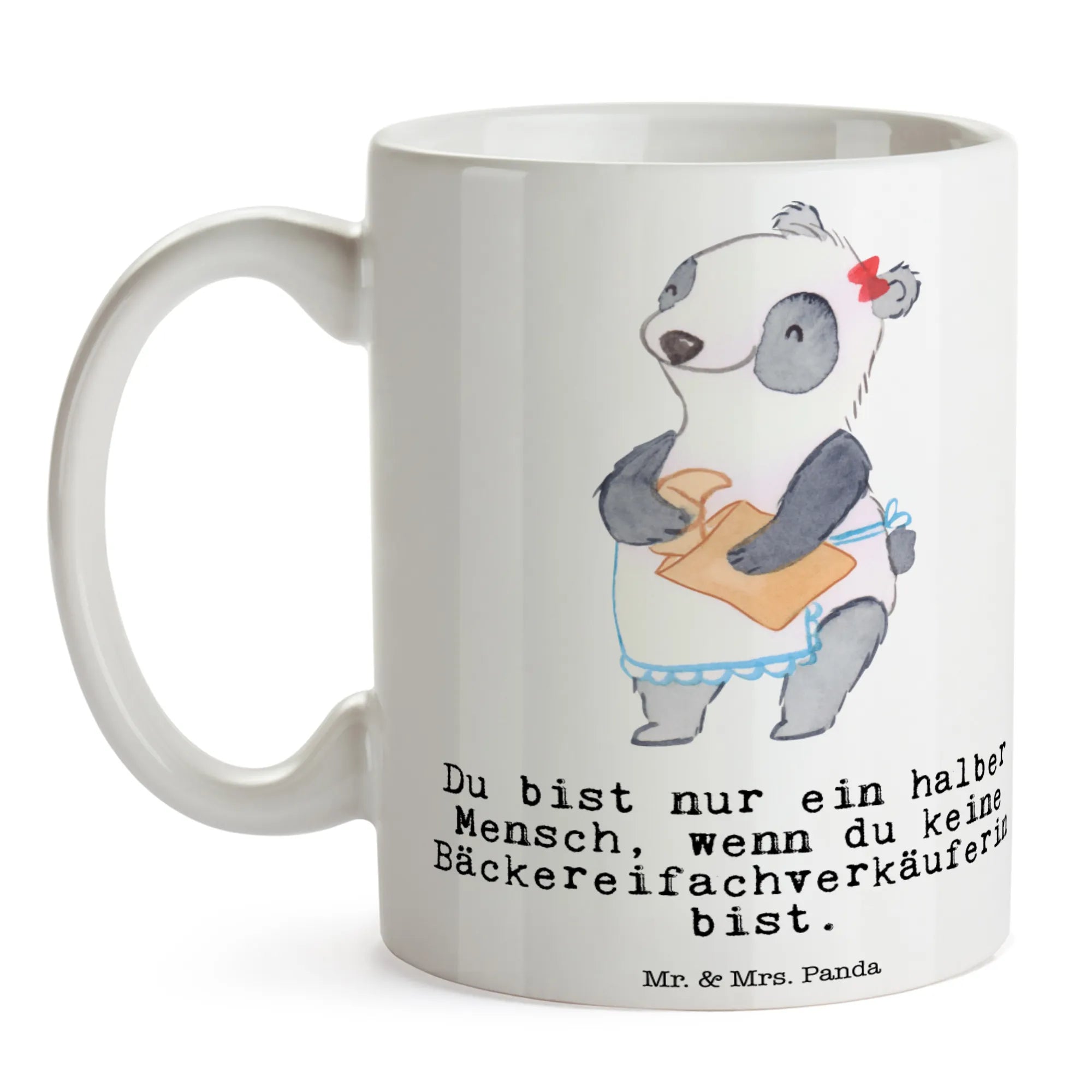 Entdecke die bezaubernde Tasse "Bäckereifachverkäuferin mit Herz" aus der einzigartigen Berufe-Kollektion von Mr. & Mrs. Panda. Diese liebevoll gestaltete Keramiktasse ist das perfekte Geschenk für alle, die in der Bäckerei oder im Backwarenverkauf tätig sind. Sie besticht durch ihr handgemaltes Motiv, das eine süße Bäckereifachverkäuferin zeigt, die mit viel Liebe zum Detail ein frisches Croissant in eine Tüte packt. Jede Tasse wird mit dem Spruch "Du bist nur ein halber Mensch, wenn du keine Bäckereifachverkäuferin bist" verziert, der garantiert für ein Schmunzeln sorgt – ideal für die nächste Kaffeepause im Büro oder beim gemütlichen Teetrinken zu Hause.