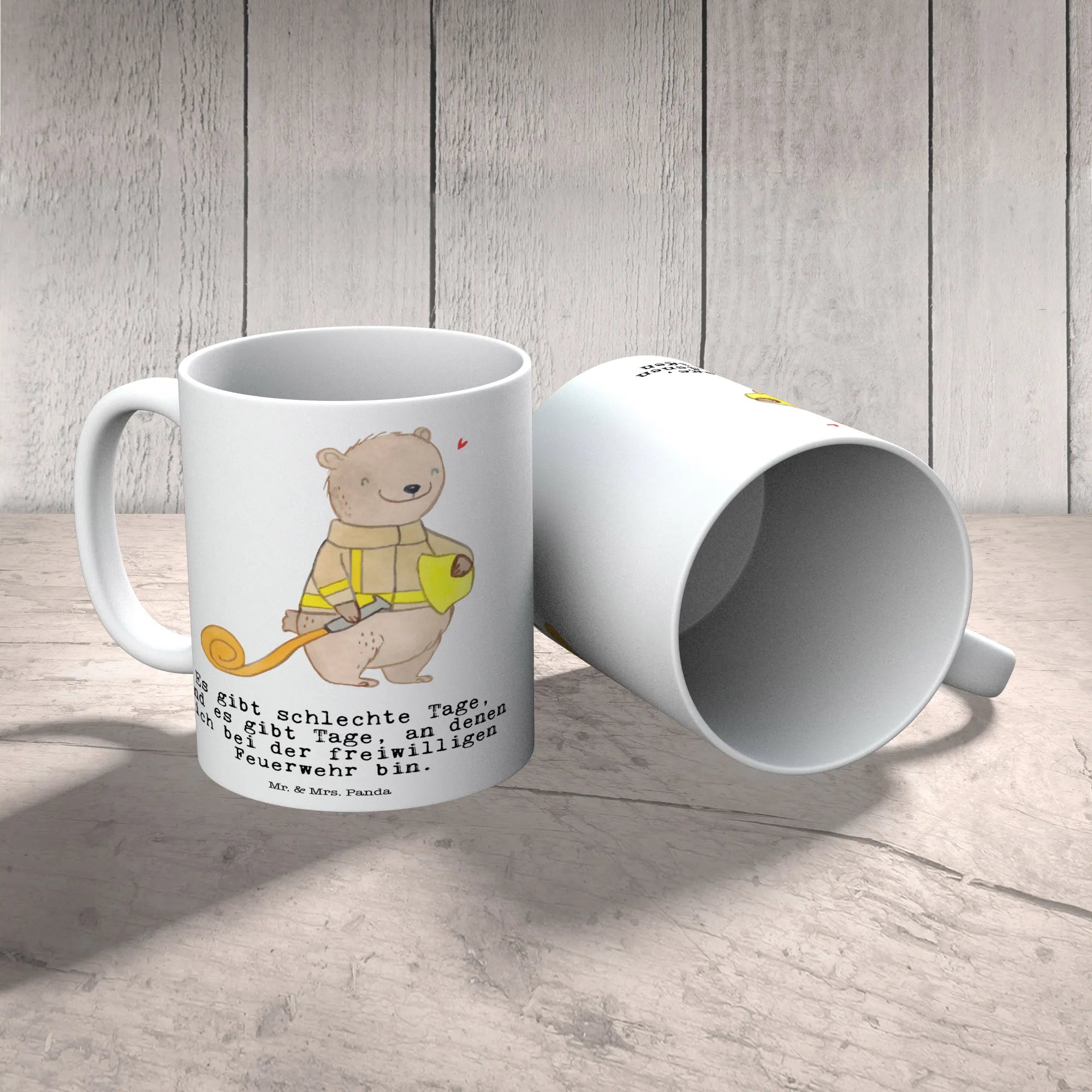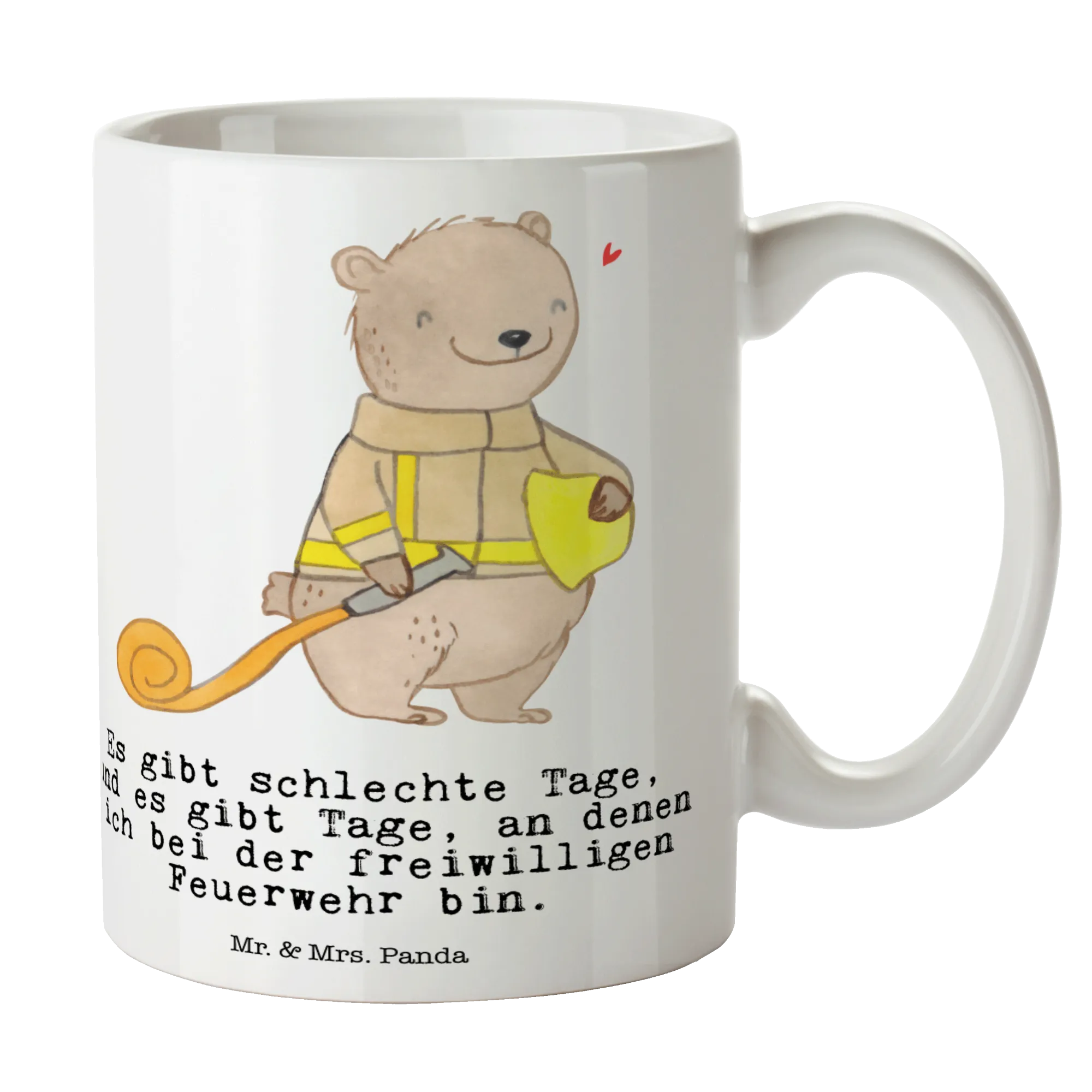 Die wunderschöne Tasse Bär Freiwillige Feuerwehr Tage von Mr. & Mrs. Panda ist das perfekte Geschenk für alle Feuerwehrkameraden und -kameradinnen! Egal, ob Du jemanden überraschen möchtest, der bei der Feuerwehr aktiv ist, oder ob Du ein besonderes Dankeschön für den Feuerwehrdienst suchst – diese Keramiktasse erfüllt den Zweck mit Bravour. Der niedliche Bär mit Feuerwehrhelm und Schlauch bringt ein Lächeln in jeden Tag, während der charmante Spruch 'Es gibt schlechte Tage, und es gibt Tage, an denen ich bei der freiwilligen Feuerwehr bin.' seine Bedeutung unterstreicht.
