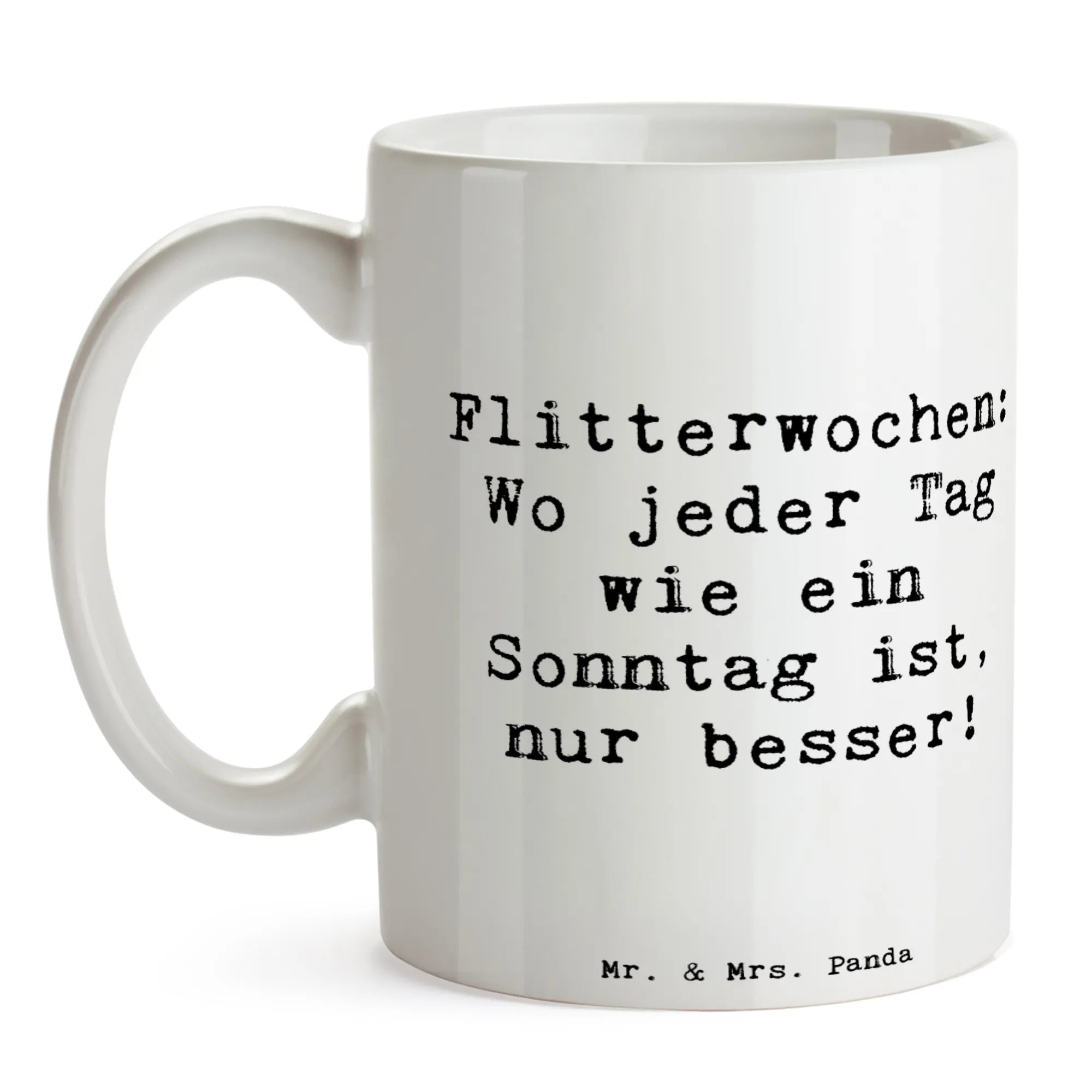 Du suchst nach dem perfekten Hochzeitsgeschenk, das nicht nur praktisch, sondern auch voller Liebe steckt? Dann ist die wunderschöne Tasse "Flitterwochen: Wo jeder Tag wie ein Sonntag ist, nur besser!" von Mr. & Mrs. Panda genau das, wonach du suchst! Diese originelle Keramiktasse aus unserer Hochzeitskollektion ist das ideale Geschenk für frisch verheiratete Paare oder als liebevolle Überraschung zur Verlobung. Das niedliche Motiv und der gefühlvolle Spruch bringen ein Lächeln ins Gesicht und sorgen dafür, dass jeder Schluck Kaffee oder Tee zu einem besonderen Moment wird.