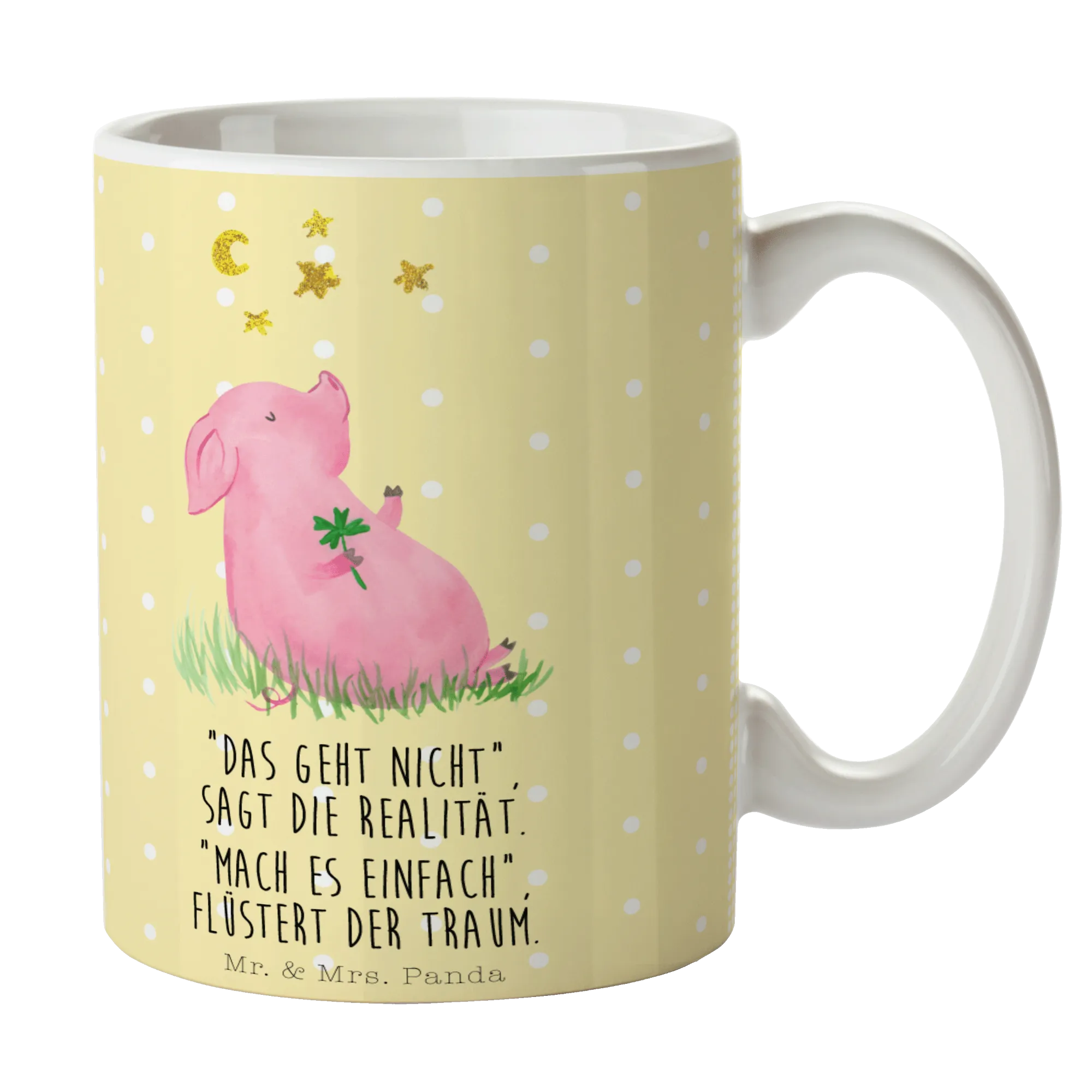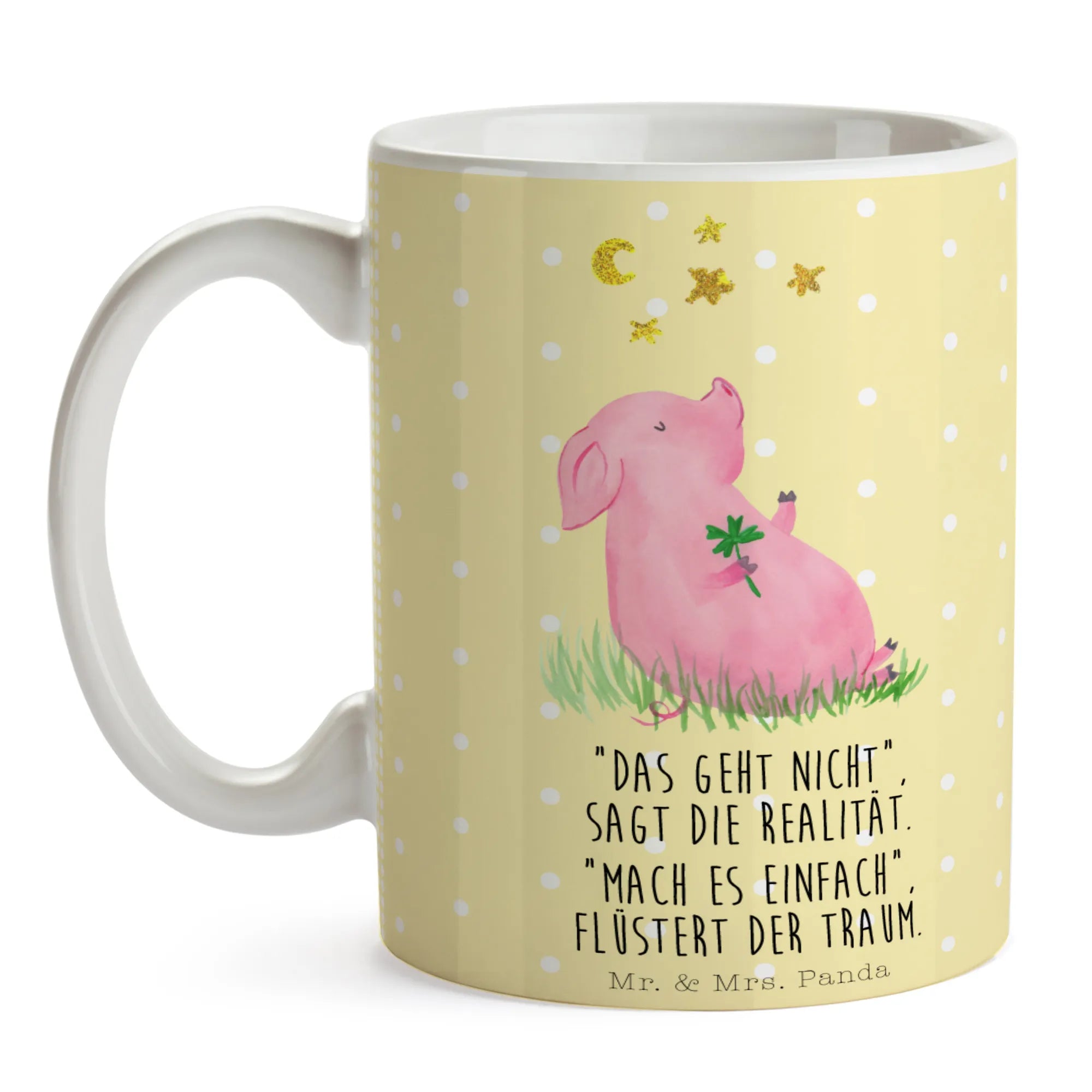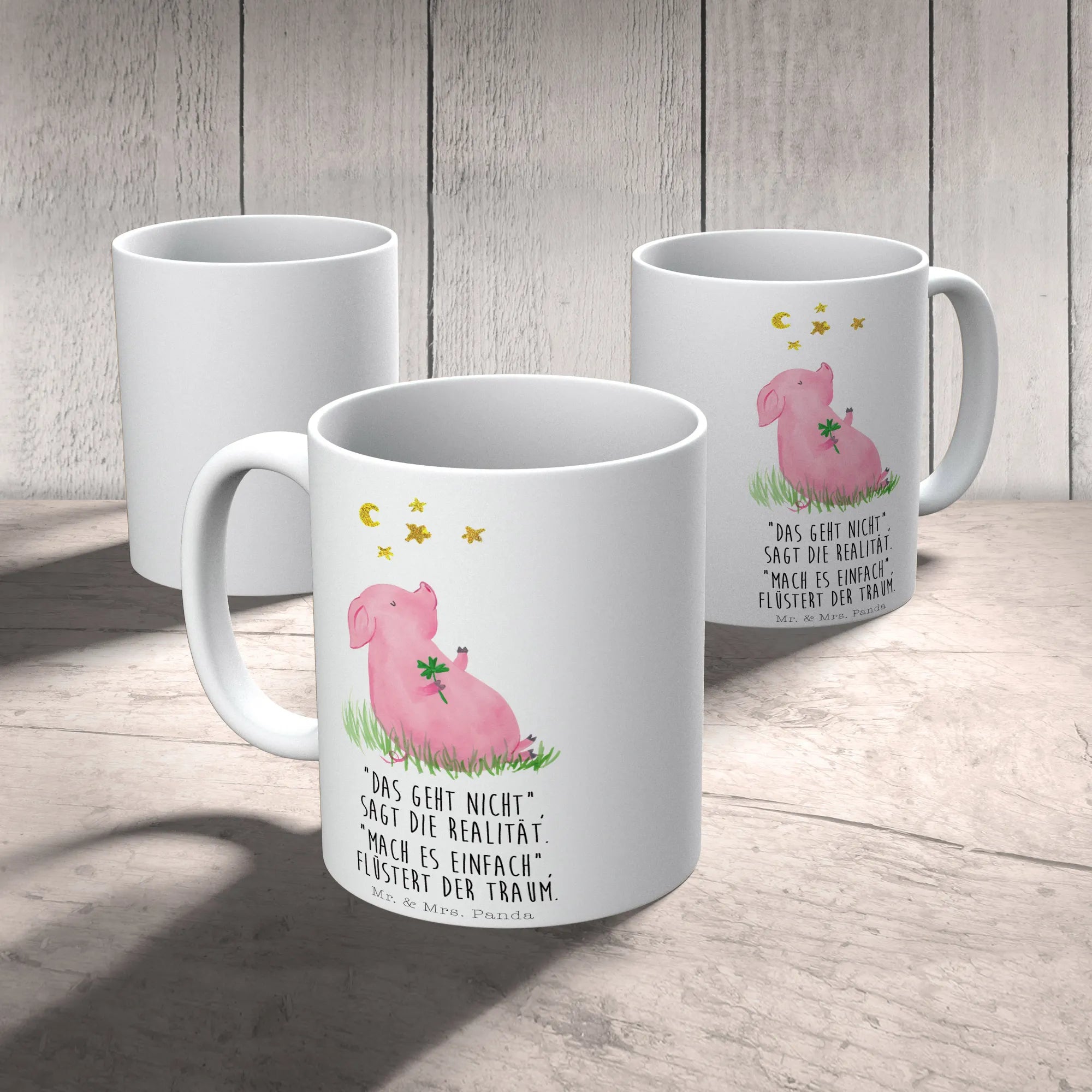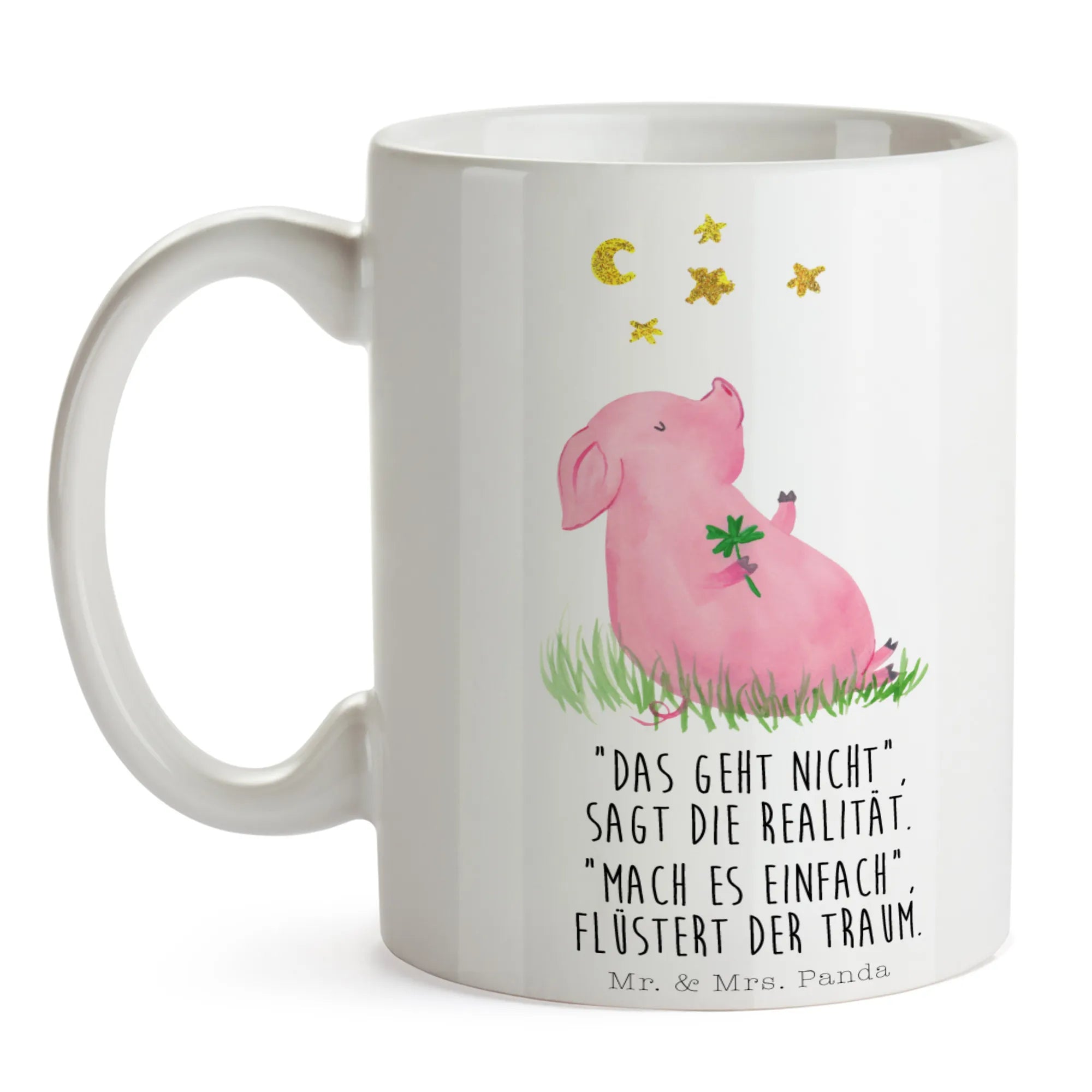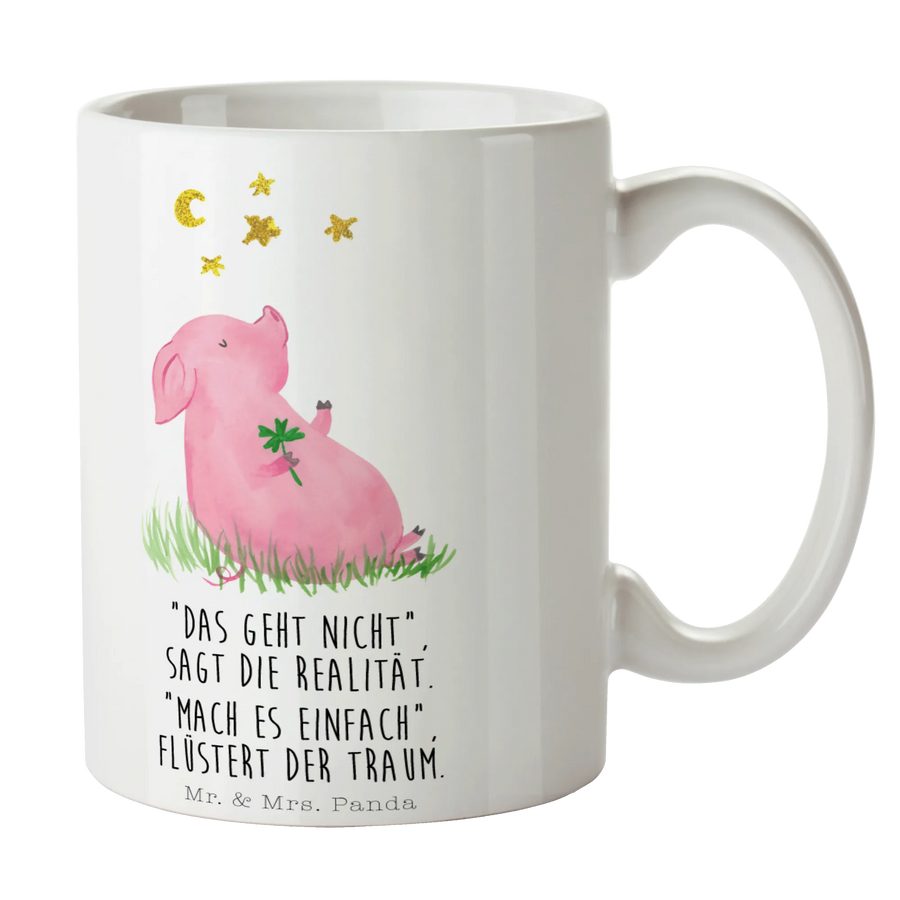 Entdecke die bezaubernde Glücksschwein-Tasse von Mr. & Mrs. Panda! Diese wunderschöne spülmaschinenfeste Keramiktasse bringt Freude und Glück in dein Leben - genau das, was du brauchst, um deine Ziele und Träume zu verwirklichen. Mit einem süßen Motiv eines kleinen Schweinchen, das ein Kleeblatt in der Hand hält, ist diese Tasse nicht nur ein echter Hingucker, sondern auch ein echter Glücksbringer. Das motivierende Sprichwort „Das geht nicht“, sagt die Realität. „Mach es einfach“, flüstert der Traum, erinnert dich jeden Tag daran, dass du alles erreichen kannst, was du dir vornimmst.