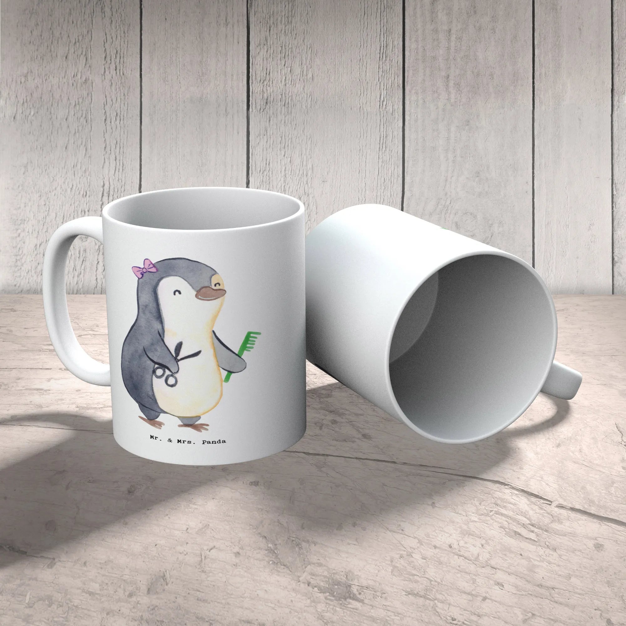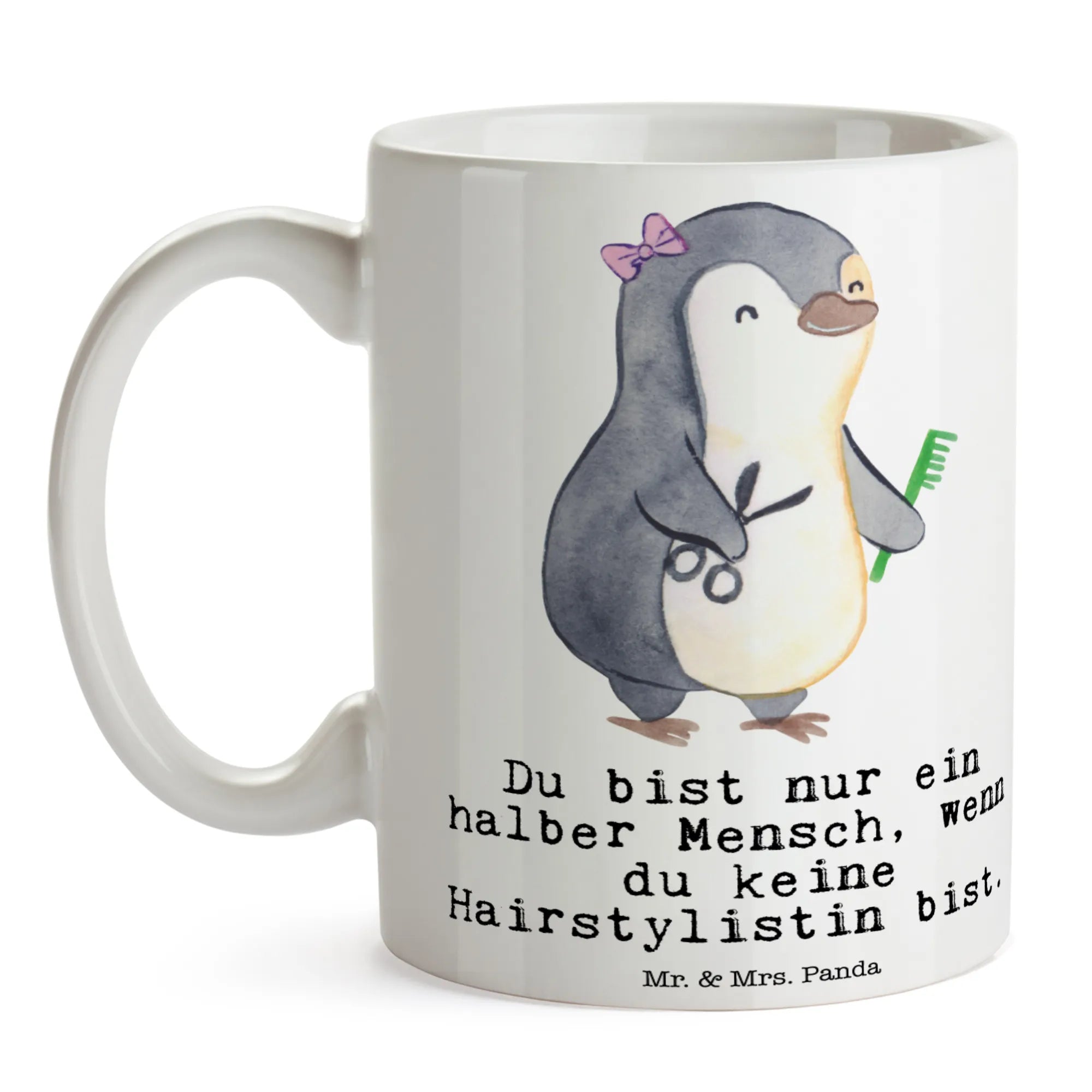 Mit einem schönen und ansprechenden Design, das einen niedlichen, weiblichen Pinguin zeigt, der als Hairstylistin dargestellt wird, bringt diese Tasse Freude in den Alltag einer jede Hairstylistin. Der witzige Spruch "Du bist nur ein halber Mensch, wenn du keine Hairstylistin bist" sorgt für ein Lächeln und ist ein perfektes Dankeschön für all die harte Arbeit, die hinter jedem Schnitt und jeder Frisur steckt.