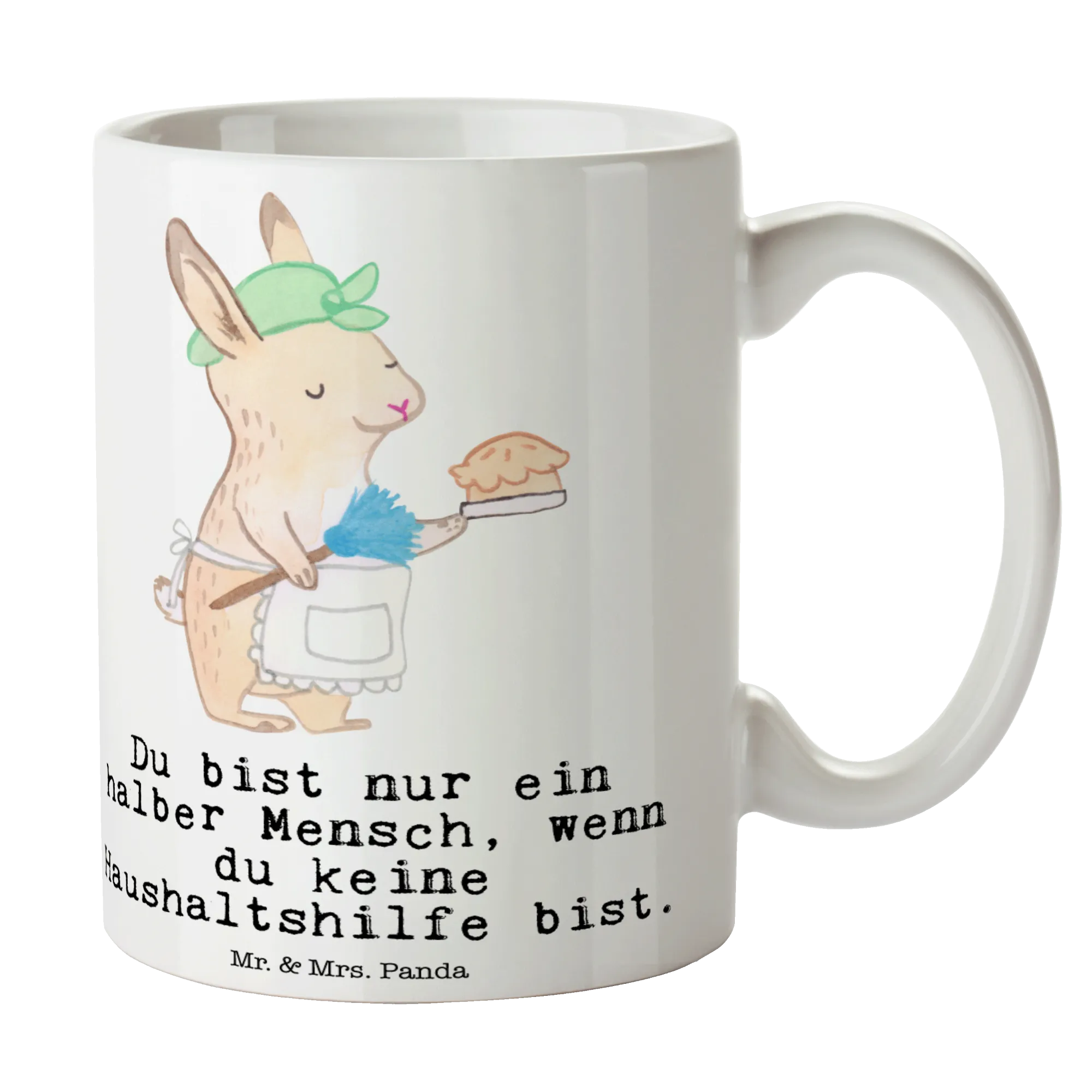 Mit einem süßen Motiv eines charmanten Hasen in Schürze, der mit einem Staubwedel ausgestattet ist, und dem witzigen Slogan "Du bist nur ein halber Mensch, wenn du keine Haushaltshilfe bist." wird deutlich, dass diese Tasse nicht nur ein praktisches Alltagsobjekt ist, sondern auch eine humorvolle Hommage an die unermüdlichen Helfer in unseren Haushalten.