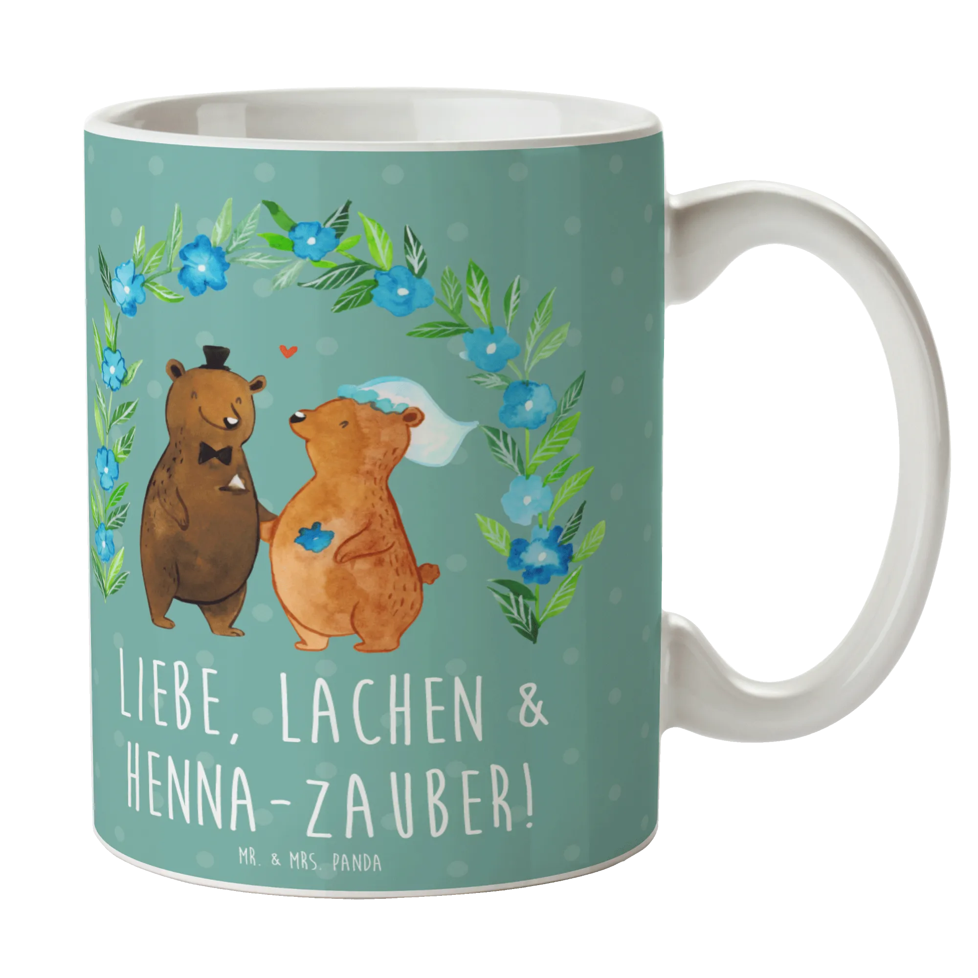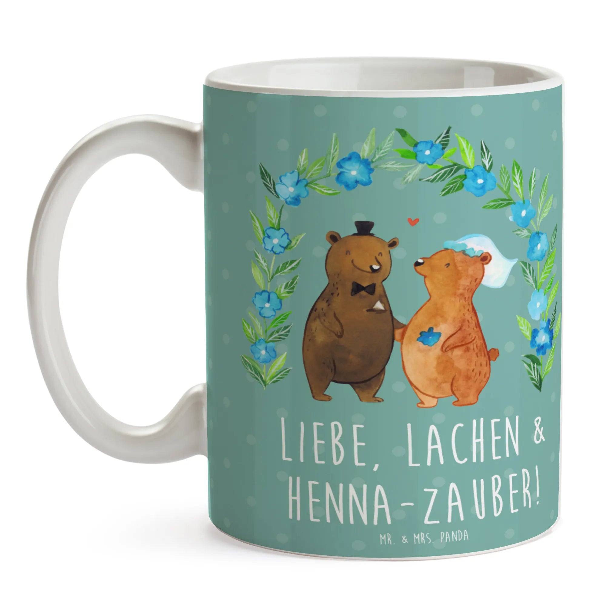 Die wunderschöne Tasse "Henna-Abend" aus der Hochzeitskollektion von Mr. & Mrs. Panda ist das perfekte Geschenk für alle, die eine Hochzeit feiern oder an einem Henna-Abend teilnehmen. Mit dem liebevollen Slogan "Liebe, Lachen & Henna-Zauber!" zaubert diese Keramiktasse jedem ein Lächeln ins Gesicht.