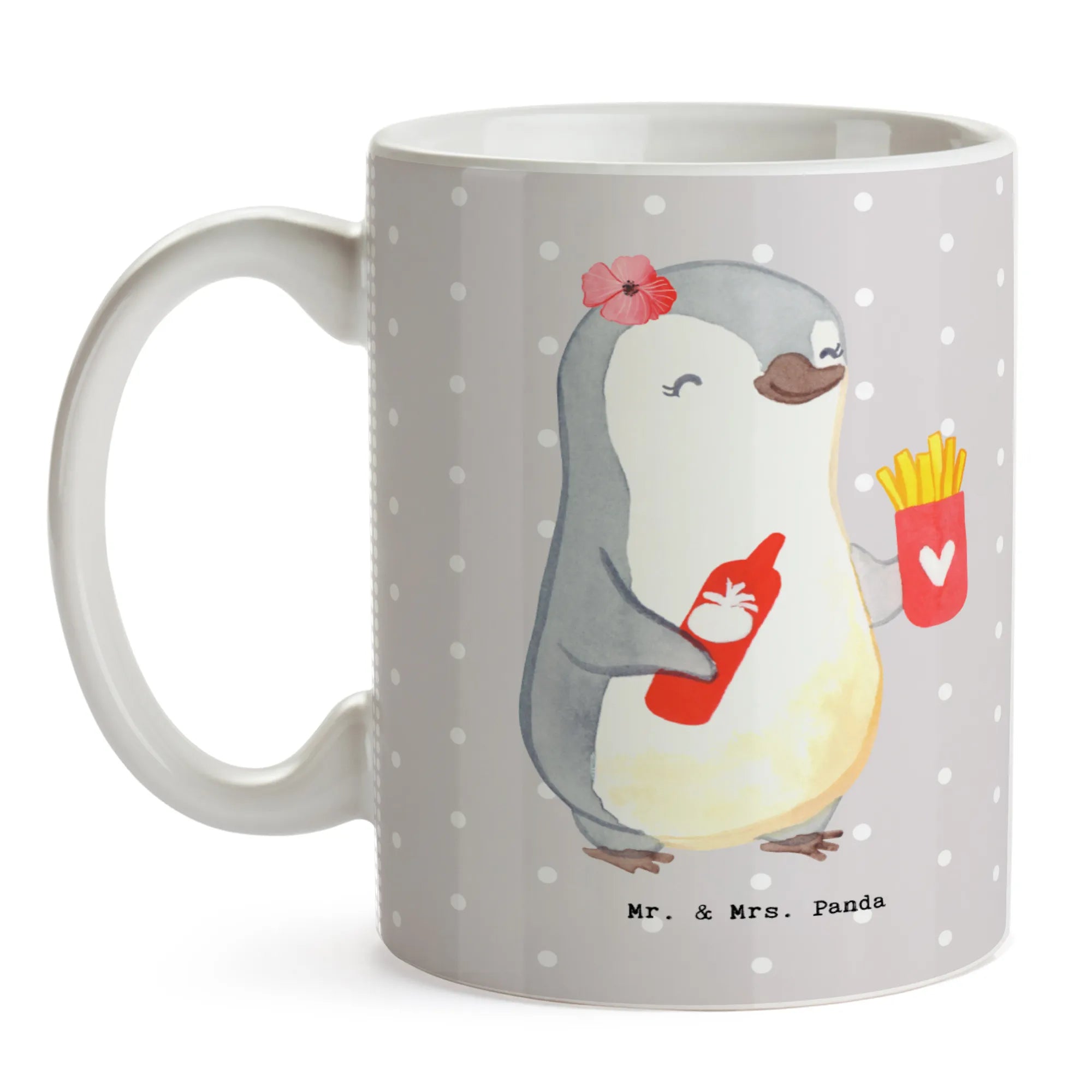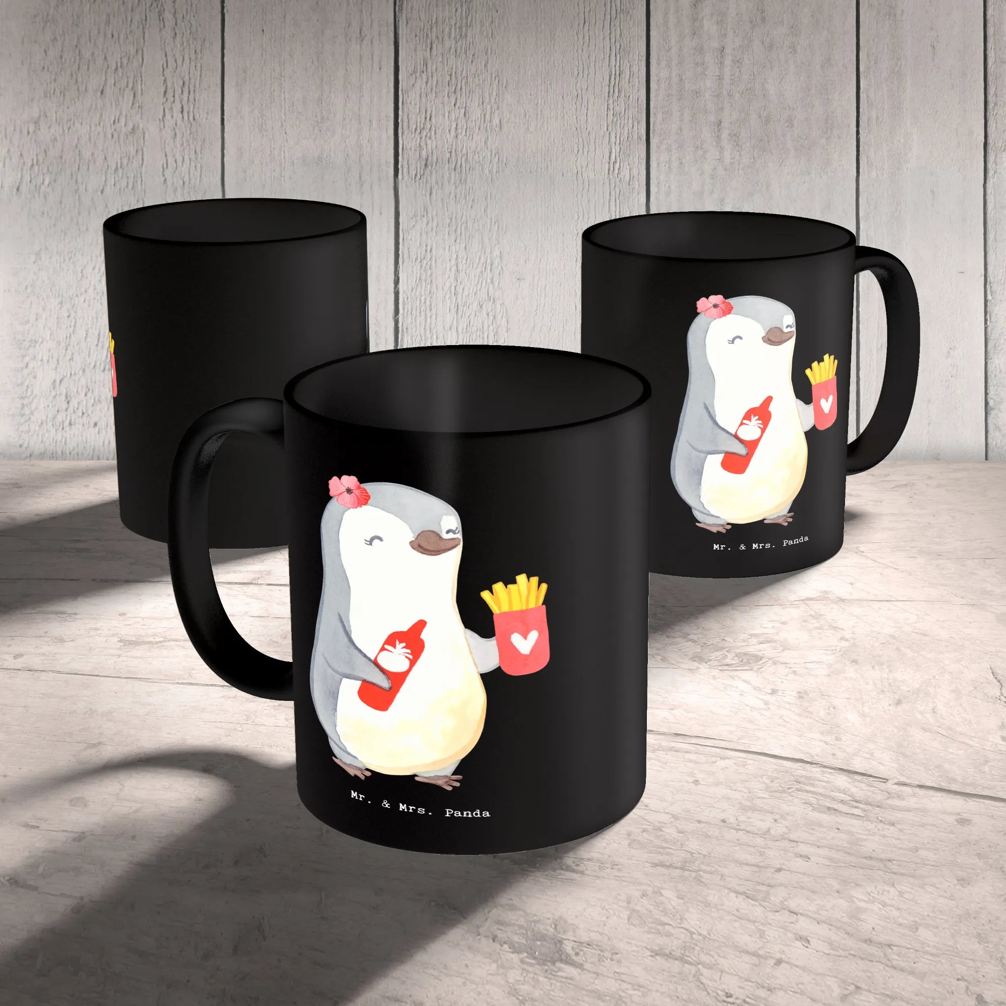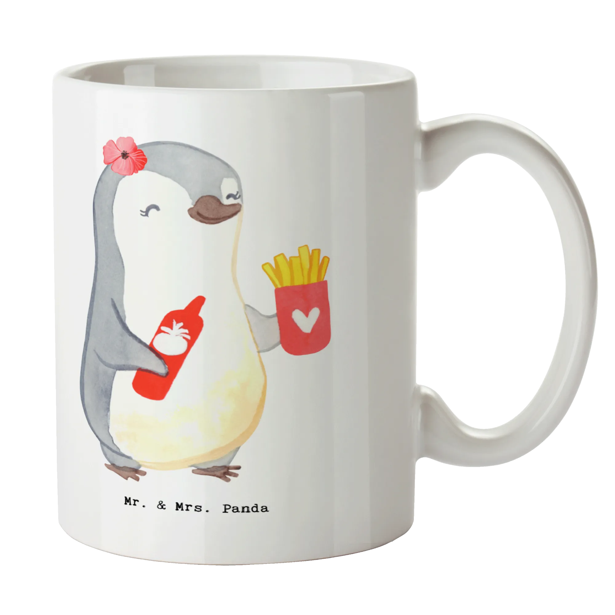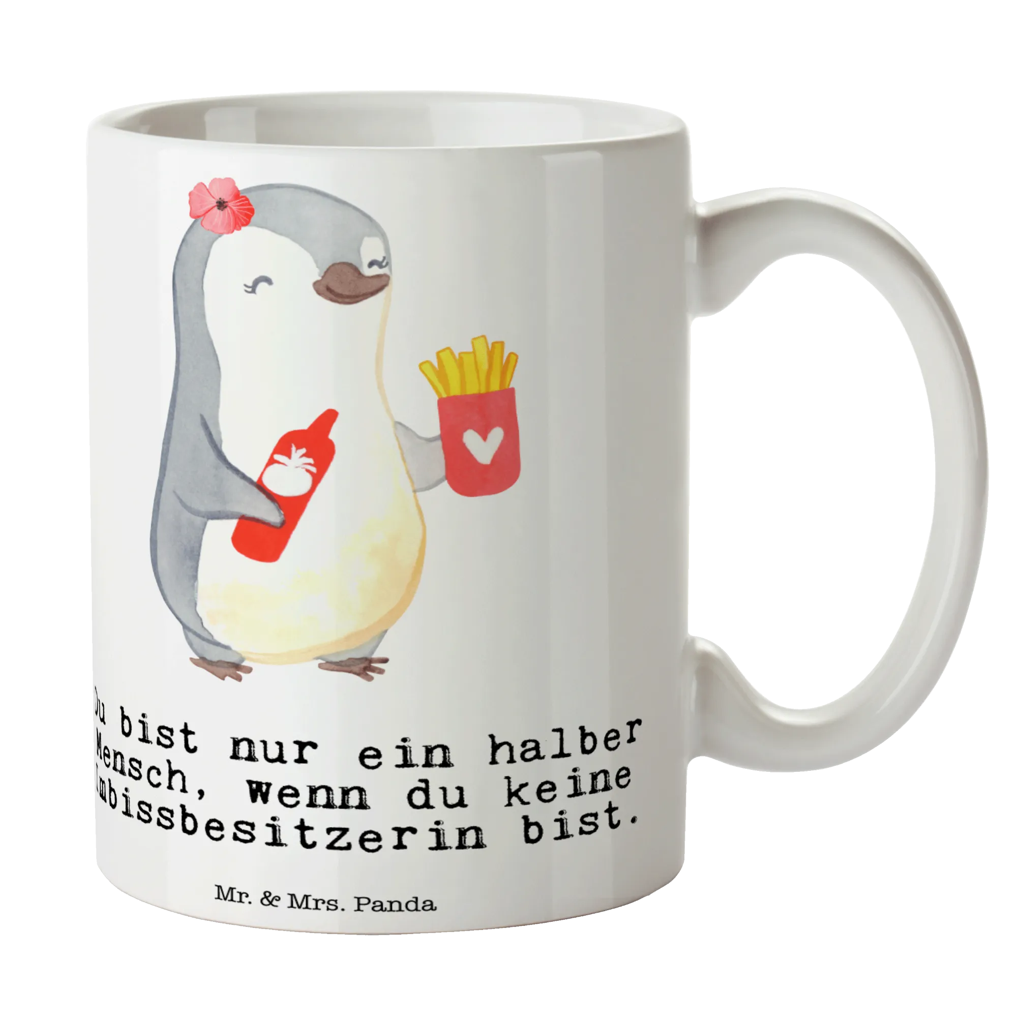 Die Tasse "Imbissbesitzerin mit Herz" aus der zauberhaften Berufe Kollektion von Mr. & Mrs. Panda ist das perfekte Geschenk für all diejenigen, die die Kunst des Snacking beherrschen! Egal ob du selbst eine Imbissbesitzerin bist oder jemandem eine Freude damit machen möchtest, diese Keramiktasse wird garantiert für gute Laune sorgen.