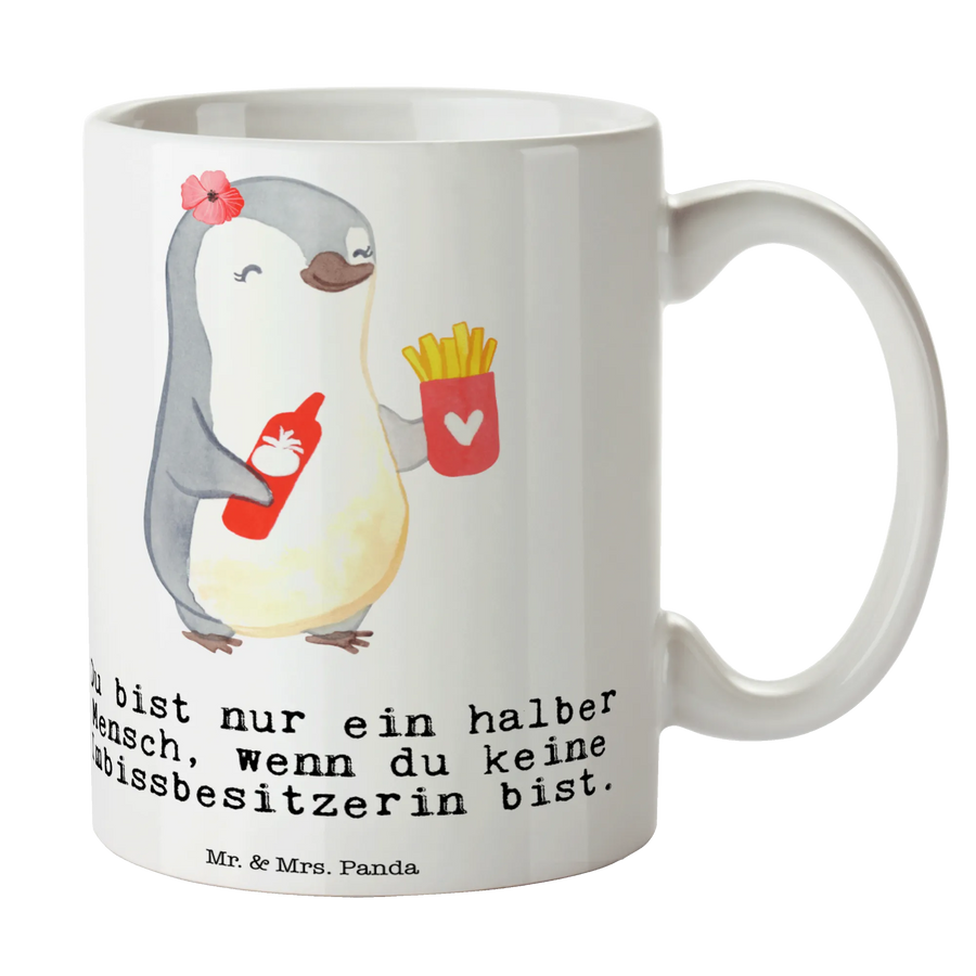 Entdecke die perfekte Geschenkidee für die Imbissbesitzerin deines Vertrauens! Unsere wunderschöne Tasse "Imbissbesitzerin mit Herz" aus der kreativen Berufe Kollektion von Mr. & Mrs. Panda ist mehr als nur ein Kaffeebecher. Sie ist ein liebevolles Dankeschön für alle, die dir mit einem Lächeln die besten Pommes servieren. Diese Tasse hat einen charmanten Aufdruck, der sagt: "Du bist nur ein halber Mensch, wenn du keine Imbissbesitzerin bist."