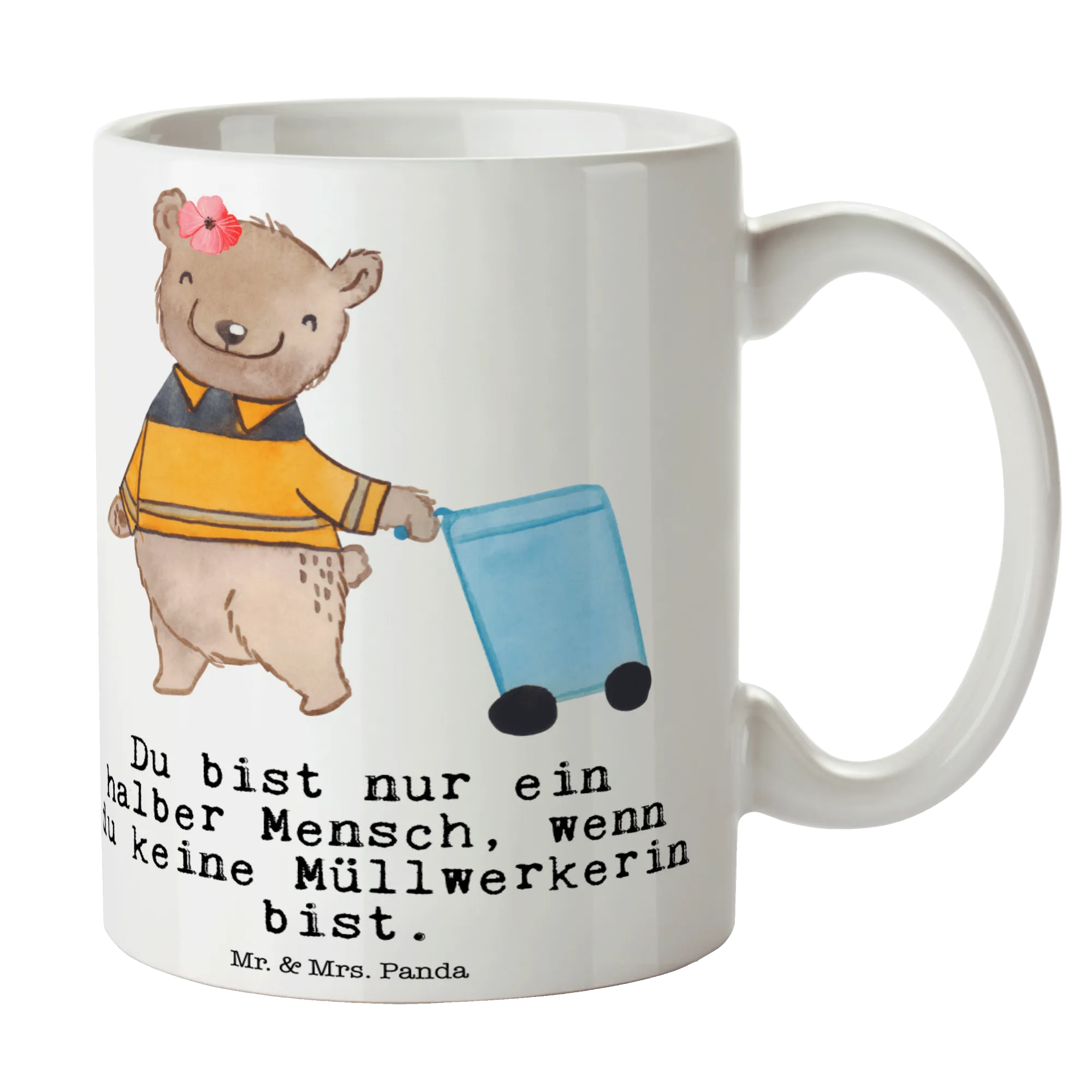 Die Tasse "Müllwerkerin mit Herz" von Mr. & Mrs. Panda ist das perfekte Geschenk für alle, die im Bereich Kreislauf- und Abfallwirtschaft arbeiten oder eine besondere Müllwerkerin in ihrem Leben haben. Diese wunderschöne Keramiktasse hat nicht nur ein liebevolles Design, das einen fröhlichen, weiblichen Bären zeigt, der eine Papiertonne hinter sich herzieht, sondern auch eine wichtige Botschaft: "Du bist nur ein halber Mensch, wenn du keine Müllwerkerin bist!" Dieses charmante Motiv erinnert daran, wie wertvoll die Arbeit von Müllwerkerinnen und Müllwerkern ist, die oft im Hintergrund arbeiten und dennoch einen essenziellen Beitrag für unsere Gesellschaft leisten.