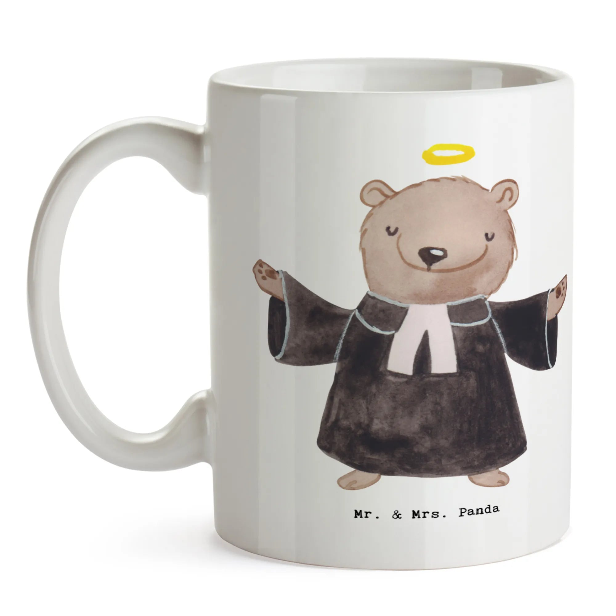 Unser kleiner Priesterbär hat etwas ganz Persönliches an sich: er wirkt wie ein pastellfarbener Tröster, der als Pastor oder geistlicher Freund die Hände zum Segen hebt. Dieses Motiv fängt einen Moment voller Zuwendung ein — so, als würde er genau dir einen guten Wunsch mit auf den Weg geben. Die feinen Details der Robe und der liebevolle Gesichtsausdruck machen ihn zu einem treuen Begleiter, der Hoffnung und Zuversicht ausstrahlt. Ideal als Geschenk für Menschen, die in der Kirche aktiv sind oder einfach eine spirituelle Verbindung spüren, bringt der Bär Wärme in jeden Raum. Er ist nicht pathetisch, sondern sanft und zugänglich: ein Pastor, den man sofort umarmen möchte. Verwende dieses Motiv auf Karten, Geschenkartikeln oder Deko und lasse seine Botschaft wirken: Segen, Trost und ein Augenzwinkern. Der liebenswerte Stil von Mr. & Mrs. Panda macht aus religiösen Themen etwas Alltägliches und Beruhigendes — genau richtig für Momente, in denen Worte nicht ausreichen, aber das Herz verstanden werden möchte.