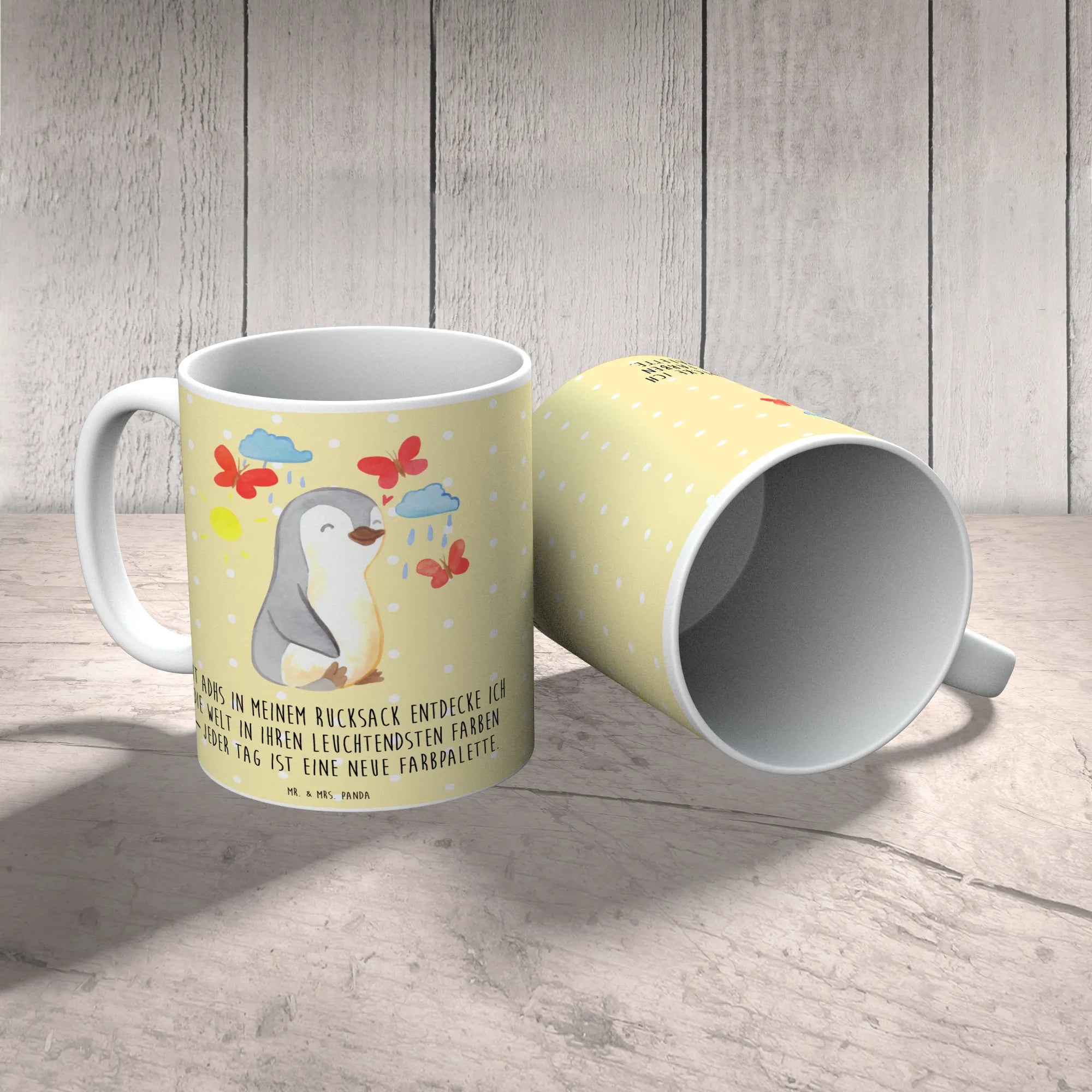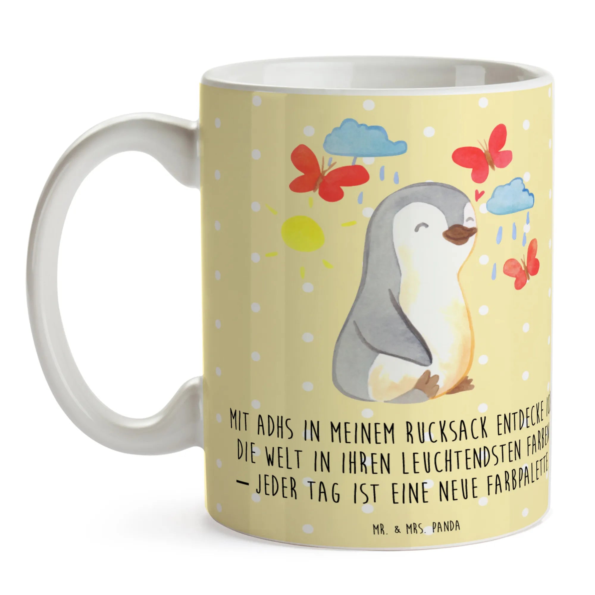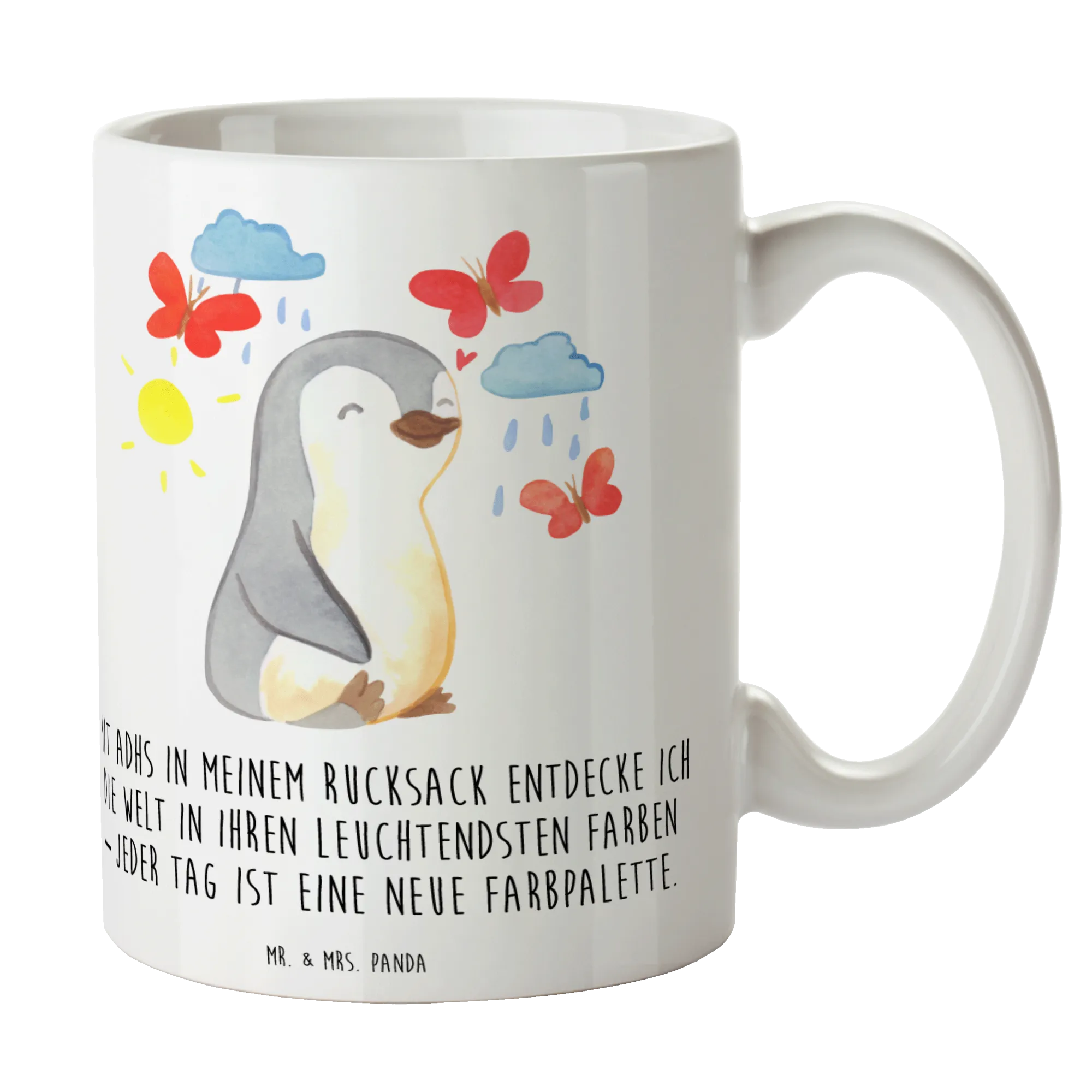 Die wunderschöne Tasse "Pinguin ADHS" aus der Kollektion "Tiere mit Superkräften" von Mr. & Mrs. Panda ist das perfekte Geschenk für all jene, die den bunten Alltag mit ADHS meistern. Diese Keramiktasse, mit einem fröhlich gestalteten Pinguin, der von Wolken, Sonnenschein und Schmetterlingen umgeben ist, symbolisiert die vielen Facetten und Farben, die das Leben mit ADHS mit sich bringt.