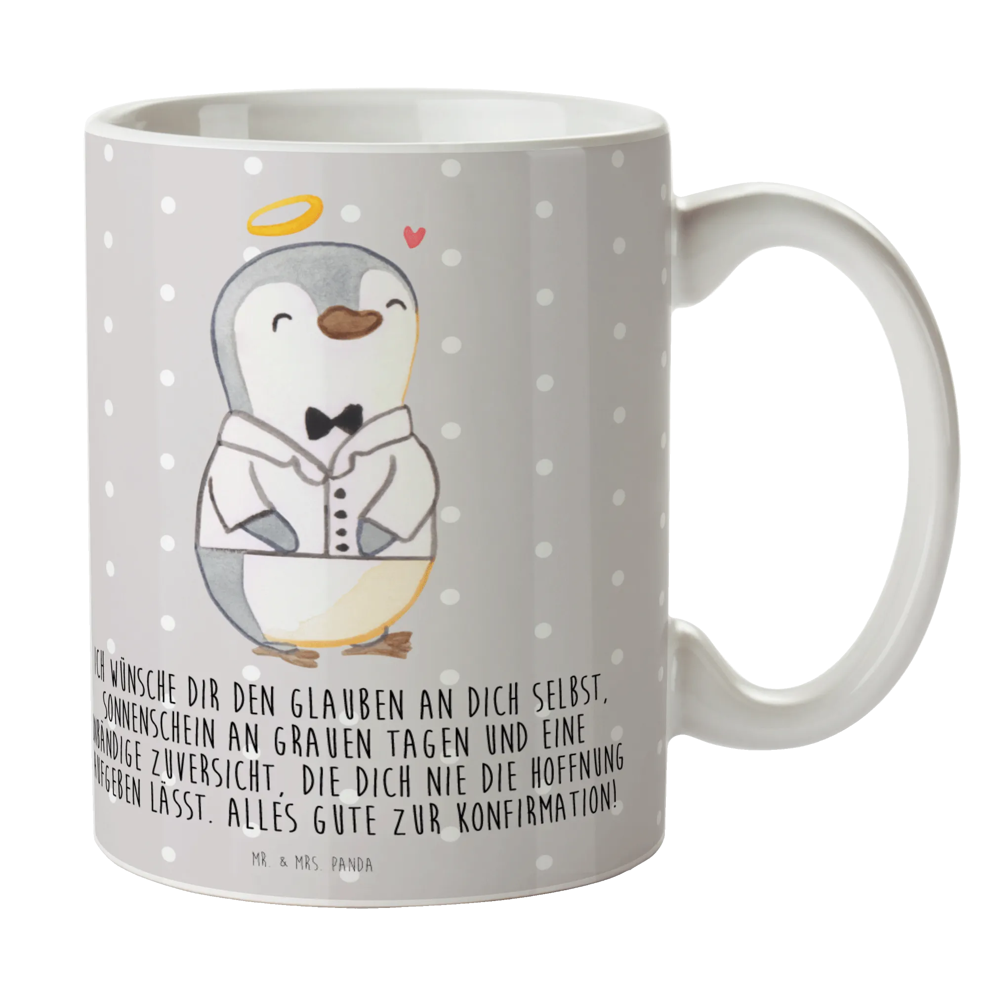 Mit seinem kleinen Heiligenschein und dem schicken weißen Hemd ist unser Pinguin der perfekte Begleiter für alle, die zur Konfirmation bereit sind! Seine Botschaft an dich lautet: "Ich wünsche dir den Glauben an dich selbst, Sonnenschein an grauen Tagen und eine unbändige Zuversicht, die dich nie die Hoffnung aufgeben lässt. Alles Gute zur Konfirmation!" Dieser süße Pinguin steht für Vertrauen und Hoffnung in all ihren Formen. Denn auch wenn es mal etwas stürmisch ist, kannst du sicher sein, dass Ruhe und Licht nicht weit sind. Lass die Farben des Lebens in dein Herz, und gehe mit Zuversicht in die Zukunft. Such dir immer das Schöne und lass dir durch nichts den Glauben nehmen!