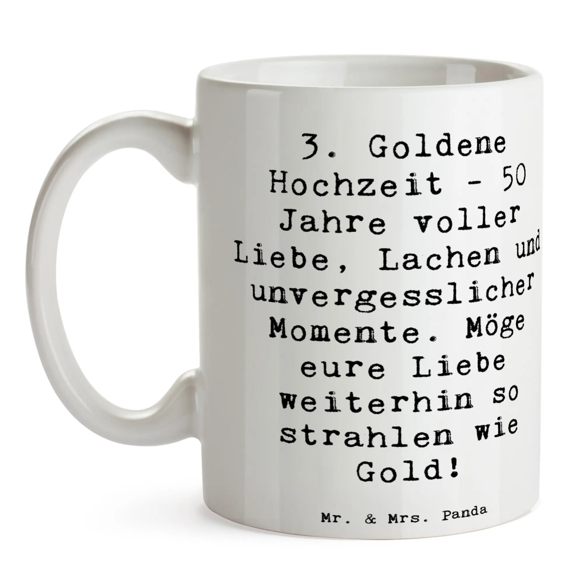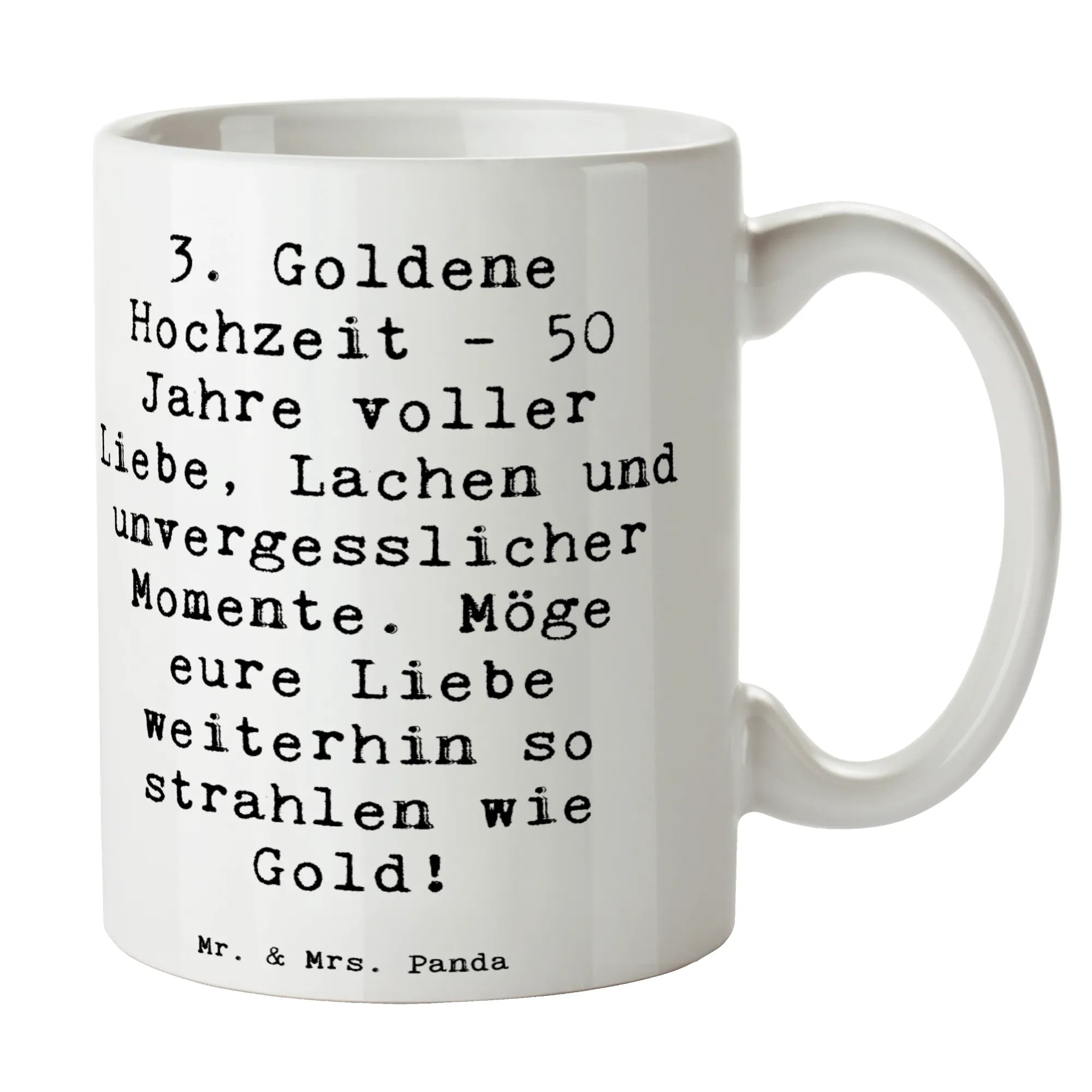Diese wunderschöne Kaffeetasse von Mr. & Mrs. Panda ist das perfekte Geschenk für das traumhafte Jubeljahr der Goldenen Hochzeit! Mit ihrem strahlenden Motiv "3. Goldene Hochzeit - 50 Jahre voller Liebe, Lachen und unvergesslicher Momente. Möge eure Liebe weiterhin so strahlen wie Gold!" aus unserer exklusiven Hochzeitskollektion, bringt sie nicht nur Freude, sondern auch ein Stück Erinnerung an unvergessliche Jahre voller gemeinsamer Augenblicke.
