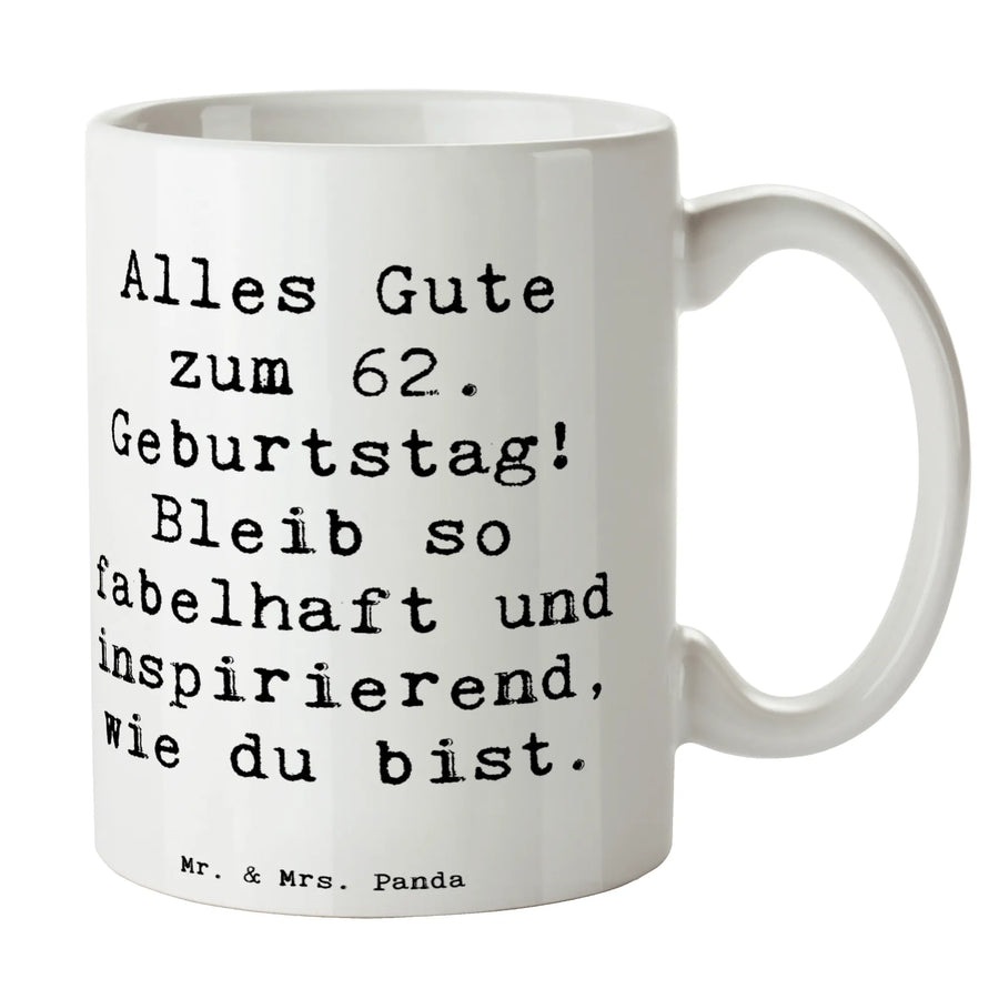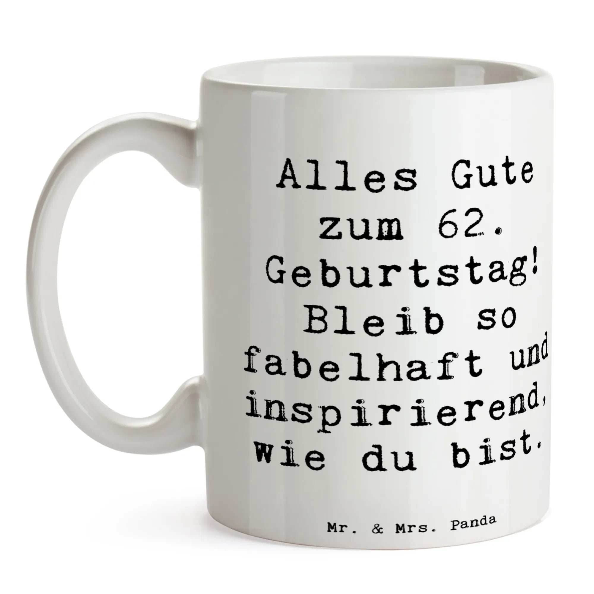 Die wunderschöne Keramiktasse zum 62. Geburtstag von Mr. & Mrs. Panda ist das perfekte Geschenk für alle, die einen ganz besonderen Tag feiern möchten. Mit dem liebevollen Slogan "Alles Gute zum 62. Geburtstag! Bleib so fabelhaft und inspirierend, wie du bist." bringt diese Tasse Freude und Wärme in den Alltag. Sie eignet sich optimal als Geburtstagsgeschenk für deine Eltern, Großeltern oder Freunde, die ihr 62. Lebensjahr feiern.