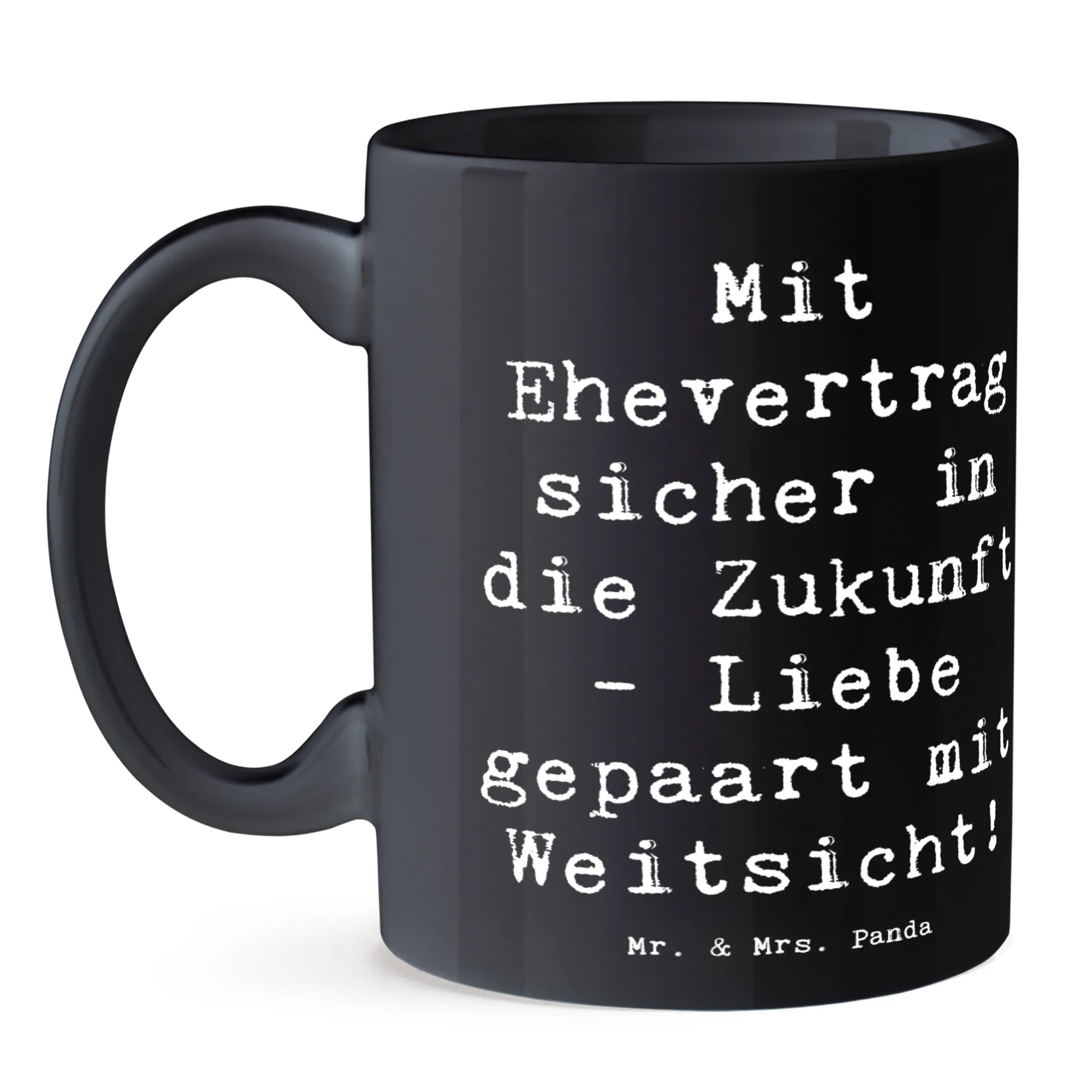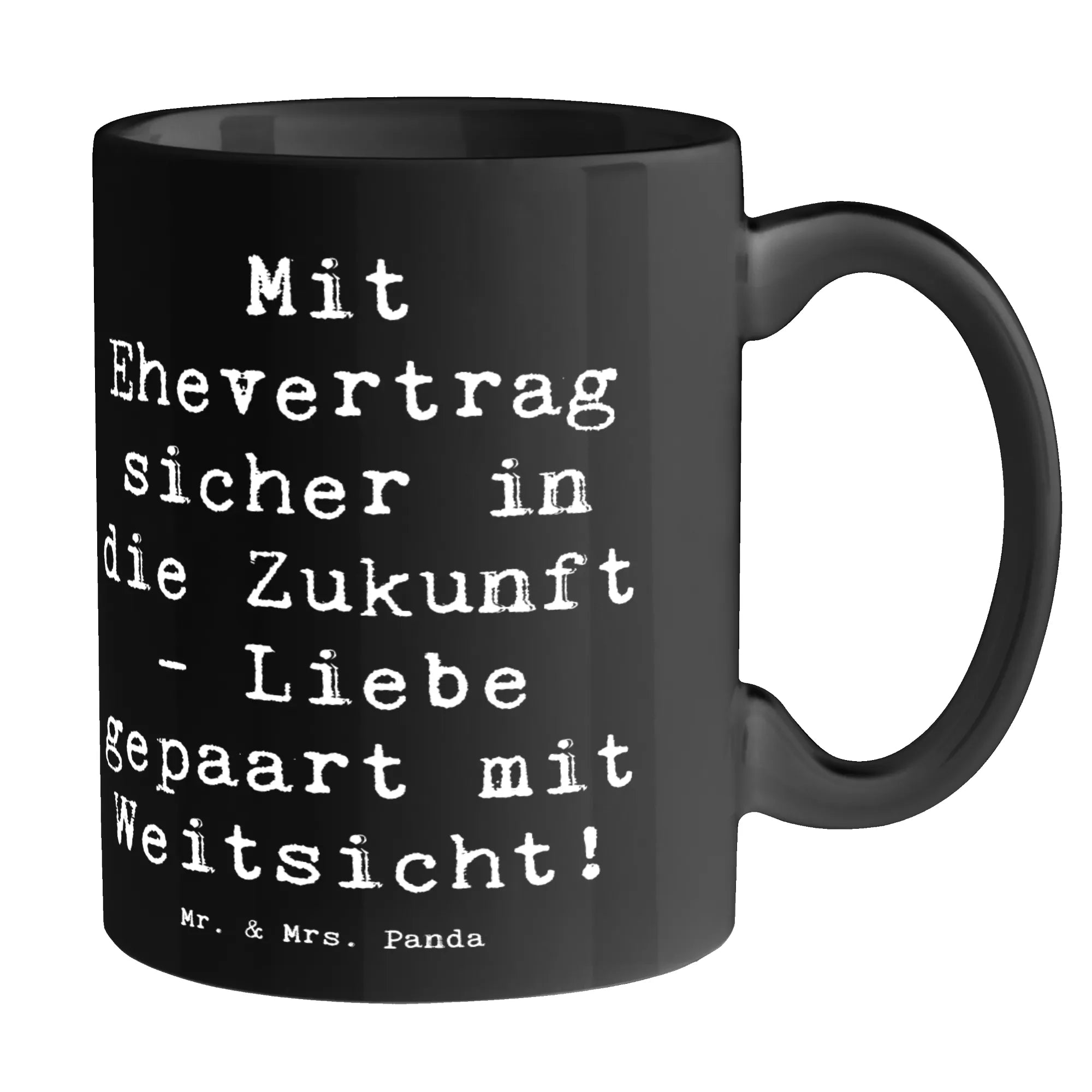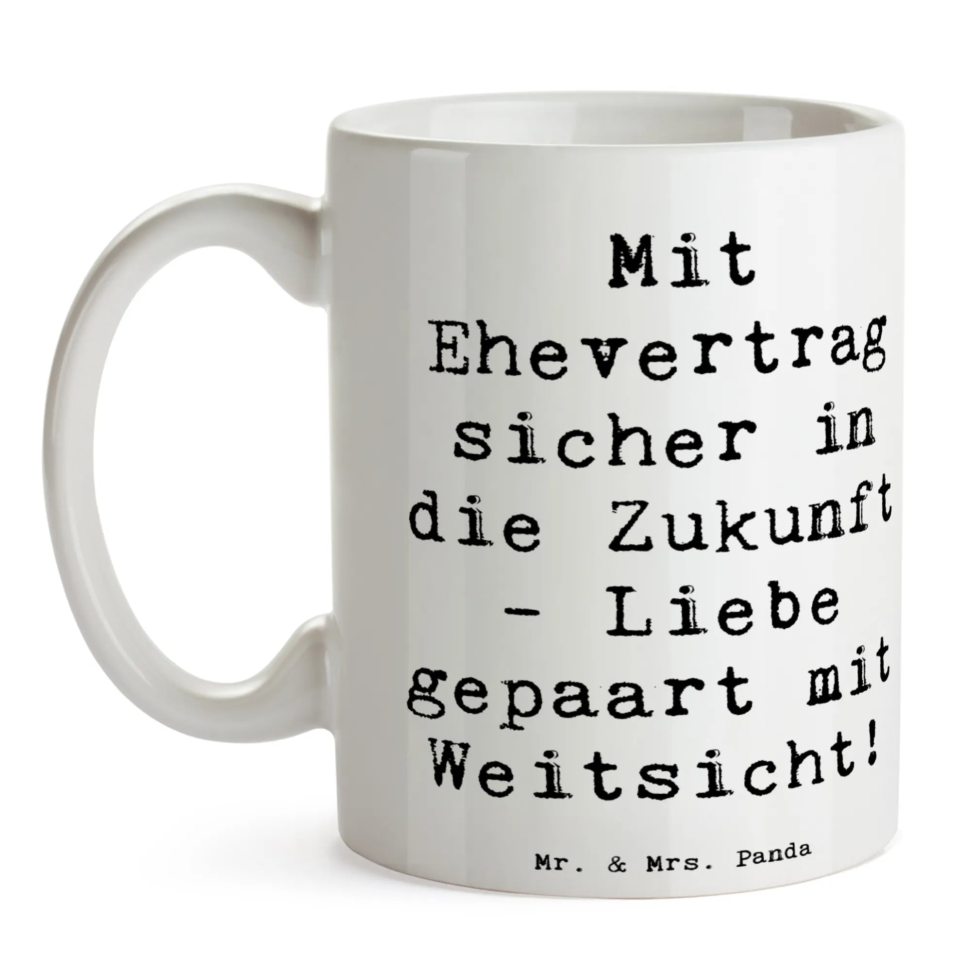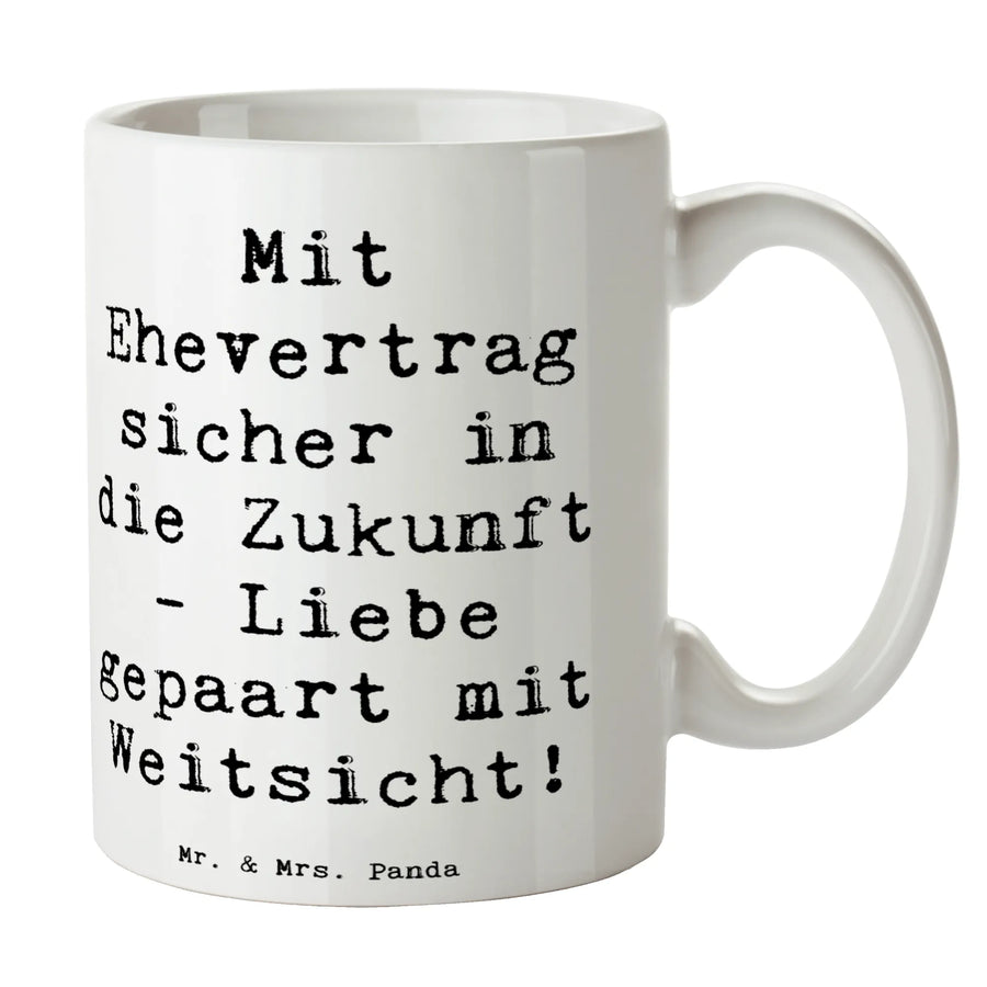 Die Mr. & Mrs. Panda Tasse "Ehevertrag" ist das perfekte Geschenk für alle frisch Verliebten und zukünftigen Ehepaare! Sie besteht aus hochwertiger Keramik und hat das besondere Motto "Mit Ehevertrag sicher in die Zukunft - Liebe gepaart mit Weitsicht!".