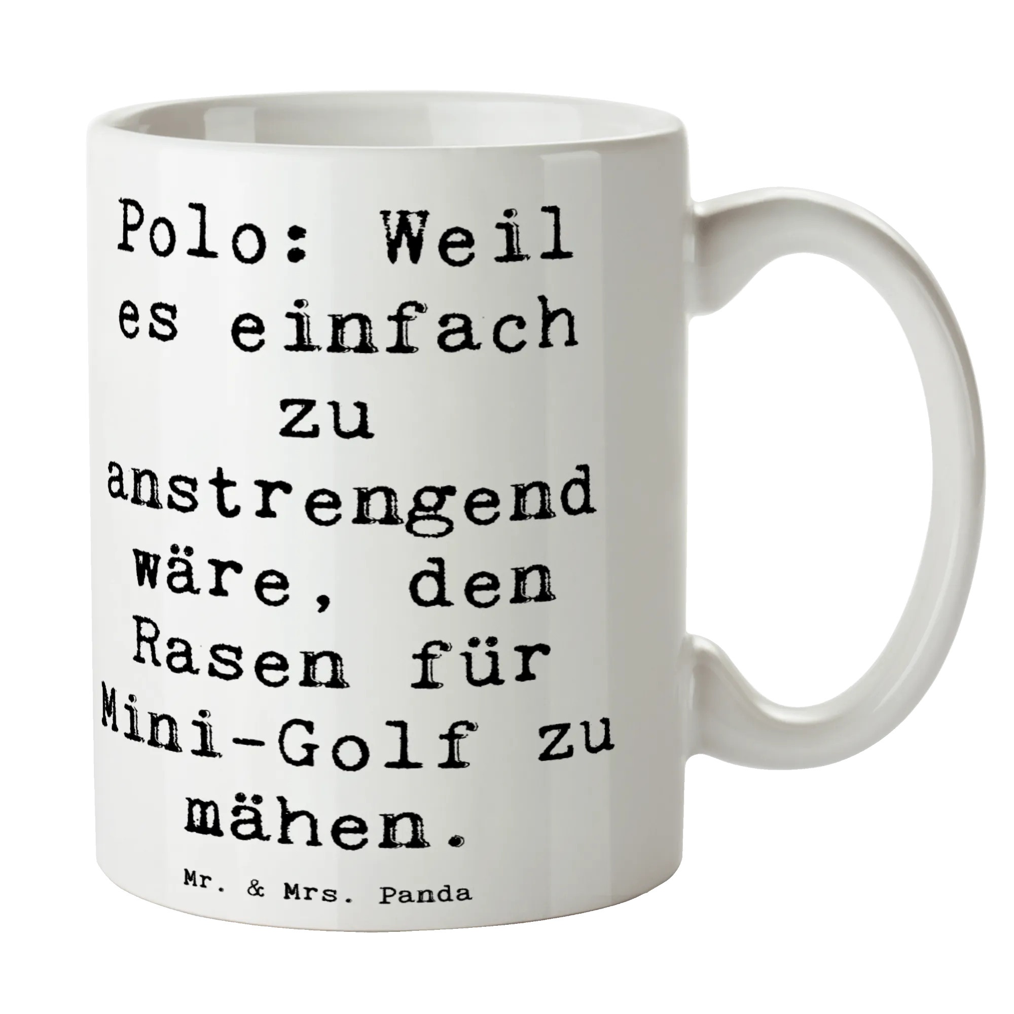 Die perfekte Tasse für alle Polo-Enthusiasten! Unsere wunderschöne spülmaschinenfeste Keramiktasse von Mr. & Mrs. Panda ist nicht nur ein Blickfang, sondern auch das ideale Geschenk für Sportler und Sportliebhaber. Mit dem lustigen Spruch 'Polo: Weil es einfach zu anstrengend wäre, den Rasen für Mini-Golf zu mähen' bringt diese Tasse nicht nur ein Lächeln auf das Gesicht, sondern auch eine Portion Humor in den Alltag. Ob beim Training, Wettkampf oder einfach nur beim gemütlichen Kaffeeklatsch, diese Tasse ist der perfekte Begleiter.