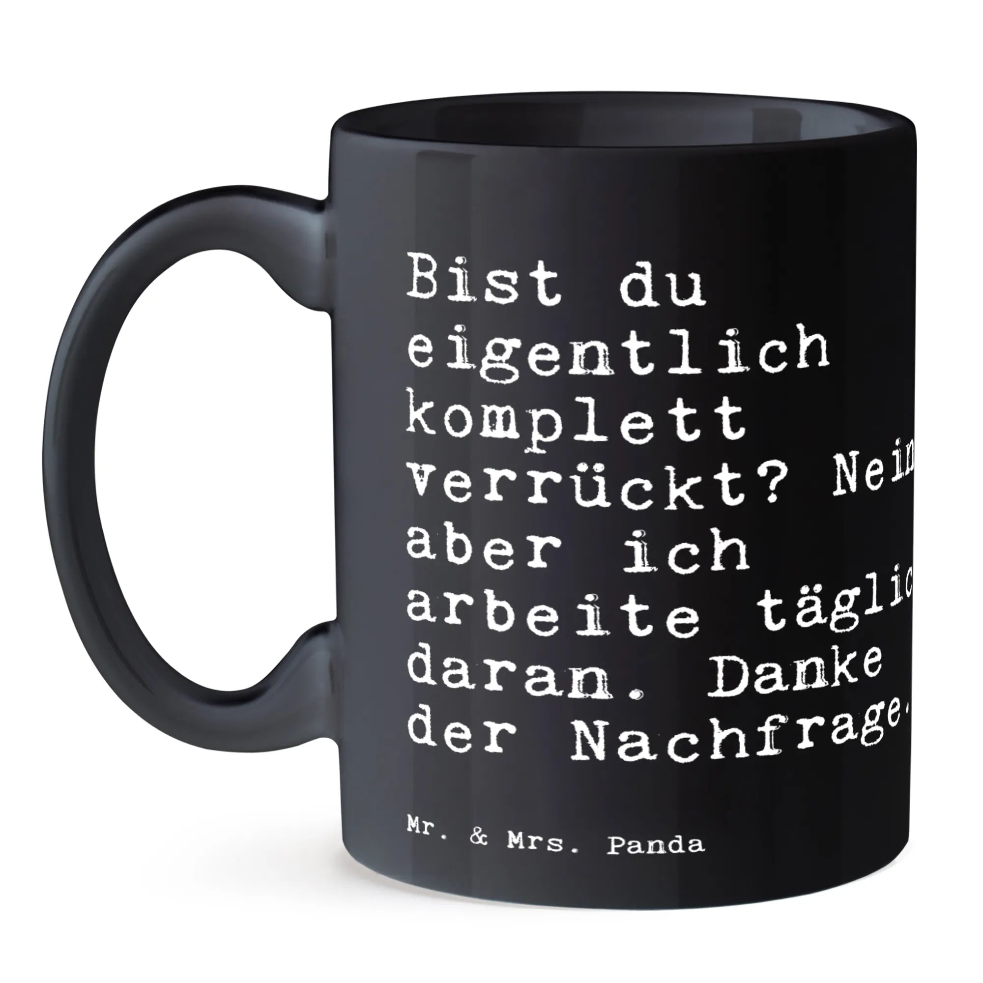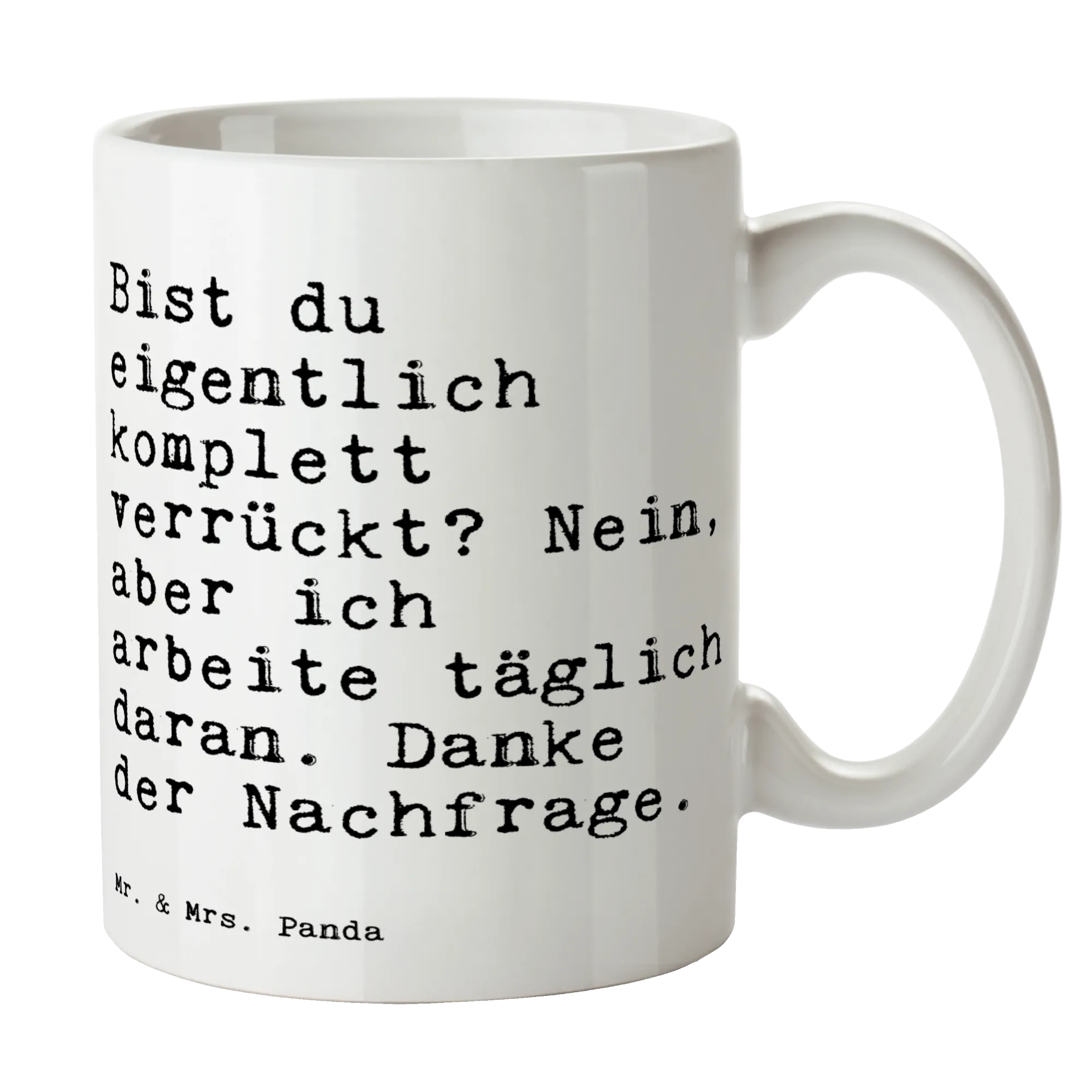 Tasse Sprüche und Zitate Bist du eigentlich komplett verrückt? Nein, aber ich arbeite täglich daran. Danke der Nachfrage. - Keramik - Weiß
