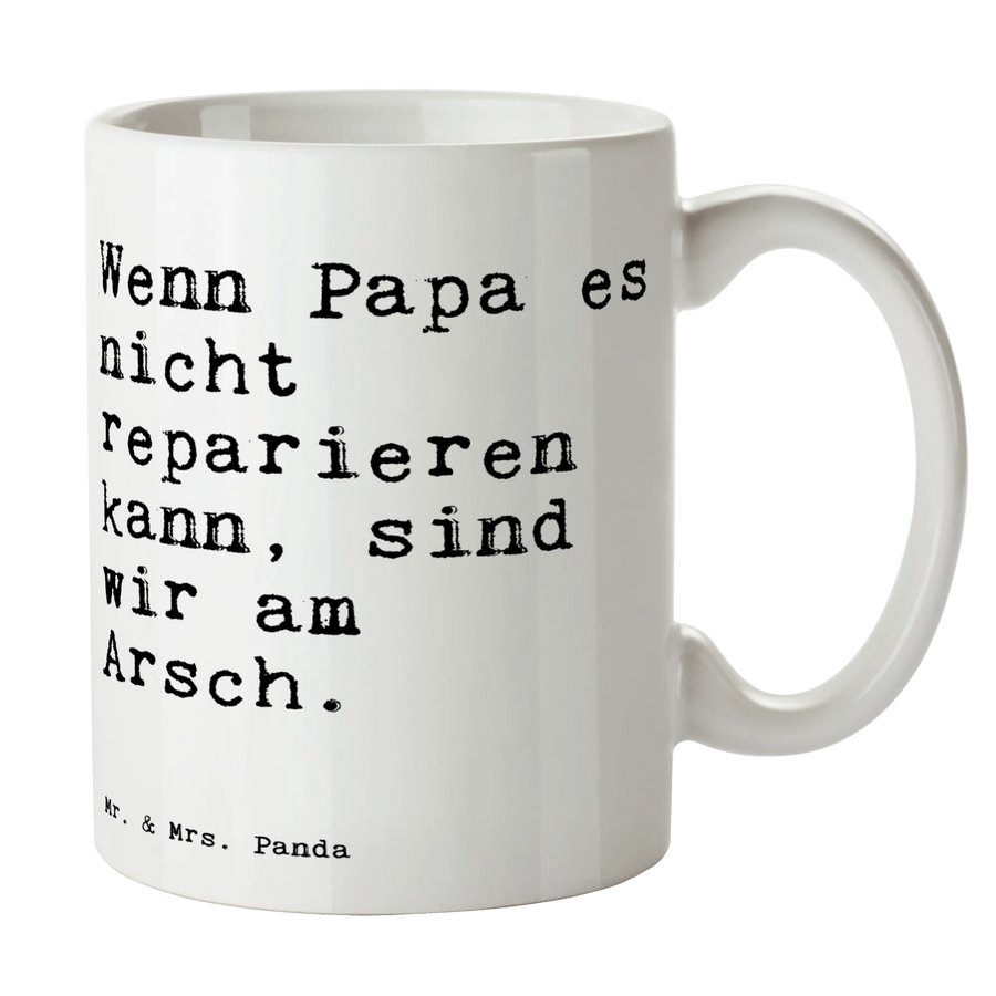 Suchst du das perfekte Geschenk für deinen Papa? Unsere Tasse mit dem Spruch "Wenn Papa es nicht reparieren kann, sind wir am Arsch." wird ihm garantiert ein Lächeln ins Gesicht zaubern! Diese wunderschöne, spülmaschinenfeste Keramiktasse von Mr. & Mrs. Panda ist nicht nur praktisch, sondern auch ein echtes Statement. Mit einem Fassungsvermögen von 325 ml ist sie ideal für seinen täglichen Kaffee oder Tee.