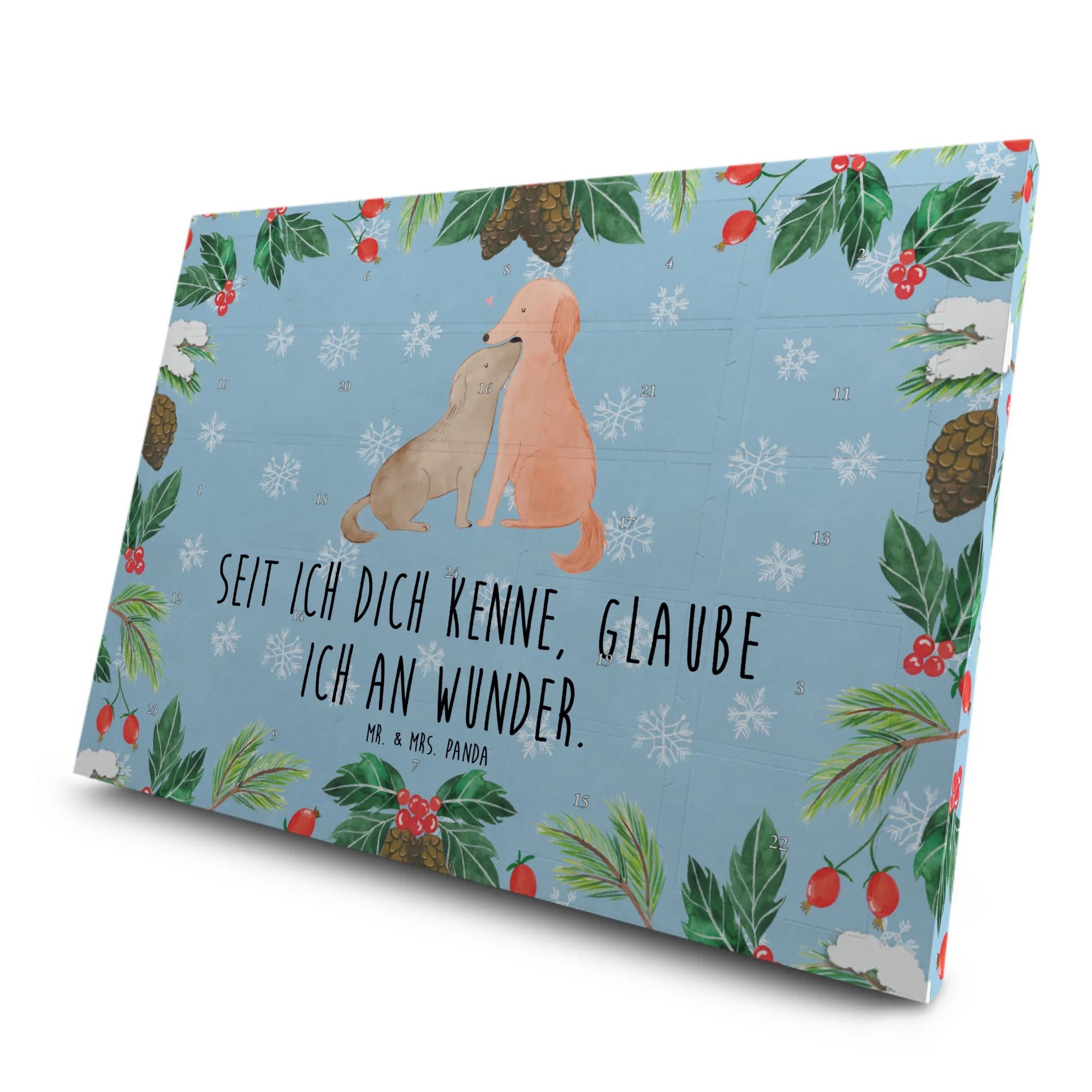Das Motiv "Hunde Liebe" wird von dem herzerwärmenden Slogan "Seit ich dich kenne, glaube ich an Wunder." begleitet, der die besondere Verbindung zwischen Mensch und Hund perfekt beschreibt. Diese sentimentalen Worte sowie die liebevoll handgezeichneten Motive von Mrs. Panda machen diesen Adventskalender zu einem ganz besonderen Geschenk.