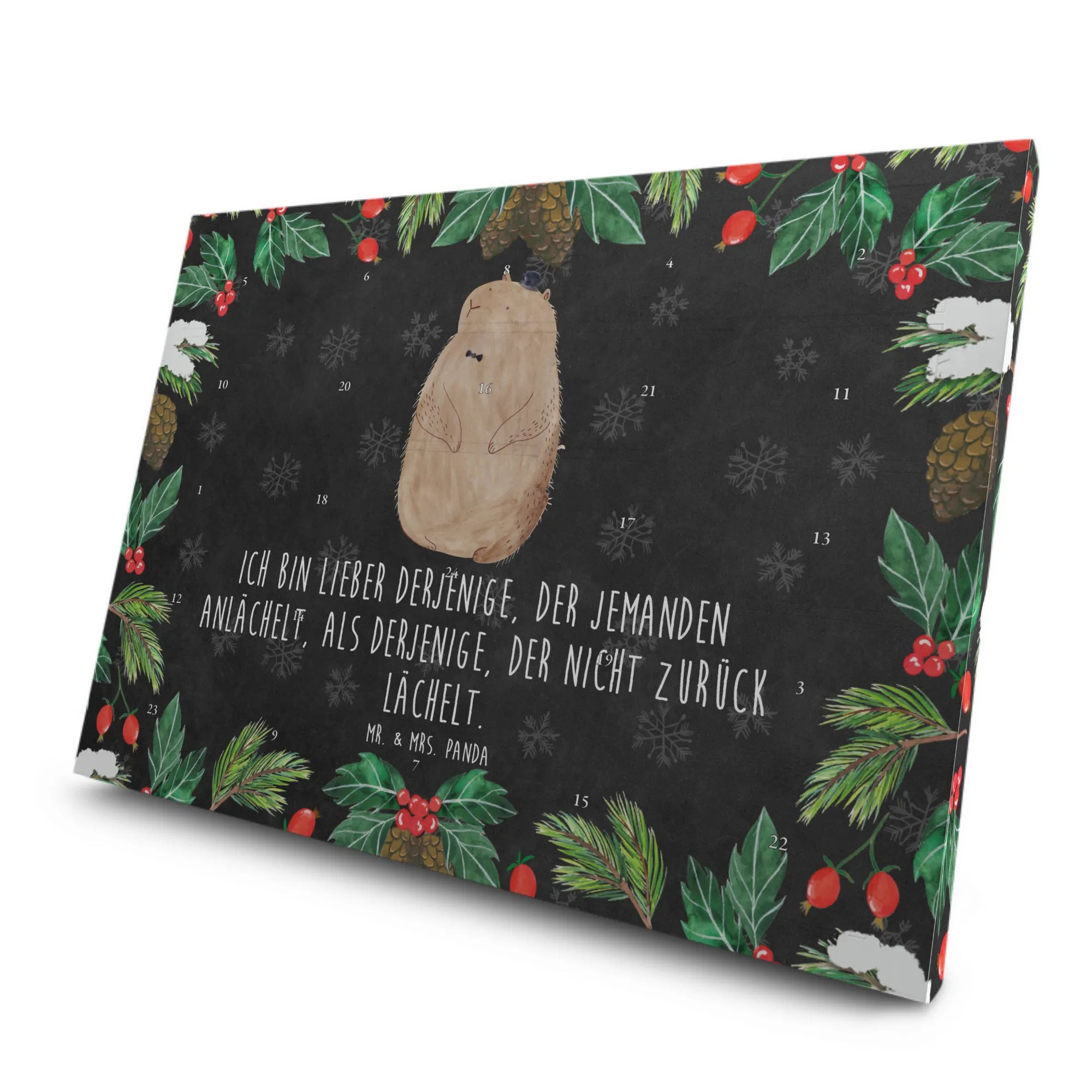 Entdecke den bezaubernden Tee Adventskalender mit dem süßen Murmeltier-Motiv von Mr. & Mrs. Panda! Dieser wunderschöne Adventskalender ist die perfekte Möglichkeit, die Vorweihnachtszeit zu genießen. Mit 24 einzeln verpackten Teesorten im Pyramidenbeutel bietet er eine abwechslungsreiche Auswahl an Früchte-, Schwarz- und Kräutertees, die sowohl für Teeliebhaber als auch für solche, die es noch werden wollen, geeignet sind. Die Vielzahl an Geschmäckern sorgt dafür, dass für jeden etwas dabei ist, und das in einer brillanten Druckqualität, die die schön gestalteten Tiermotive und Sprüche wunderbar zur Geltung bringt.