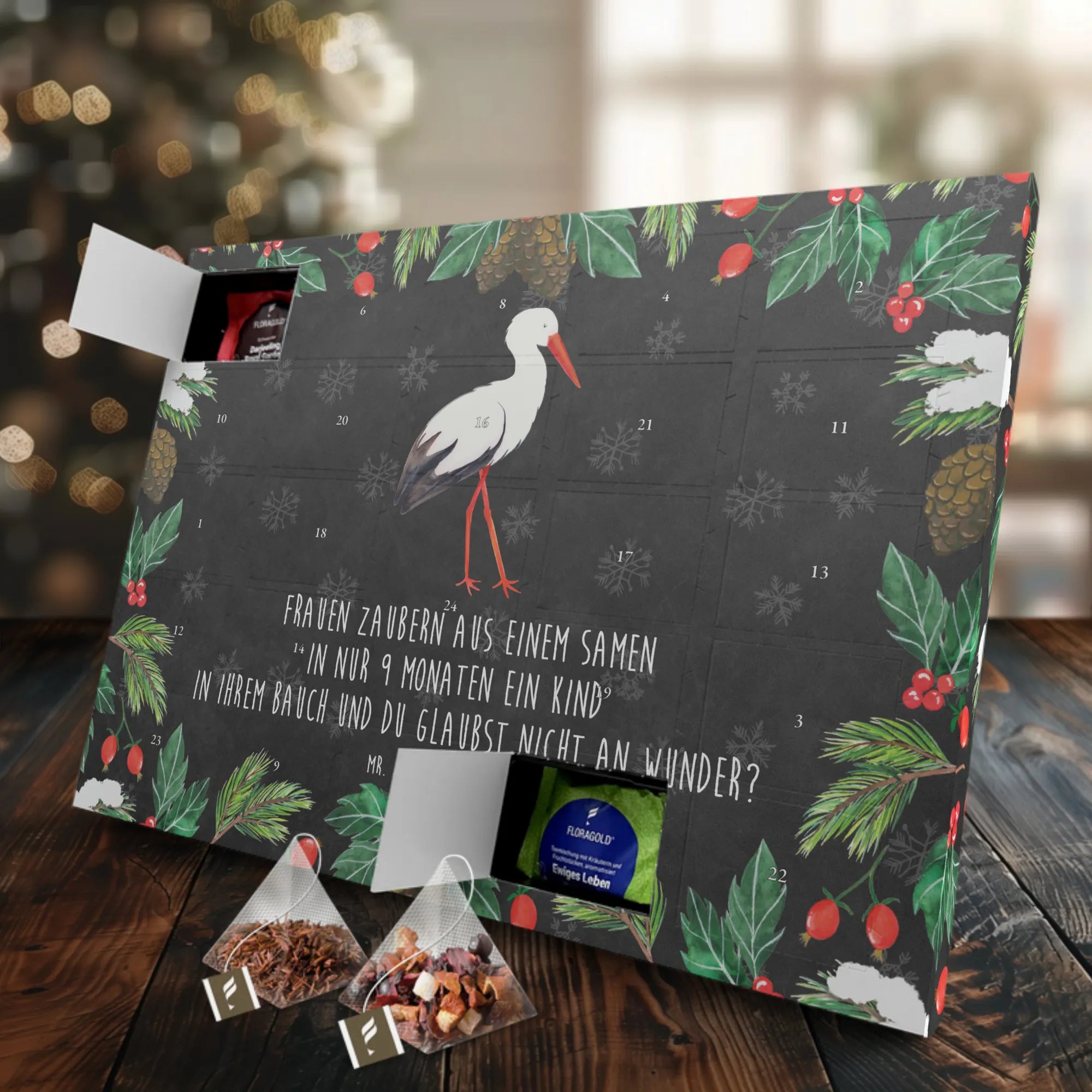 Der Tee Adventskalender Storch von Mr. & Mrs. Panda ist das perfekte Geschenk für werdende Mütter und alle, die die Vorfreude auf das neue Leben feiern möchten. Dieser Adventskalender ist nicht nur ein Hingucker mit seinem liebevoll gestalteten Motiv eines Storches, der ein Baby in einem Tuch trägt, sondern er bietet auch eine wunderbare Auswahl an 24 verschiedenen Teesorten im Pyramidenbeutel.