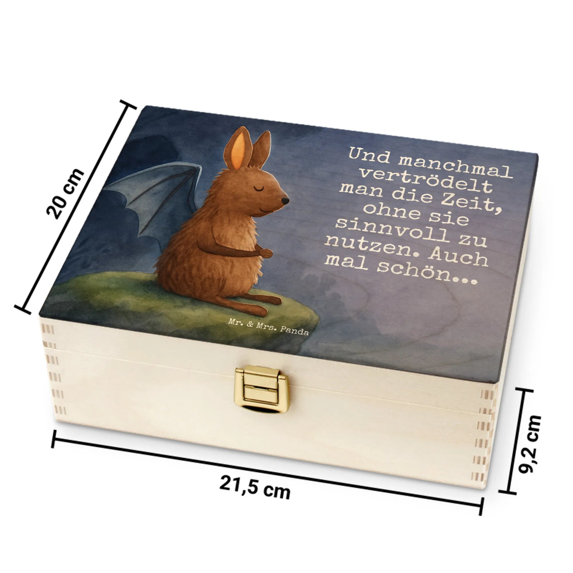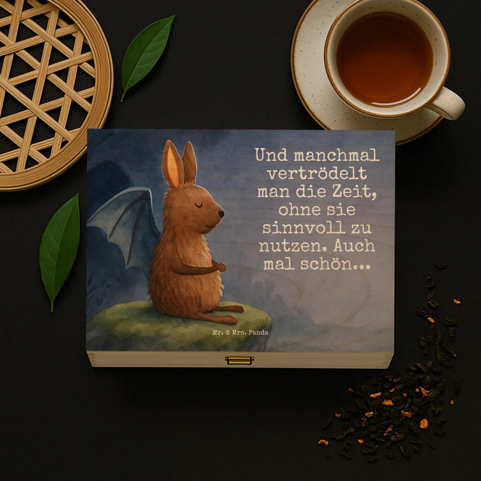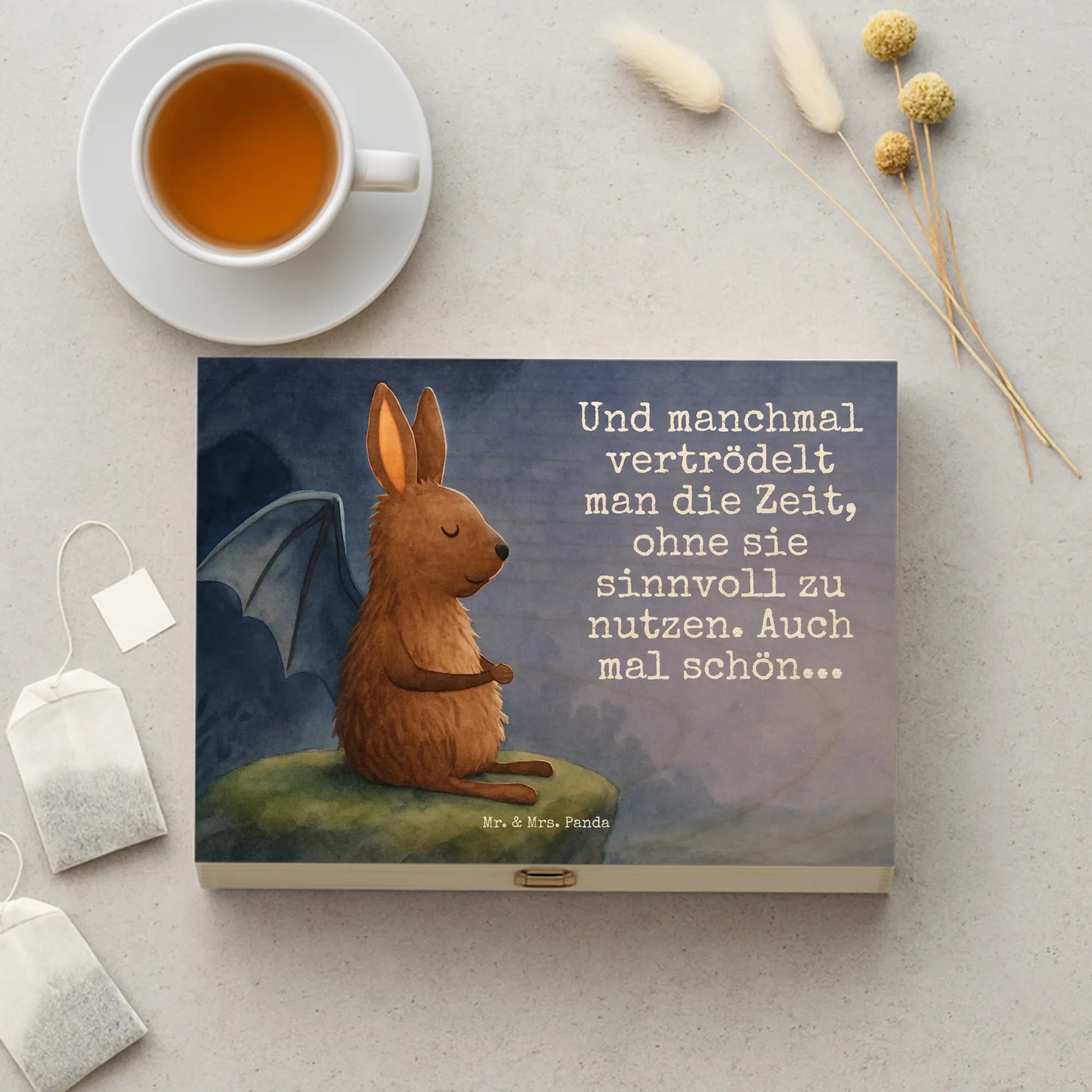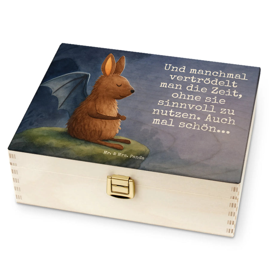 Vergiss die Hektik des Alltags und lass dich von unserer Fledermaus in eine Welt der Entspannung entführen. Dargestellt in einer Pose der Ruhe, erinnert uns dieses Motiv daran, wie wichtig es ist, auch mal innezuhalten. Der beigefügte Spruch „Und manchmal vertrödelt man die Zeit, ohne sie sinnvoll zu nutzen. Auch mal schön...“, unterstützt die Botschaft des Bildes auf wundervolle Weise. Er spricht von der Schönheit des Moments, in dem man sich erlaubt, einfach zu sein. Dieses Motiv von Mr. & Mrs. Panda lädt dich ein, dein Leben auch mal langsamer anzugehen und die kleinen Freuden zu genießen, die ein Moment der Ruhe birgt.