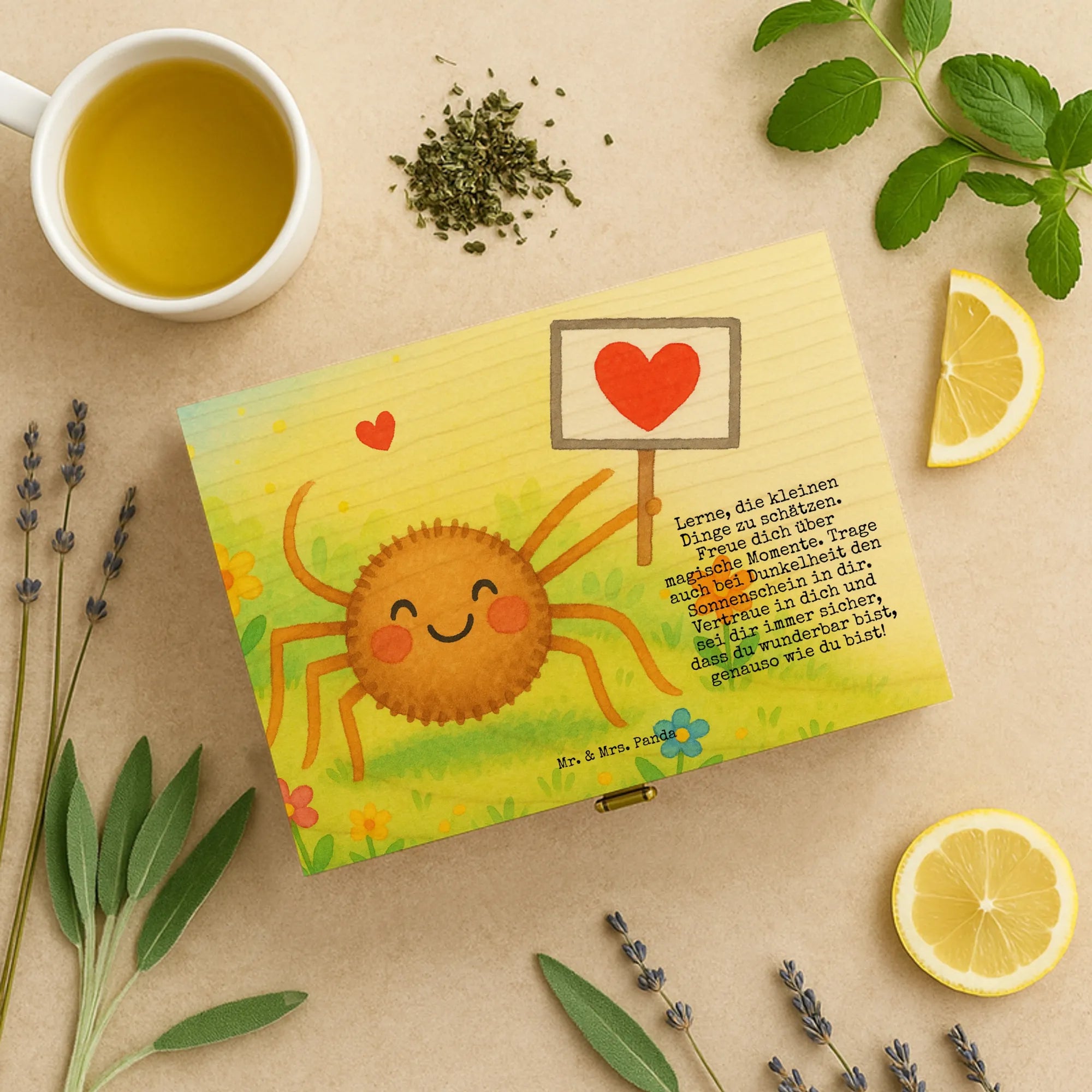Spinne Agathe bringt mit ihrem strahlenden Lächeln und dem herzlichen Schild die Botschaft, die kleinen Dinge im Leben zu schätzen. Diese süße Spinne symbolisiert Glück und Vertrauen. Über ihrem Kopf schwebt ein Herz, das die Kraft der Liebe verkörpert. 'Lerne, die kleinen Dinge zu schätzen. Freue dich über magische Momente. Trage auch bei Dunkelheit den Sonnenschein in dir. Vertraue in dich und sei dir immer sicher, dass du wunderbar bist, genauso wie du bist!' Mit dieser Motivation wird jeder Tag ein wenig heller.