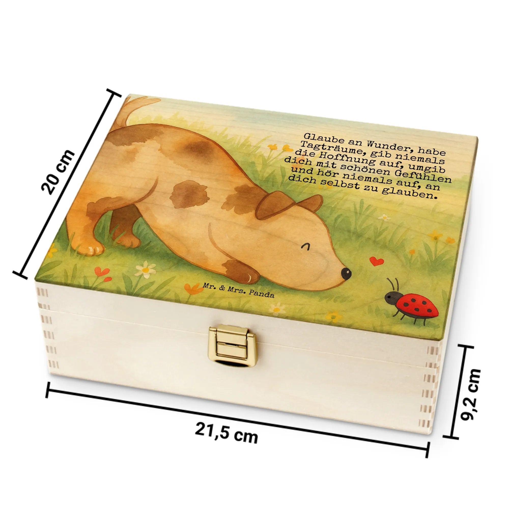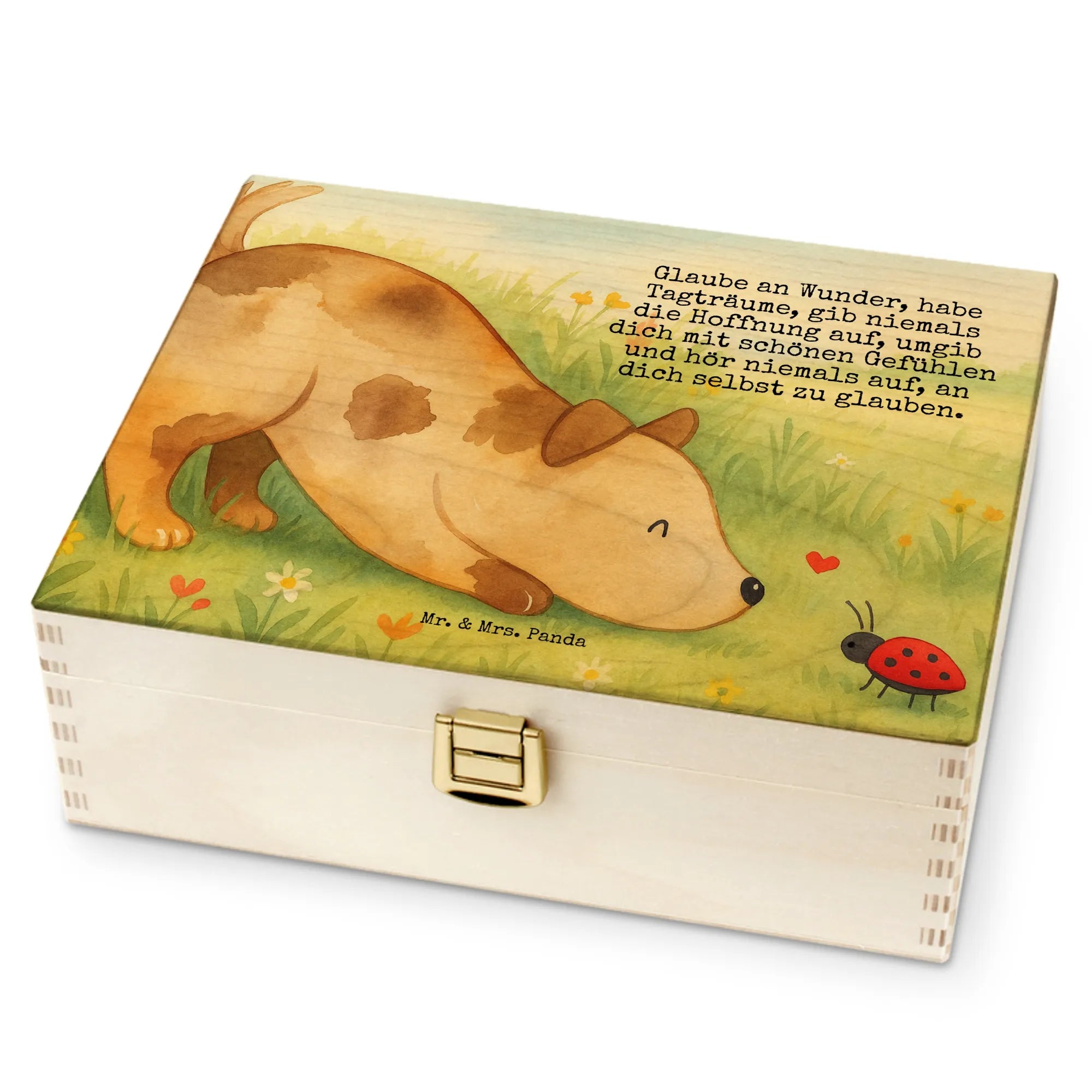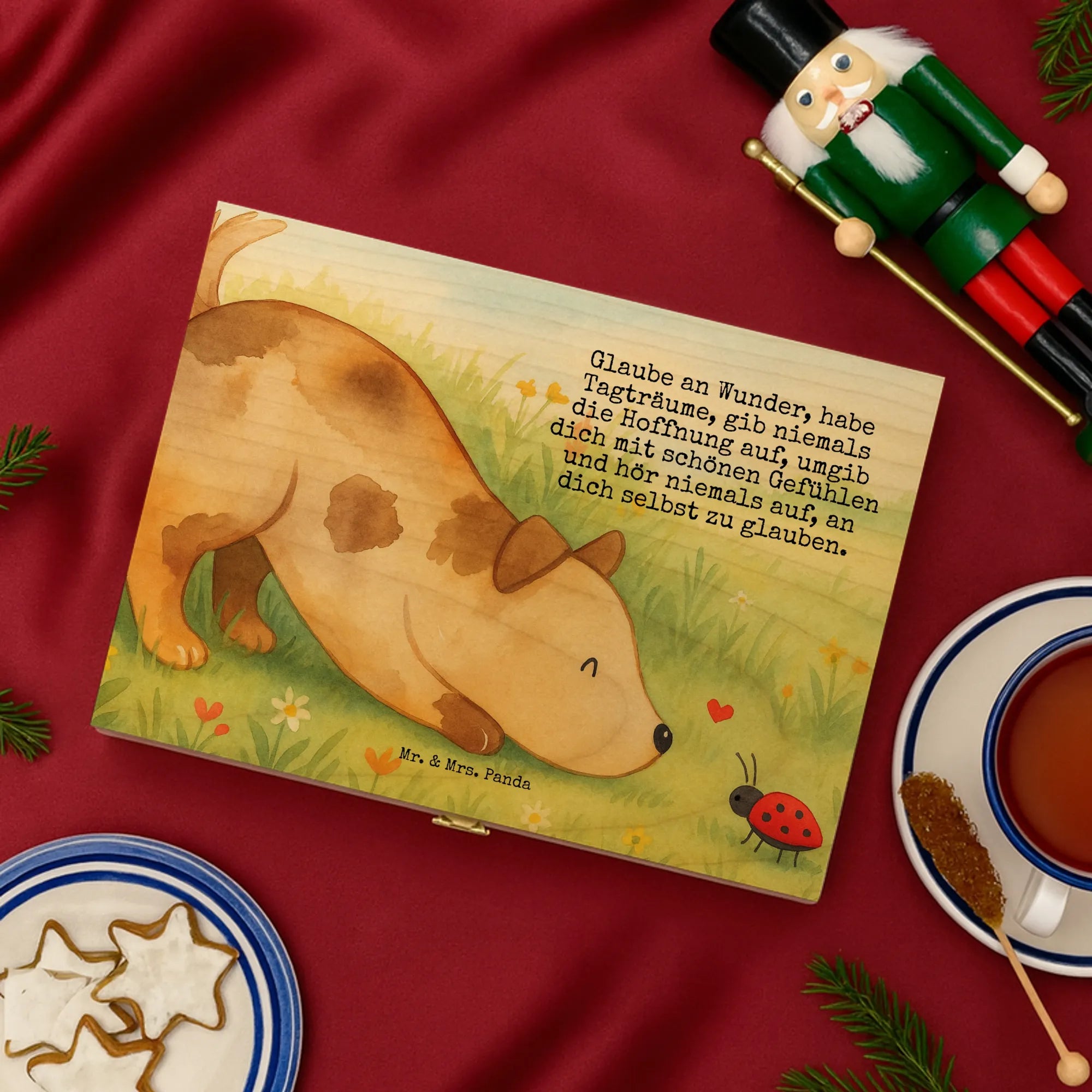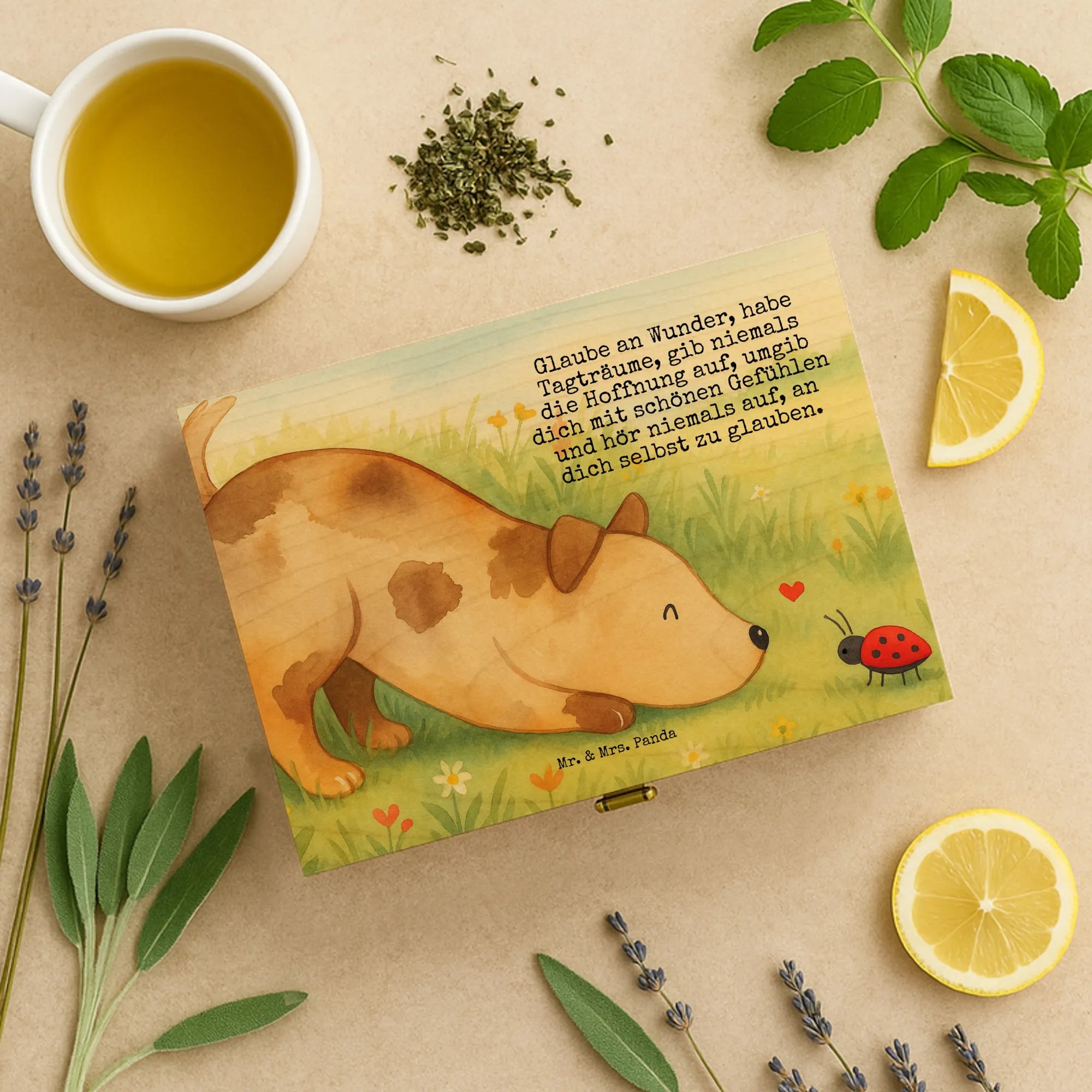 Stell dir vor, ein aufgeweckter Mischlingshund sitzt ganz gebannt vor einem kleinen, roten Marienkäfer. Diese harmonische Szene wird von der wunderschönen Botschaft begleitet: "Glaube an Wunder, habe Tagträume, gib niemals die Hoffnung auf, umgib dich mit schönen Gefühlen und hör niemals auf, an dich selbst zu glauben." Der Hund, der voller Freude ist, fängt die Essenz der Unschuld und des Staunens ein, lässt uns sagen: "Alles ist möglich", wenn wir nur bereit sind, die Wunder um uns herum zu sehen. Dieser Spruch inspiriert uns dazu, Träume zu haben und immer an uns selbst zu glauben - egal wie herausfordernd der Tag erscheint! Diese kleine Illustration ist bei Mr. & Mrs. Panda nicht nur ein schöner Anblick, sondern auch eine Motivationsquelle und erinnert uns daran, nie den Glauben an die Magie des Lebens zu verlieren.