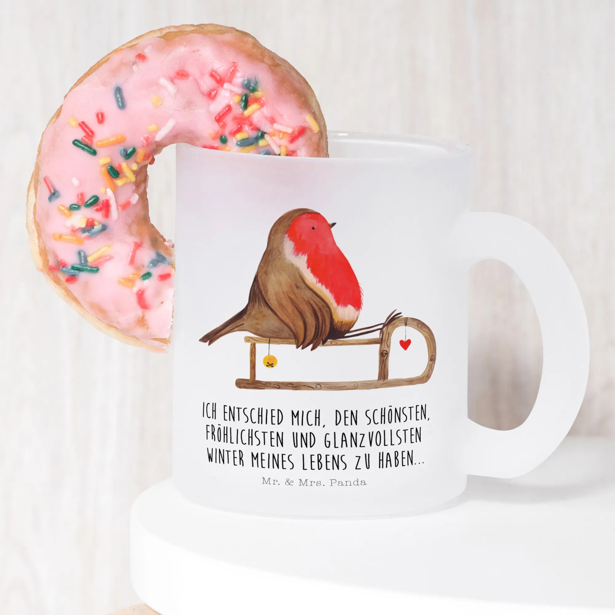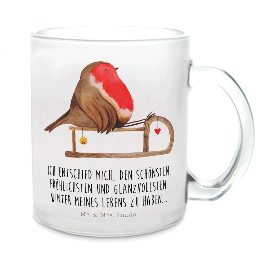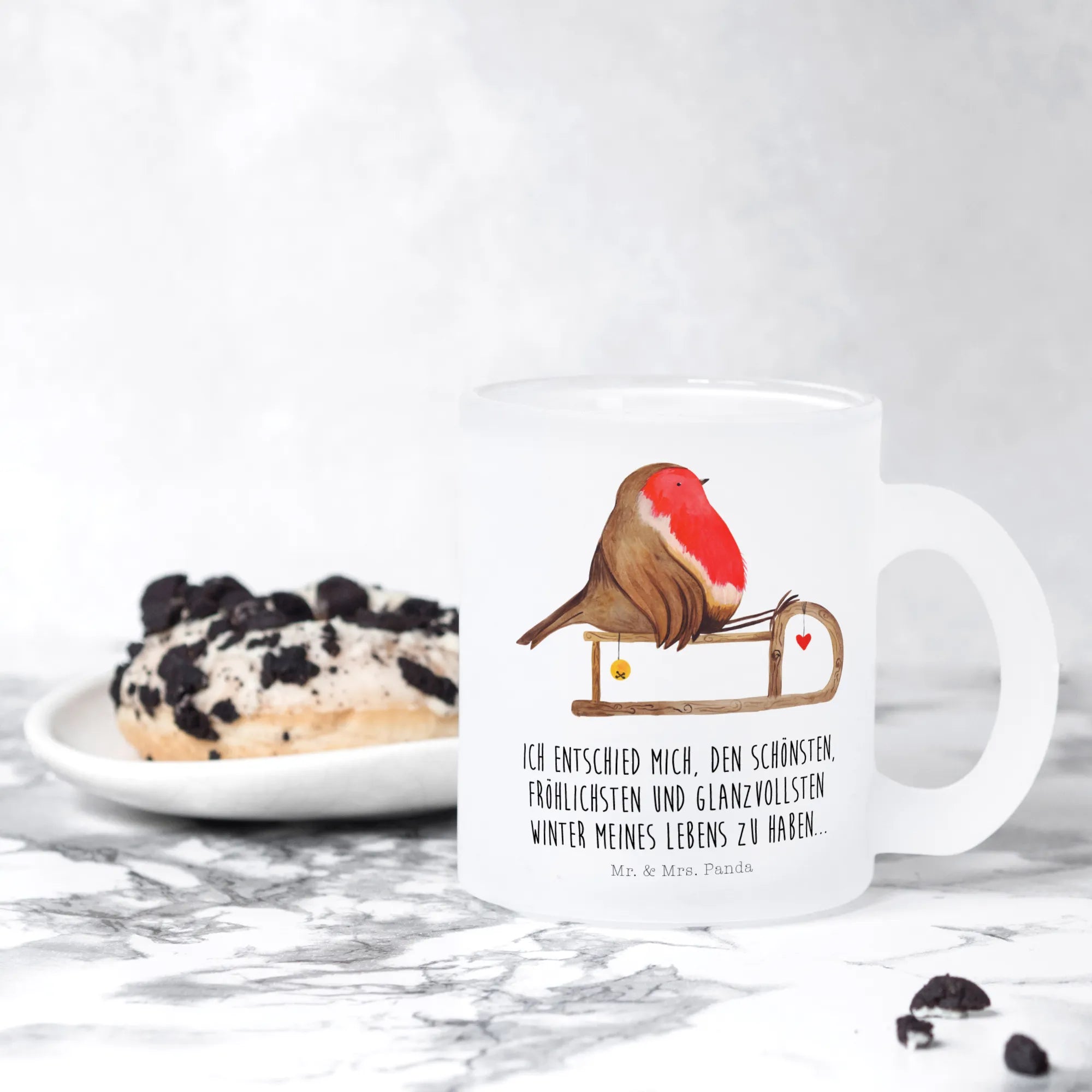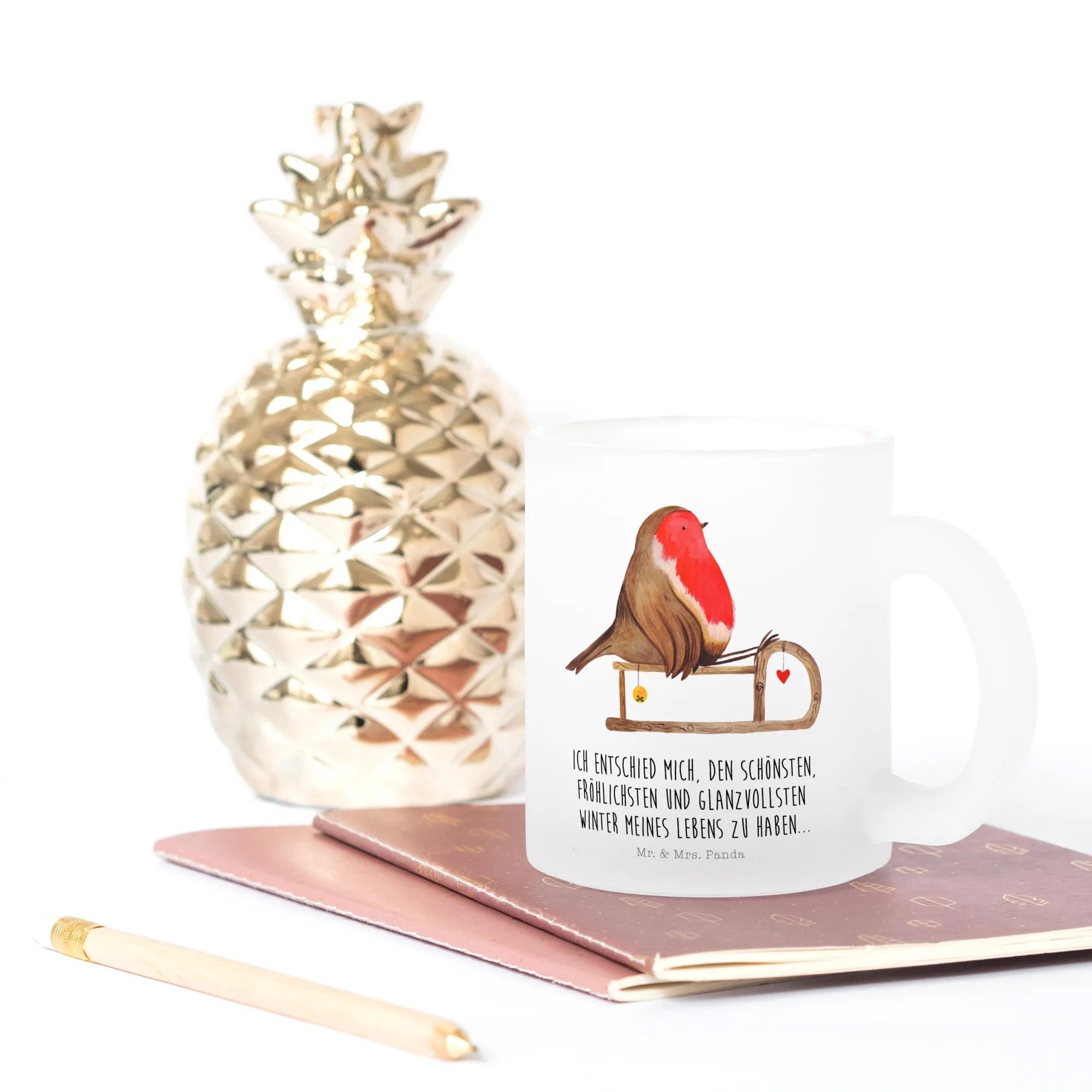 Das Motiv, liebevoll von Mrs. Panda kreiert, bringt die Stimmung der kalten Jahreszeit in dein Zuhause. Egal, ob du Tee, Glühwein oder Kaffee genießt, diese edle Teetasse aus robustem, extra starkem Premiumglas mit kratzfestem und hitzebeständigem Aufdruck ist ideal für all deine Heißgetränke.