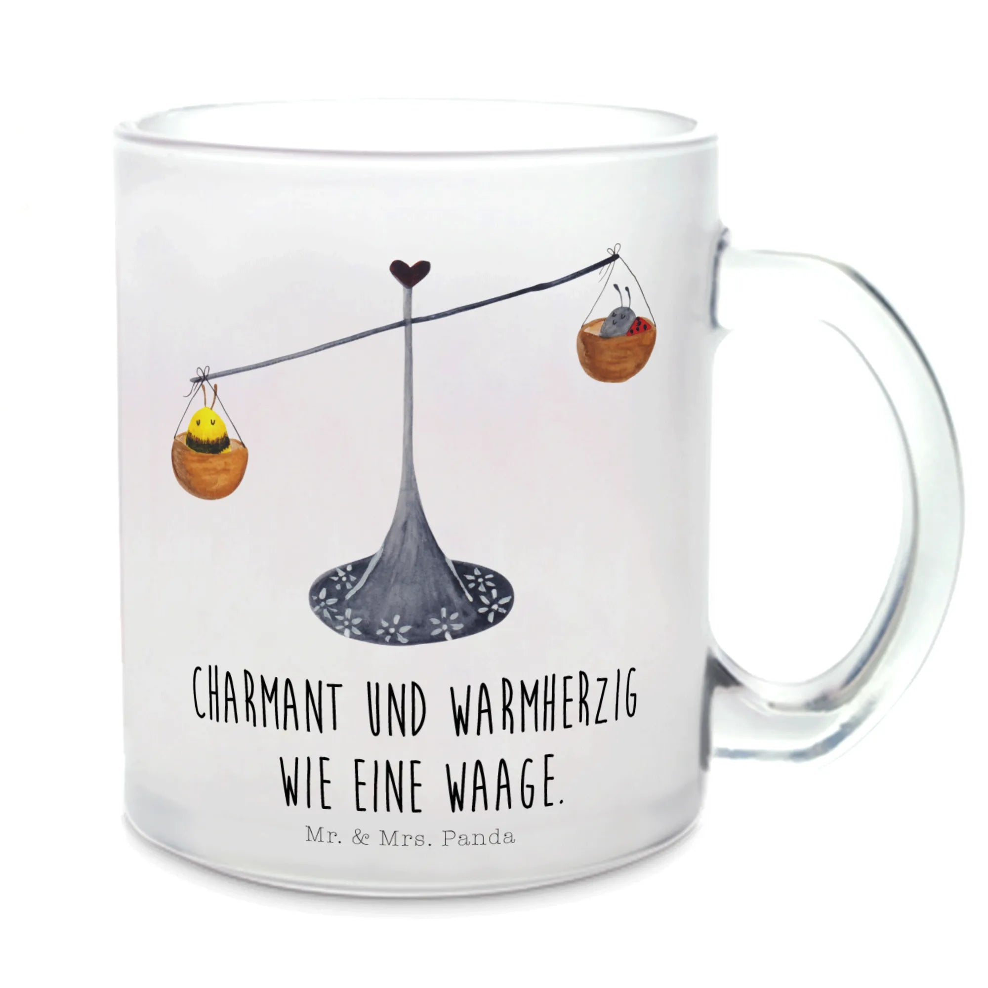 Der niedliche Druck zeigt eine klassische Waage, die sowohl einen Marienkäfer als auch eine Hummel hält – beide perfekt im Gleichgewicht. Dies spiegelt nicht nur das Sternzeichen Waage wider, bekannt für seine Balance und seinen Wunsch nach Harmonie, sondern auch das liebevolle Design von Mr. & Mrs. Panda.