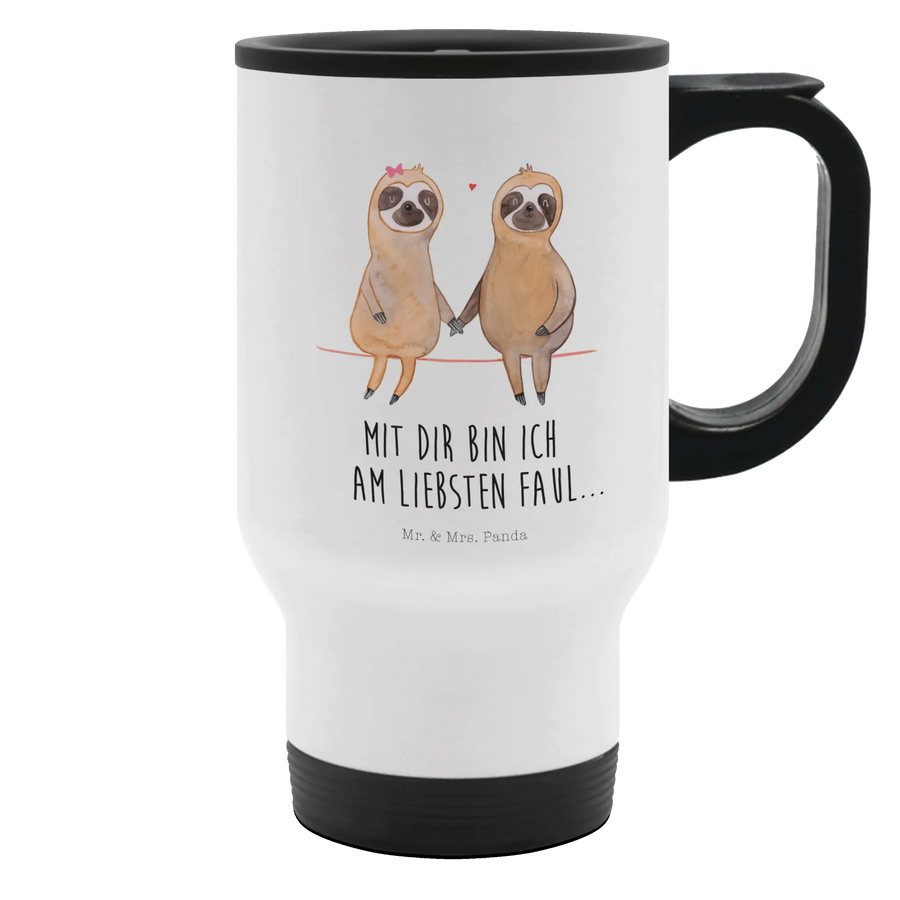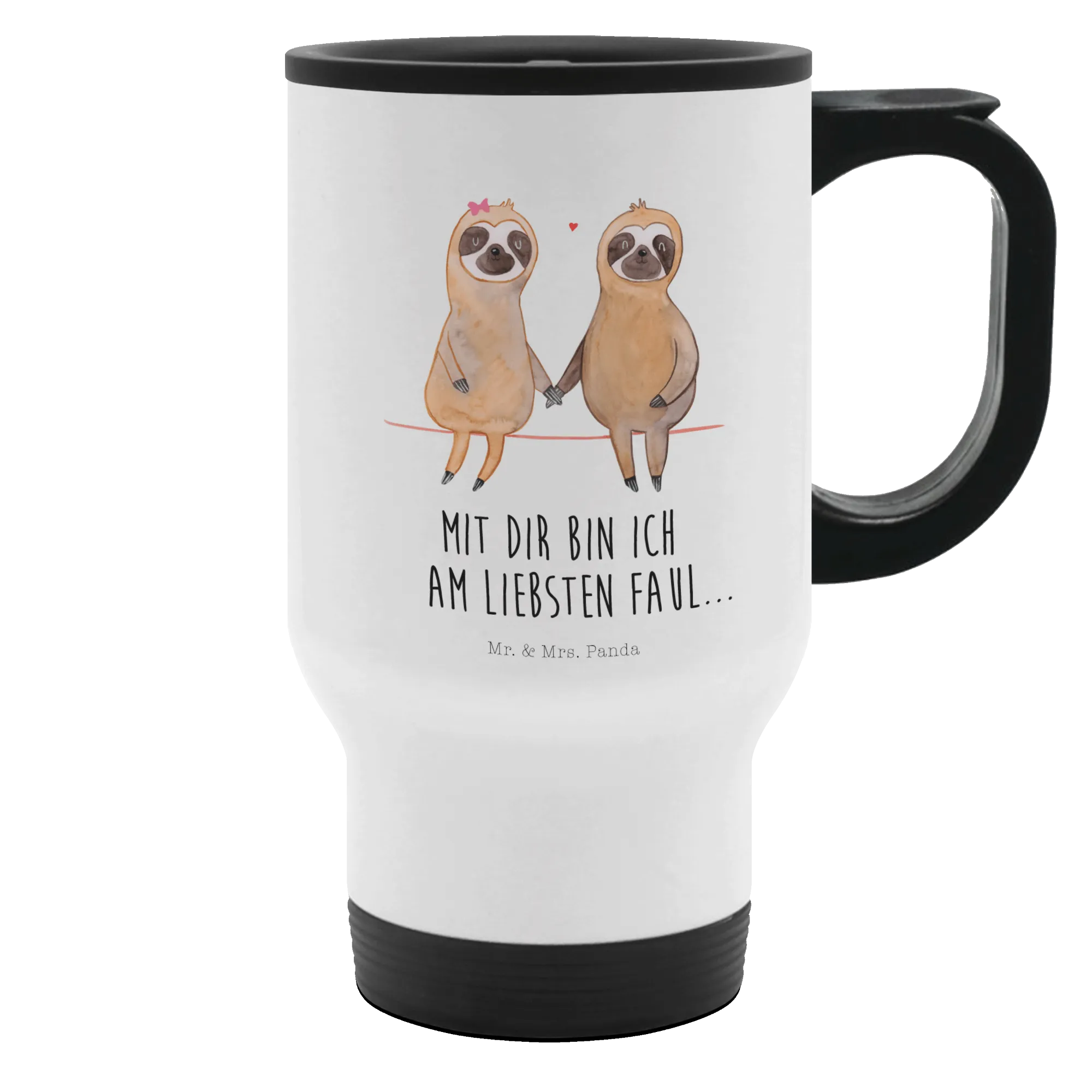 Ein praktischer und einzigartiger Thermobecher von Mr. & Mrs. Panda, der ideal für alle Faultierliebhaber ist! Mit einer Füllmenge von 390 ml und einem handgezeichneten Motiv eines süßen Faultierpärchens, das an den Händen hält, ist dieser Thermobecher nicht nur schön, sondern auch besonders funktional.