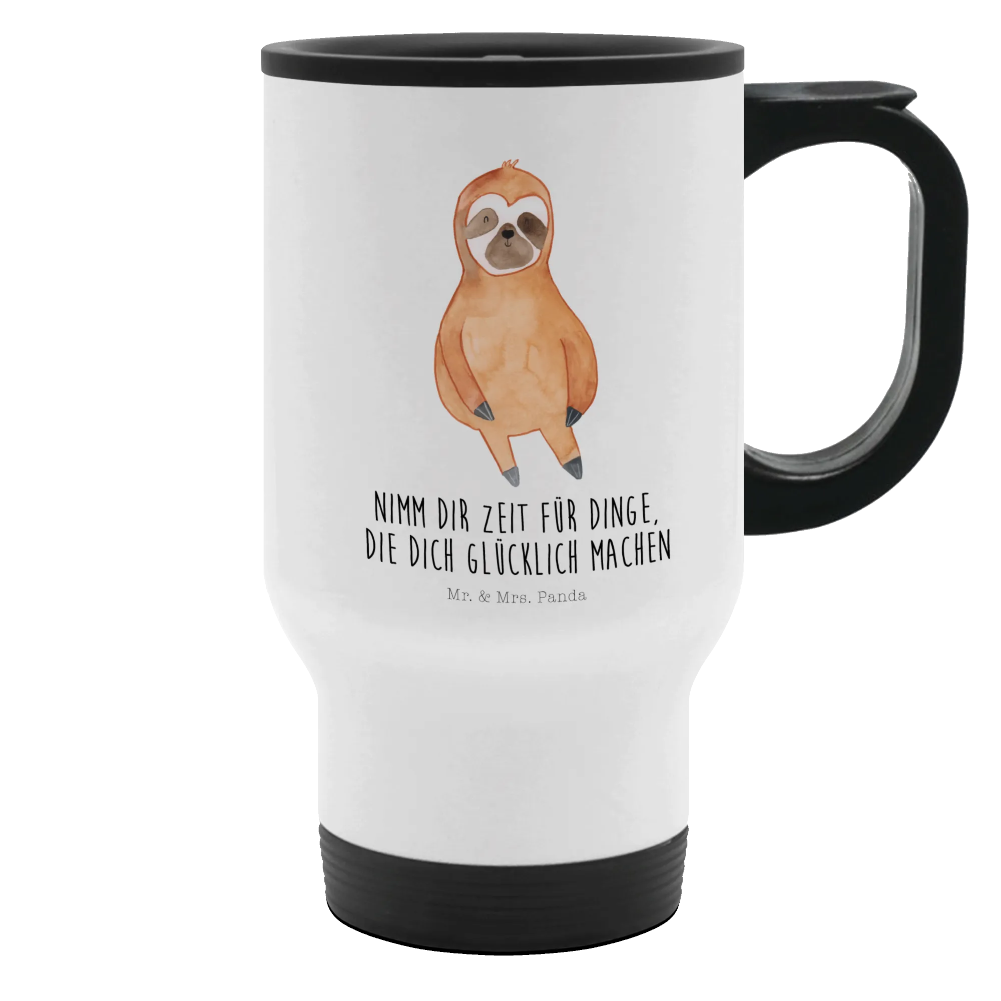 Mit einem Volumen von 390 ml passt er optimal in gängige Getränkehalter, so dass du ihn leicht im Auto oder beim Spaziergang mitnehmen kannst. Das liebevoll gestaltete Faultier-Motiv bringt dich zum Schmunzeln und erinnert dich daran, dir Zeit für die Dinge zu nehmen, die dich glücklich machen: 'Nimm dir Zeit für Dinge, die dich glücklich machen.' Dieses handgezeichnete Kunstwerk von Mrs. Panda zeigt ein entspannendes, faule Faultier, das zufrieden und gelassen die Welt beobachtet.