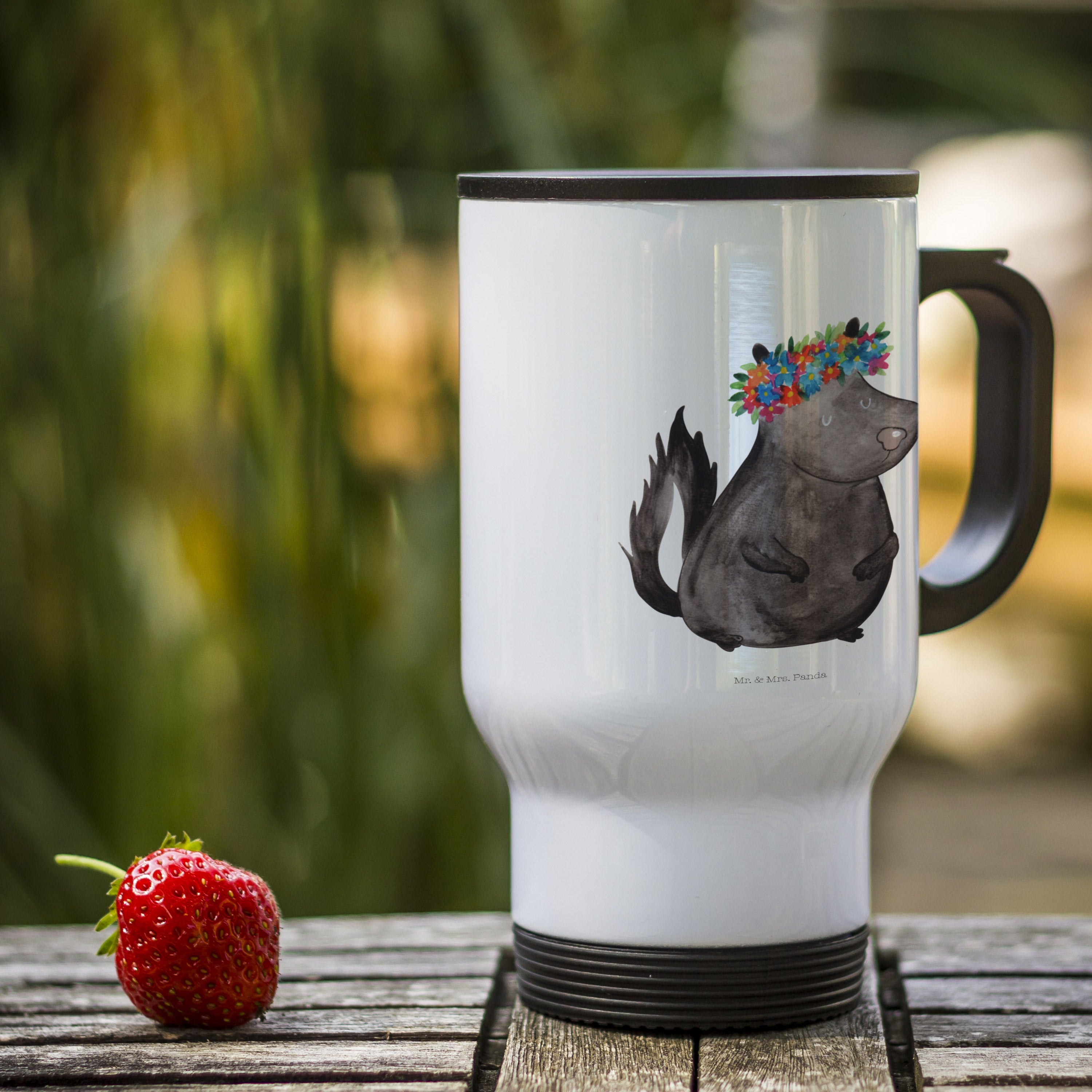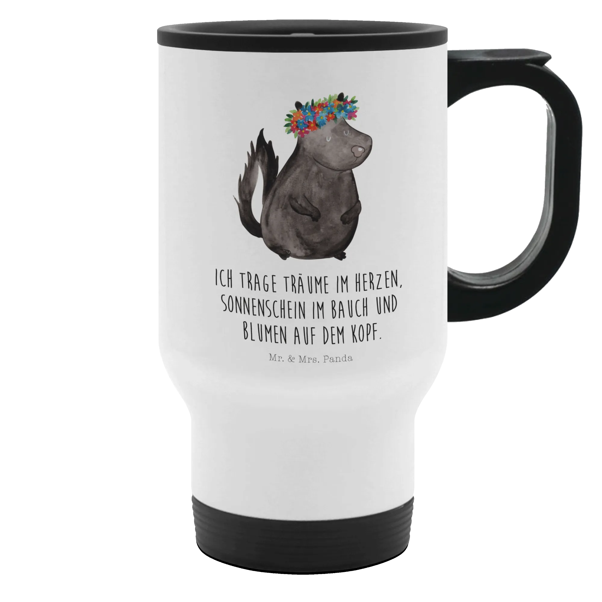 Du liebst es, deine heißen Getränke überallhin mitzunehmen? Unser Thermobecher Stinktier Blumenmädchen aus der zauberhaften Stinktier-Kollektion ist genau das, was du brauchst! Mit einem charmanten Aquarell-Motiv eines süßen Stinktiers, das einen bunten Blumenkranz trägt, bringt dieser Becher Freude und Lebensfreude in deinen Alltag. Egal, ob du deinen Kaffee, Tee oder eine heiße Schokolade mit auf die Arbeit, in die Uni oder zum Yoga nehmen möchtest - dieser Edelstahlthermobecher hält deine Getränke lange warm und sorgt dafür, dass sie immer frisch schmecken.