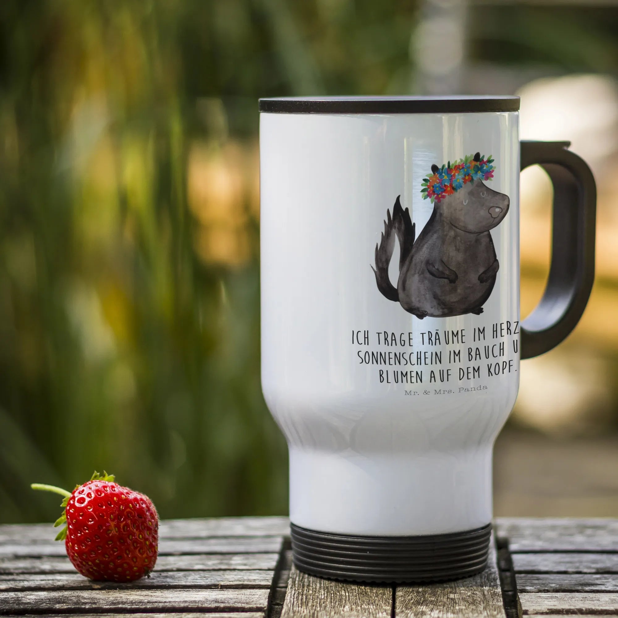 Es gibt nichts Schöneres, als die Natur in voller Pracht zu genießen. Mit der Thermobecher Stinktier Blumenmädchen Kollektion von Mr. & Mrs. Panda bist du bestens ausgestattet, um all deine kulinarischen Abenteuer zu erleben und gleichzeitig die Schönheit der Natur zu feiern. Also, greif dir deinen neuen Lieblingsbecher und erlebe, wie schön die Welt sein kann! Der Spruch "Ich trage Träume im Herzen, Sonnenschein im Bauch und Blumen auf dem Kopf" ist eine ständige Erinnerung daran, das Leben positiv zu sehen und die kleinen Dinge im Leben zu schätzen. Hol dir jetzt deinen Thermobecher und lass die guten Zeiten beginnen!
