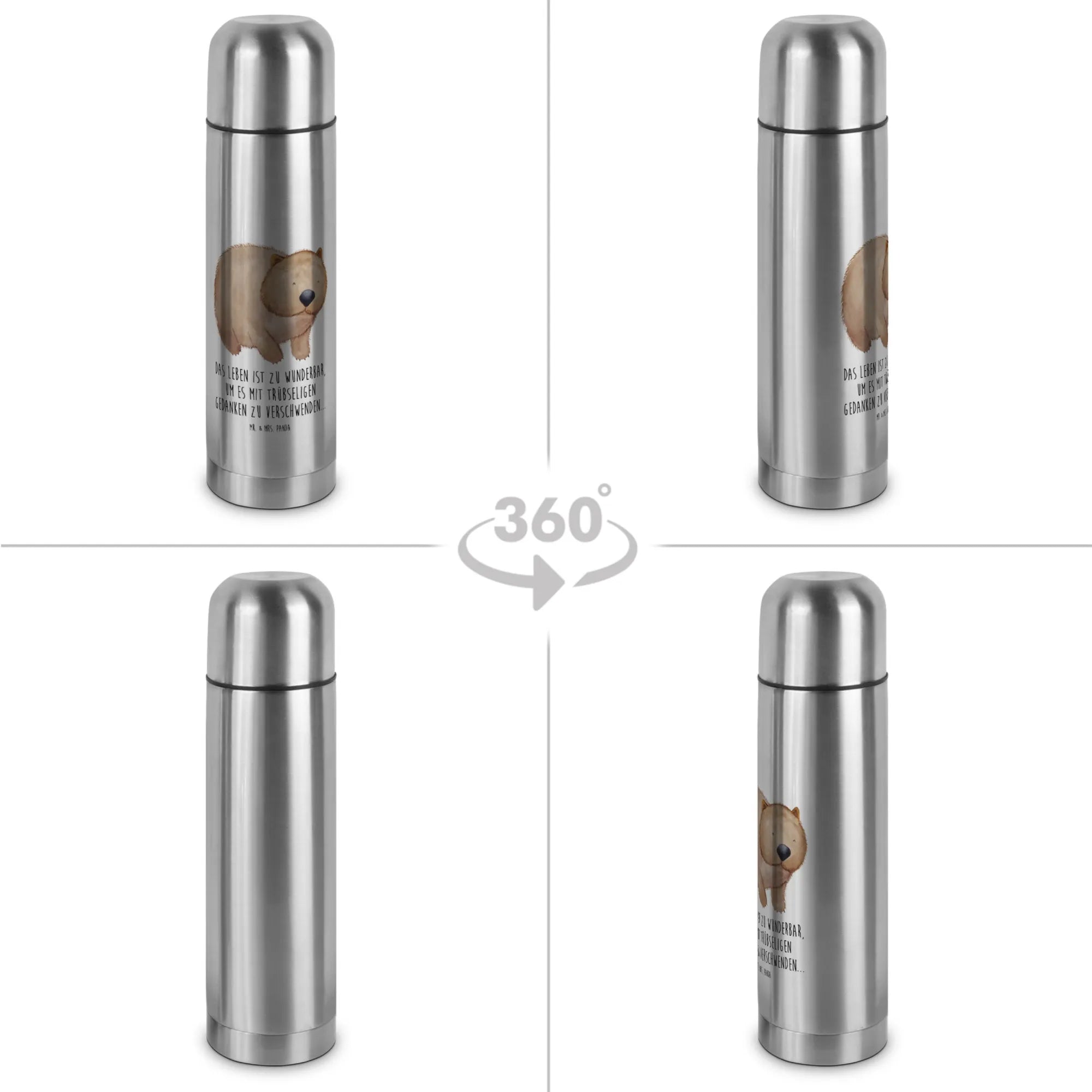 Hergestellt aus robustem Edelstahl und in brillanter Druckqualität auf silbernem Untergrund, ist diese Thermoskanne kratzfest und pflegeleicht. Sie bleibt über 24 Stunden heiß, sodass du deinen Lieblingsdrink jederzeit genießen kannst. Die warmen Farben und sanften Linien des Wombats zaubern dir stets ein Lächeln ins Gesicht und erinnern dich daran, dass das Leben schön ist – ganz nach dem Spruch: "Das Leben ist zu wunderbar, um es mit trübseligen Gedanken zu verschwenden...".